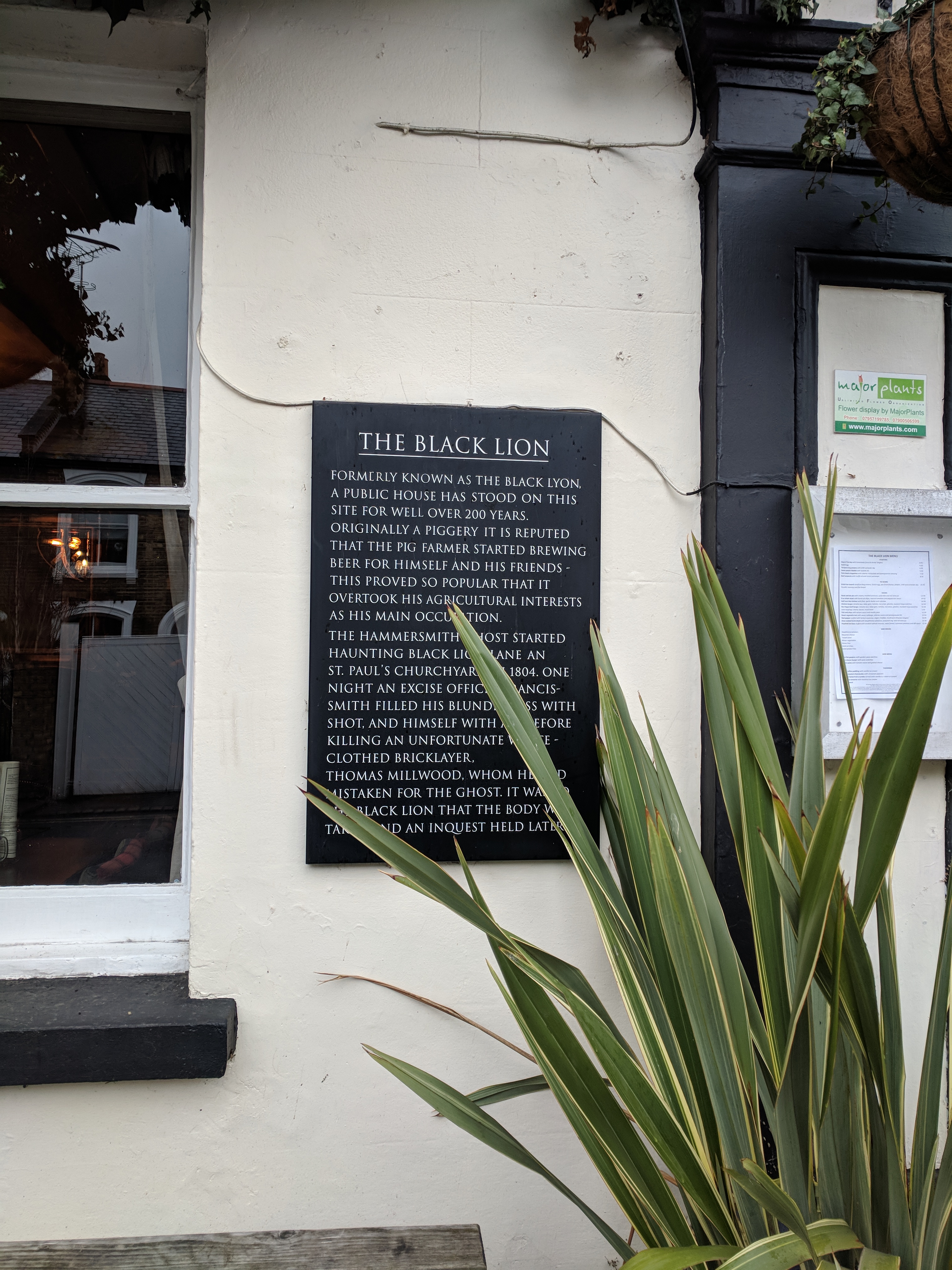 There’s a sign to a pub saying “open fire” which seems unncessarily ambiguous. Bypassing that we approach a different pub called the Black Lion, on the wall of which is a sign explaining that it was formerly known as the Black Lion. Um.