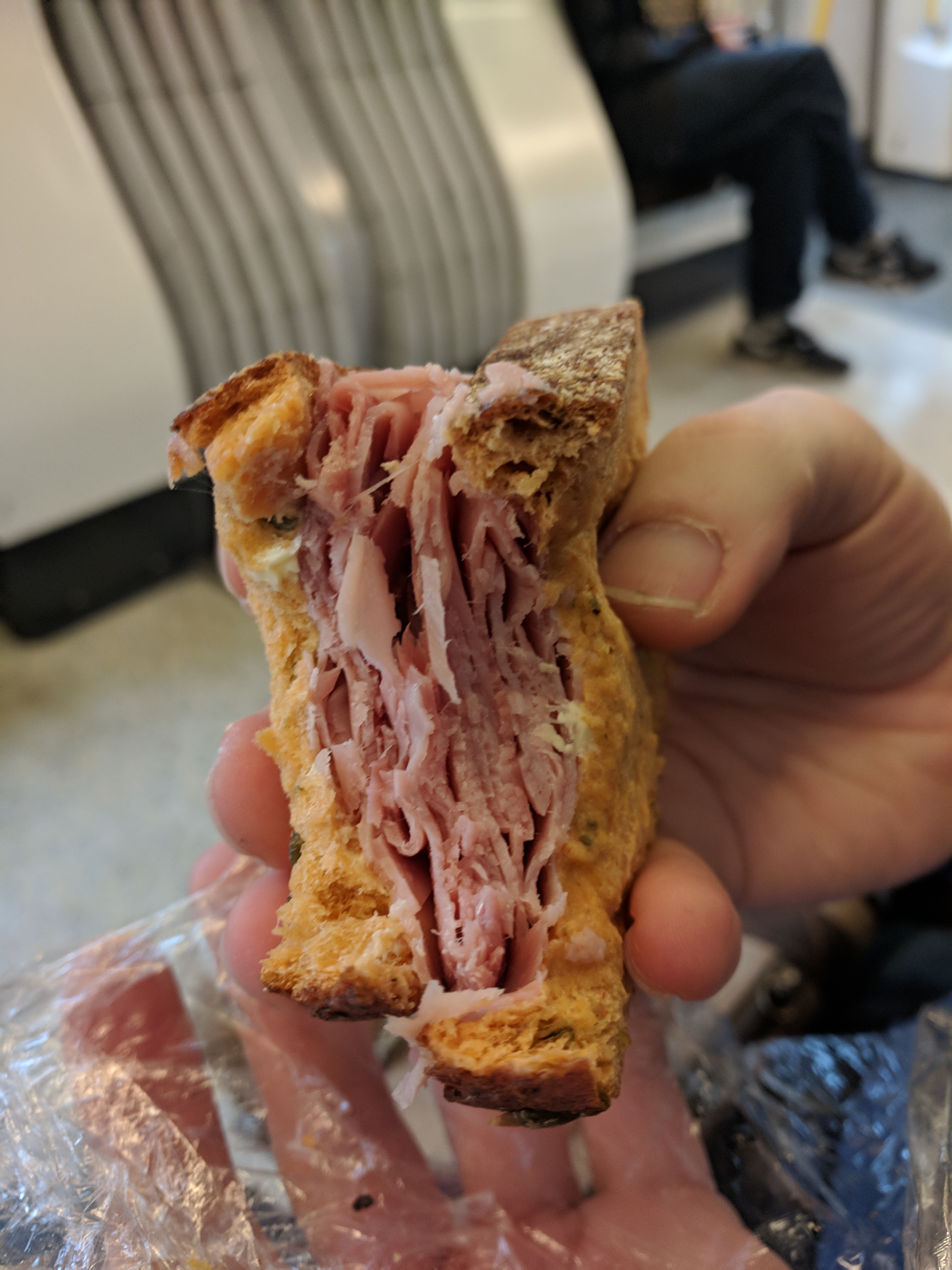 Bravo! And in fact double bravo, because despite the merely sandwich shaped nature of this sandwich they taste bloody wonderful. Helps that (a) there’s so much ham (b) the bread is fancy jalapeño and cheese bread. Lovely, and a good start to our three-legged journey. At Wimbledon we change onto a district line train to Earl’s Court, the early part of which is taken up by Helen playing with some new AR features on her phone that enable her to video me eating and superimpose a penguin onto the floor, staring at me.