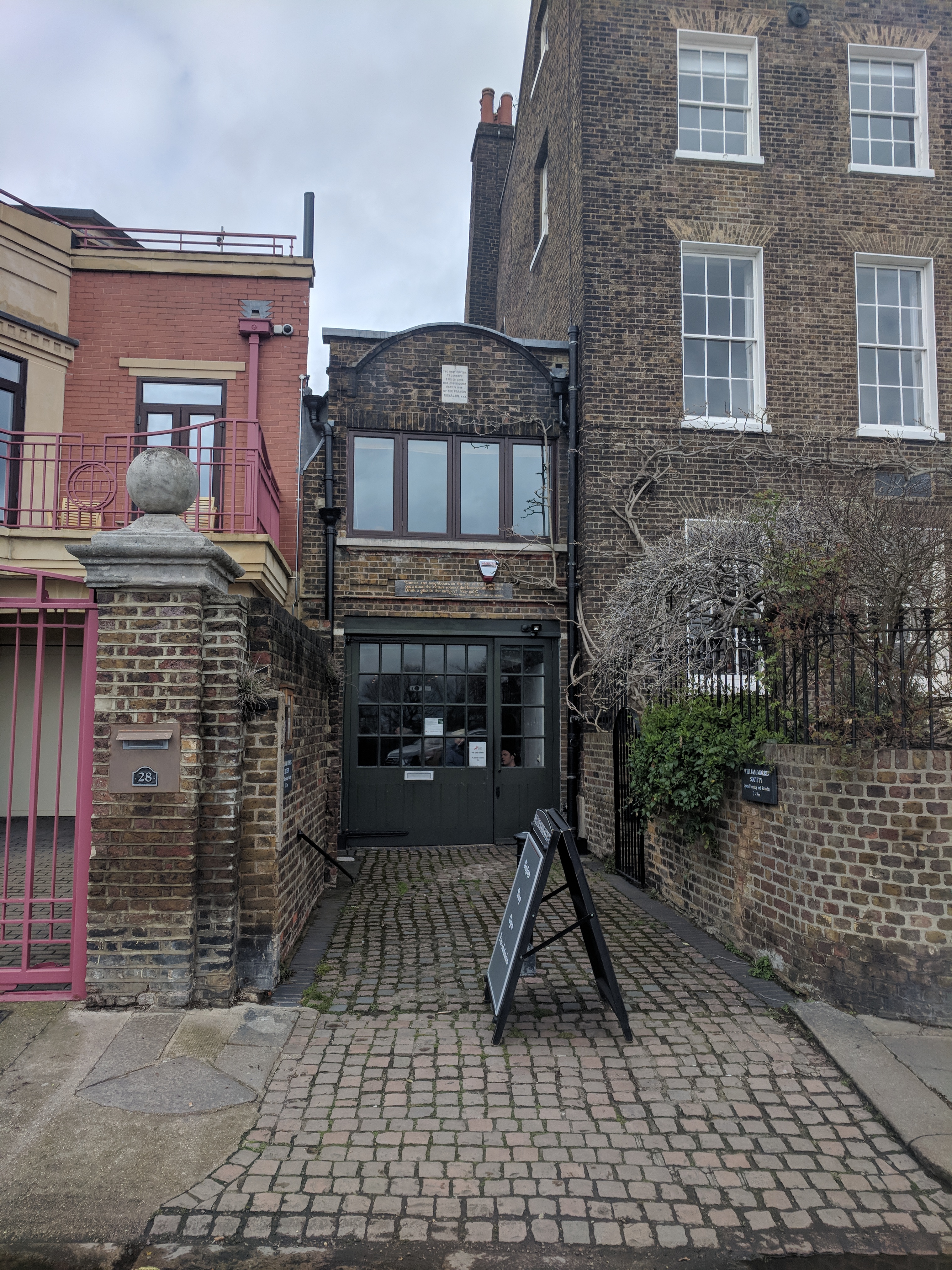 Hammersmith Terrace is next, our first proper stop. It’s about 1255 and we’ve got tickets for a thing starting at 1300, so there’s just enough time for me to accuse this street of taking the piss. There are three blue plaques within 14 buildings, and the numbers on the doors above 8 are in Roman numerals. I mean come on.