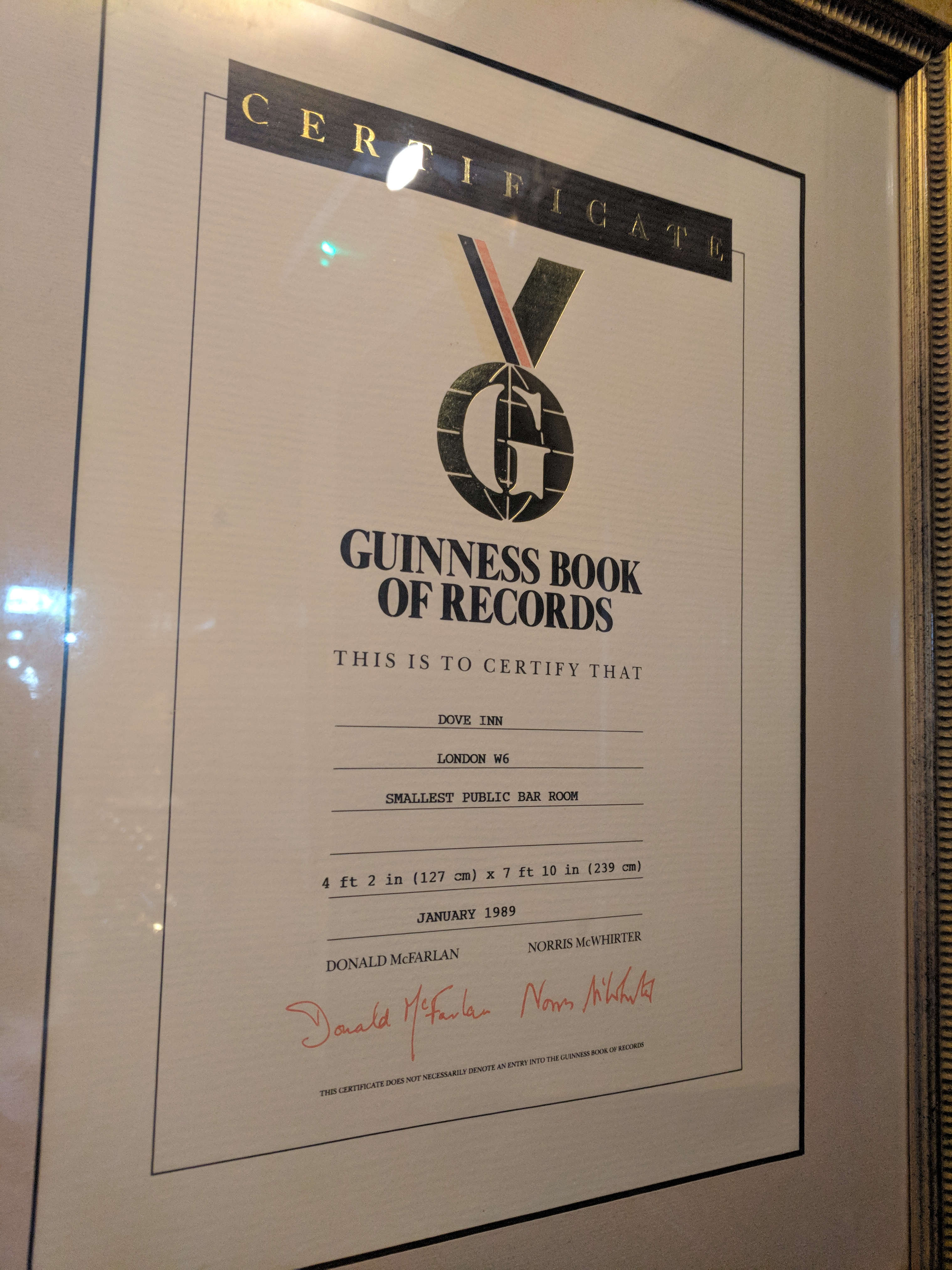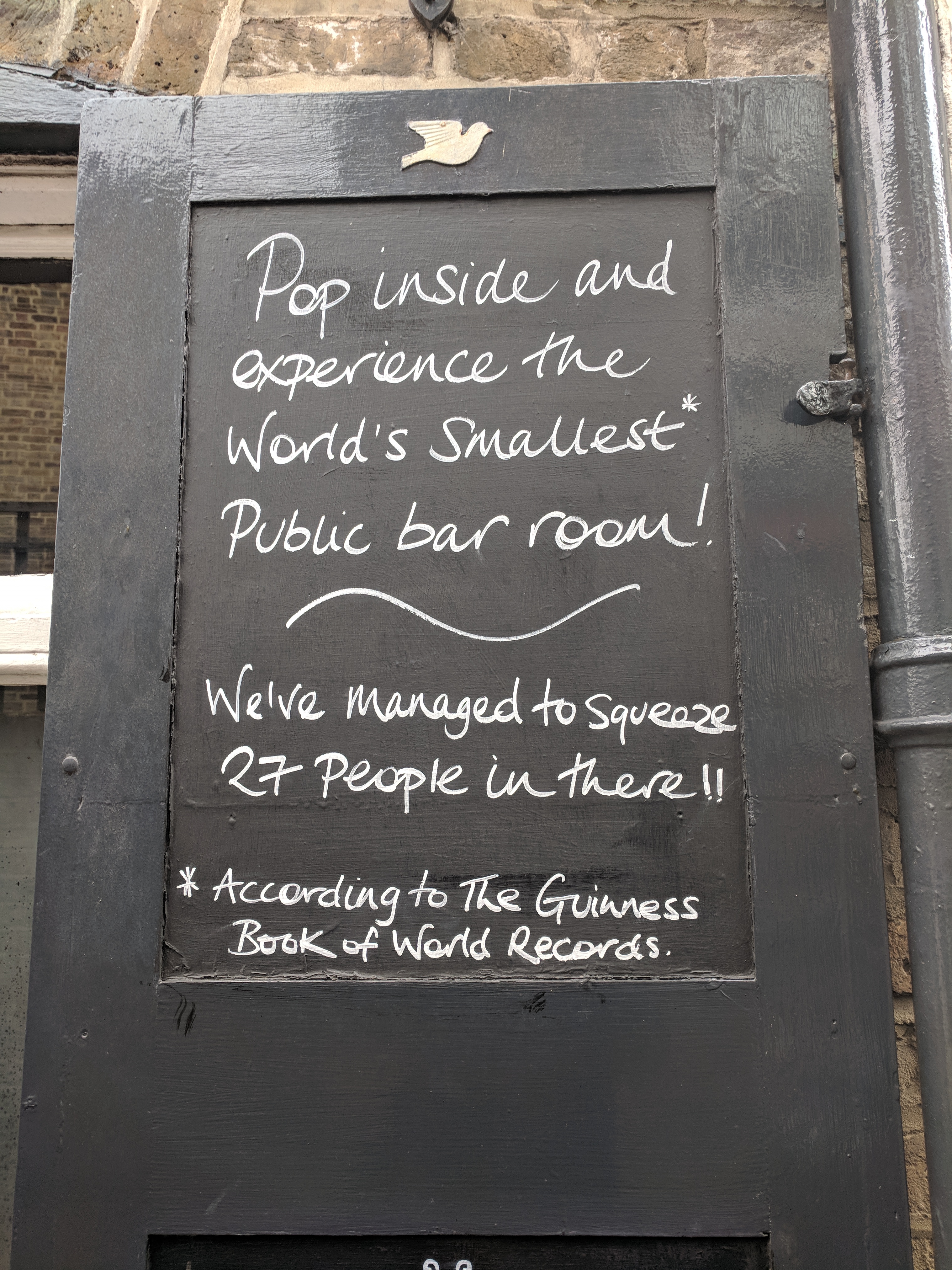 All this art and craft is thirsty work, so after buying a tea towel that would not make the designer spin in his grave we pop to the Dove. This happens to be a world record holding pub, having as it does the officially “smallest public bar room”. As luck would have it there’s no-one there when we arrive, so we get it to ourselves.