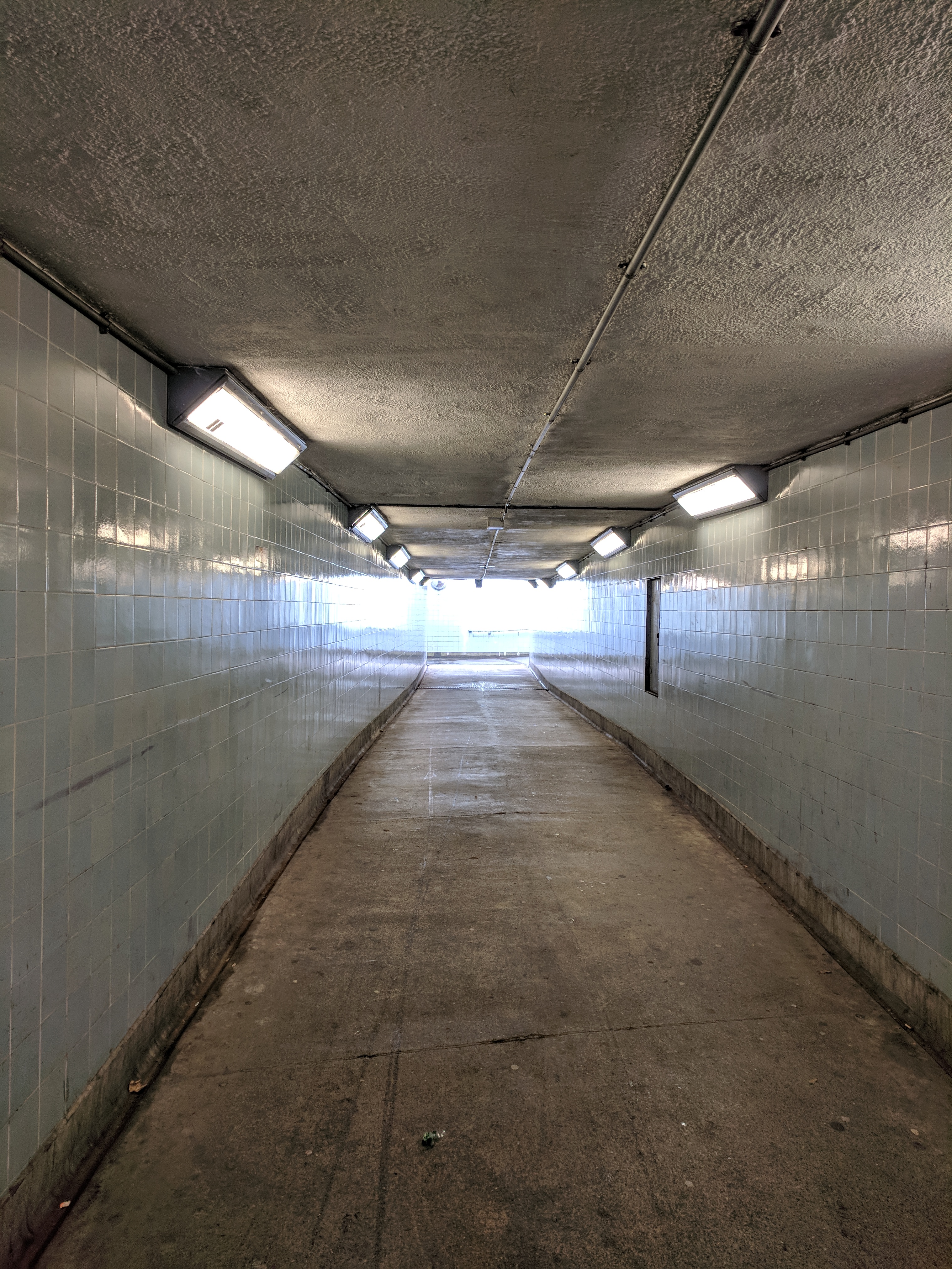 If anything the property gets bigger just before we reach the noisy main road, under which we must walk via a subway with an excellently defaced signpost, and one which doesn’t look or smell like piss whatsoever. I had very little idea such underpasses existed.
