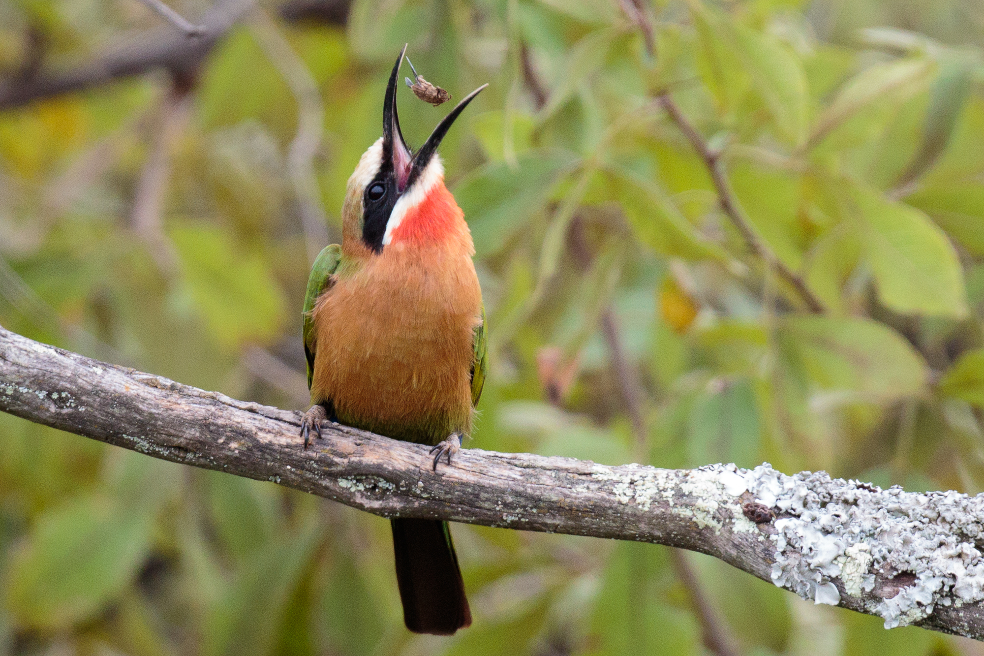 The road leading past Finfoot hide westwards is a prime location for catching hawking White-fronted Bee-eaters in flight and eating. Look out for them on exposed branches along the banks of the stream. They often return to the same spot after hunting, so it's possible to set yourself up near a perch and catch excellent bird-in-flight shots.