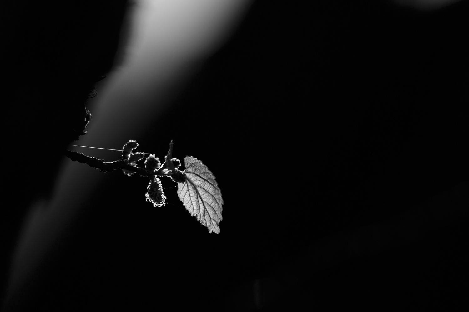 A stray ray of sunlight highlights a weed growing in a frozen and fire blackened tree trunk.