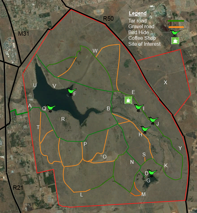 The entrance gate for the reserve is off the Olifantsfontein Road (Goedehoop, M57) S 25° 52' 58.655" E 28° 15' 47.455"