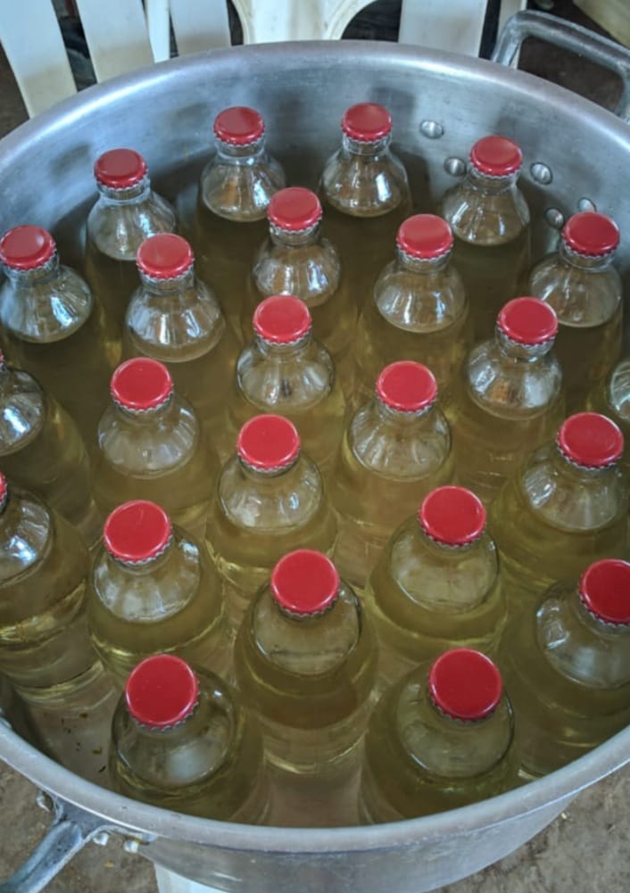 O que sobra é um suco clarificado, que é envazado em garrafas de vidro e levado a cozimento em banho-maria. E é dessa última etapa que vem a cor amarelo-dourada da bebida, quando seus açúcares caramelizam com o calor do fogo.