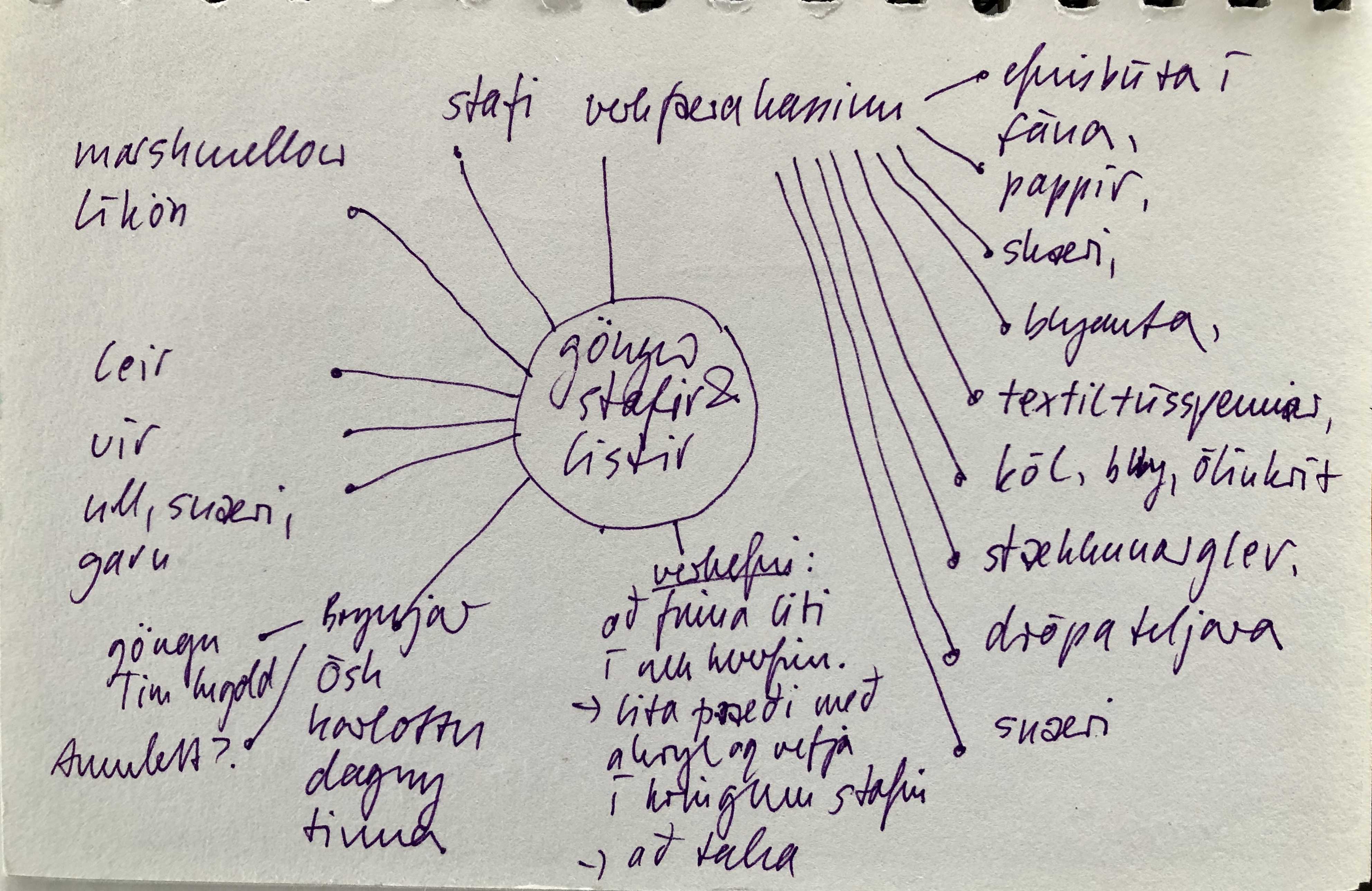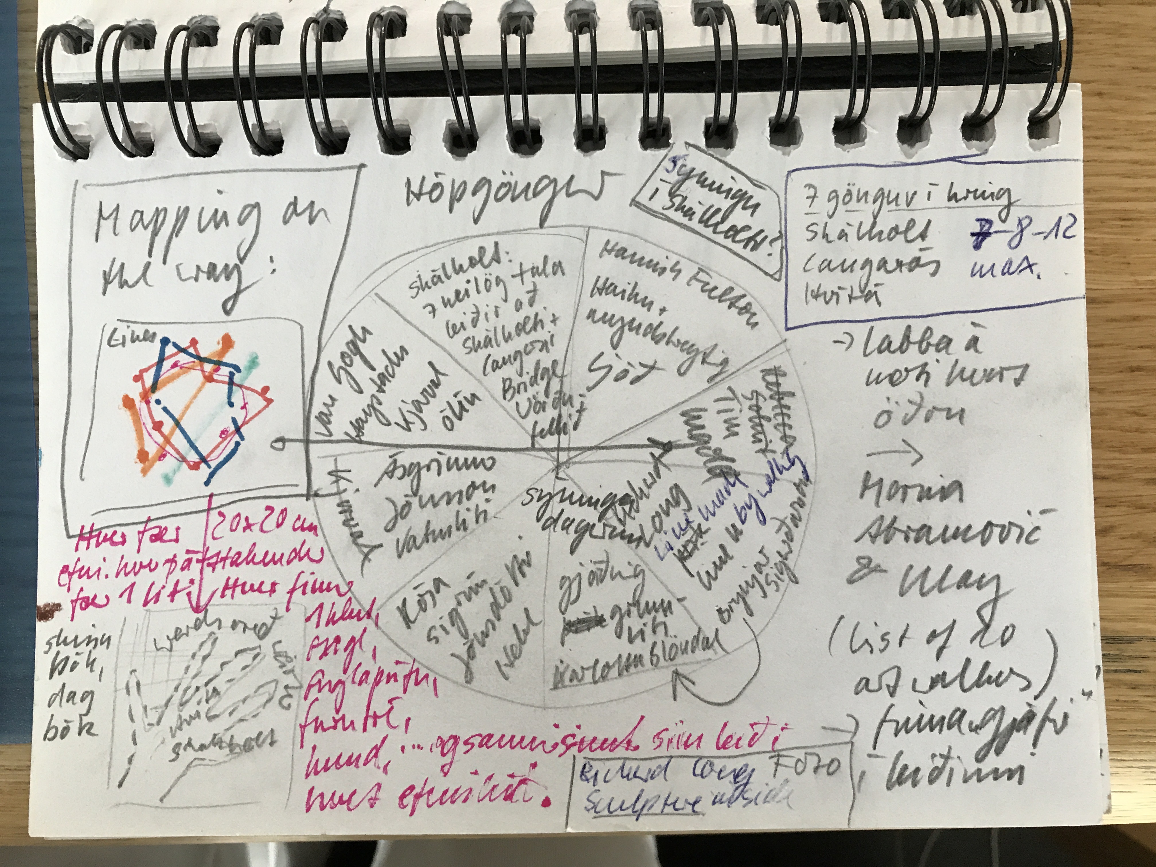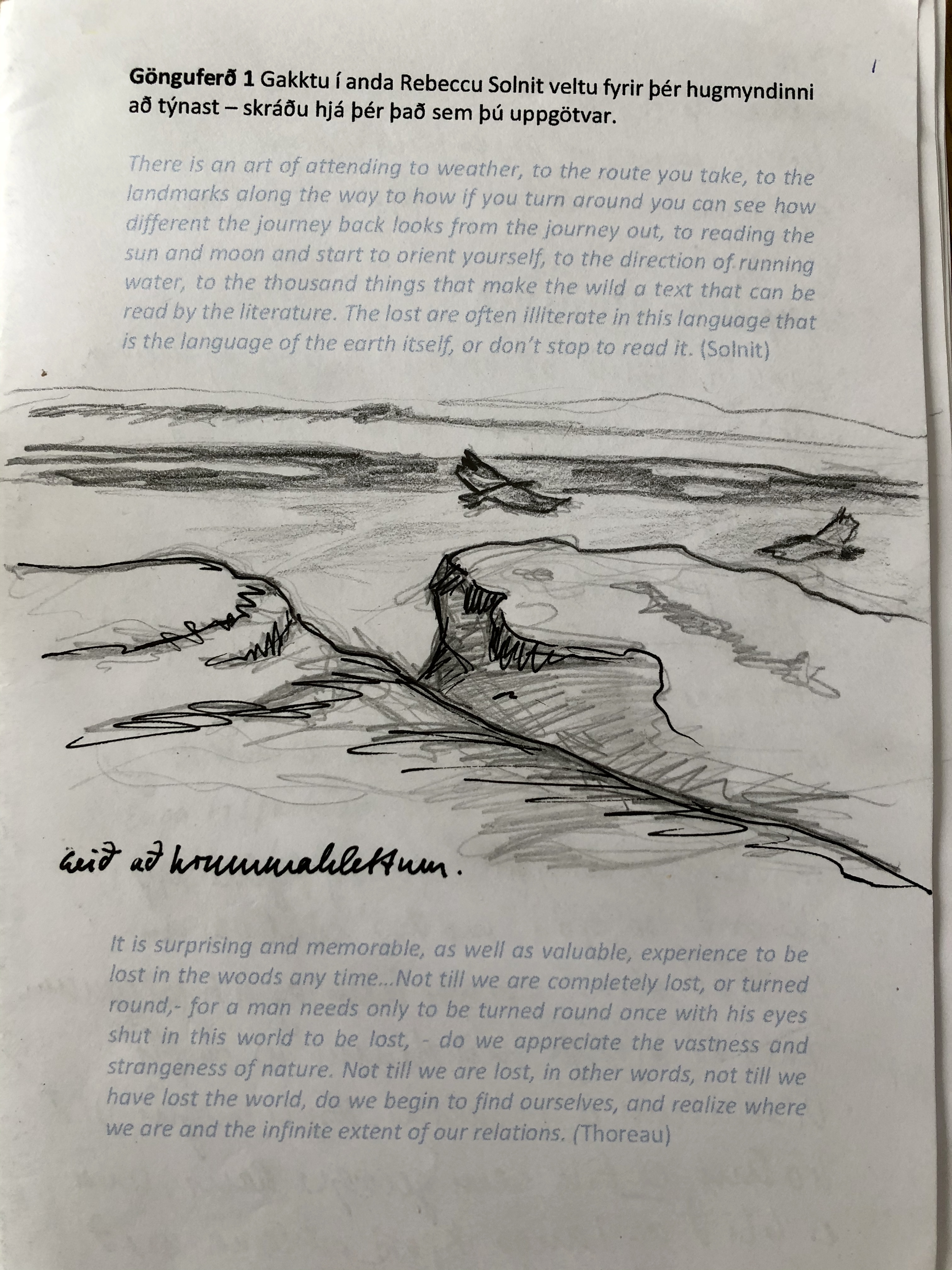Ég hef fundið svar við spurningunni sem ég hef lengi verið með, um hvað er hægt að gera með alla fegurðina í kringum mig, landslagið sem ég geng um þrísvar á dag með hundinum minum. Í þessum áfanga listir og göngur hef ég geta aflað mér smá innsæi í heim göngulistamanna og fengið verkfæri til að geta unnið með göngur sem listamaður og kennari. Nú á ég eftir að lesa meira og halda áfram að gera tilraunir, aðallega tengð kennslu á grunnskólastigi og í ferðaþjónustu.