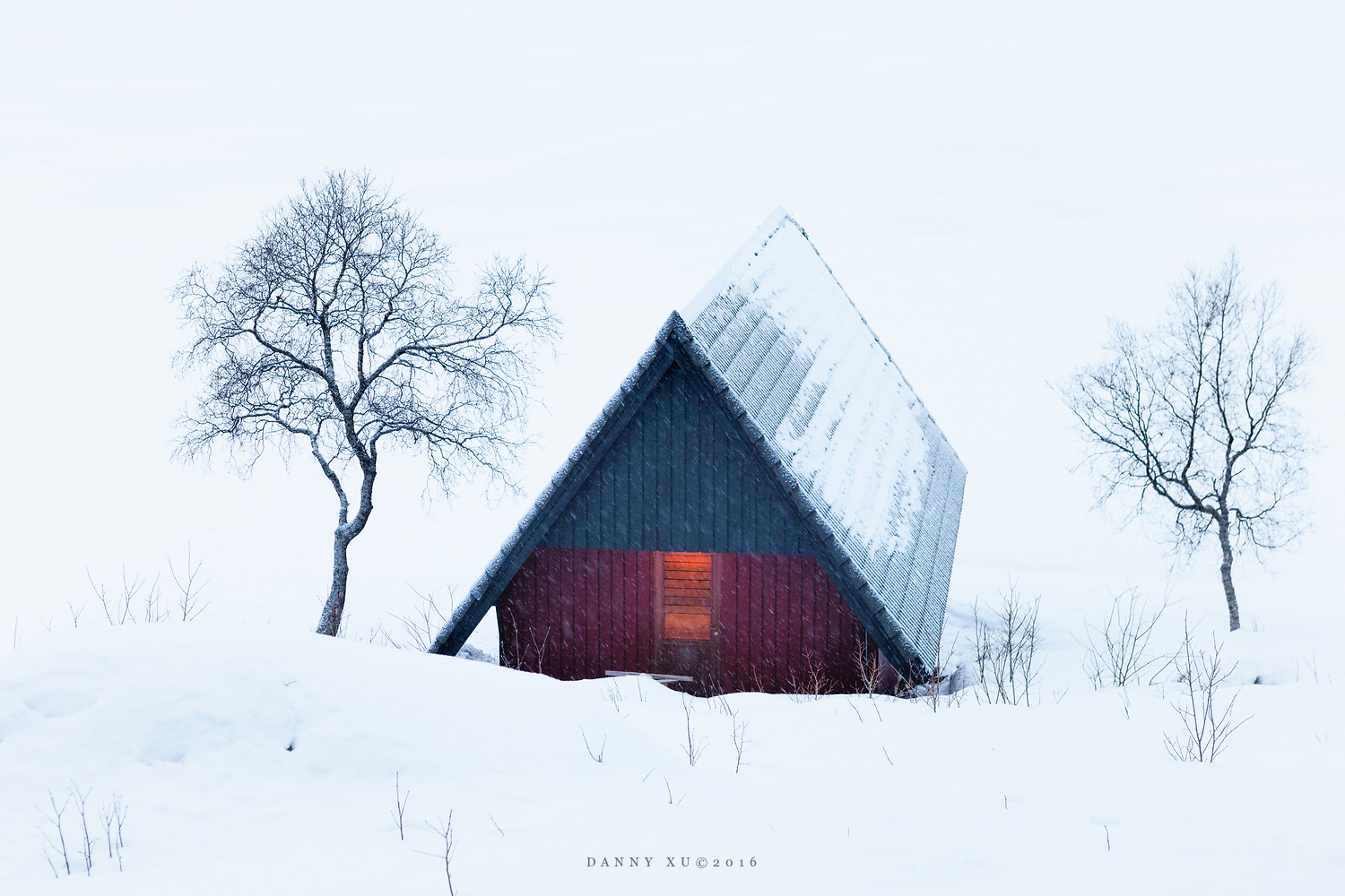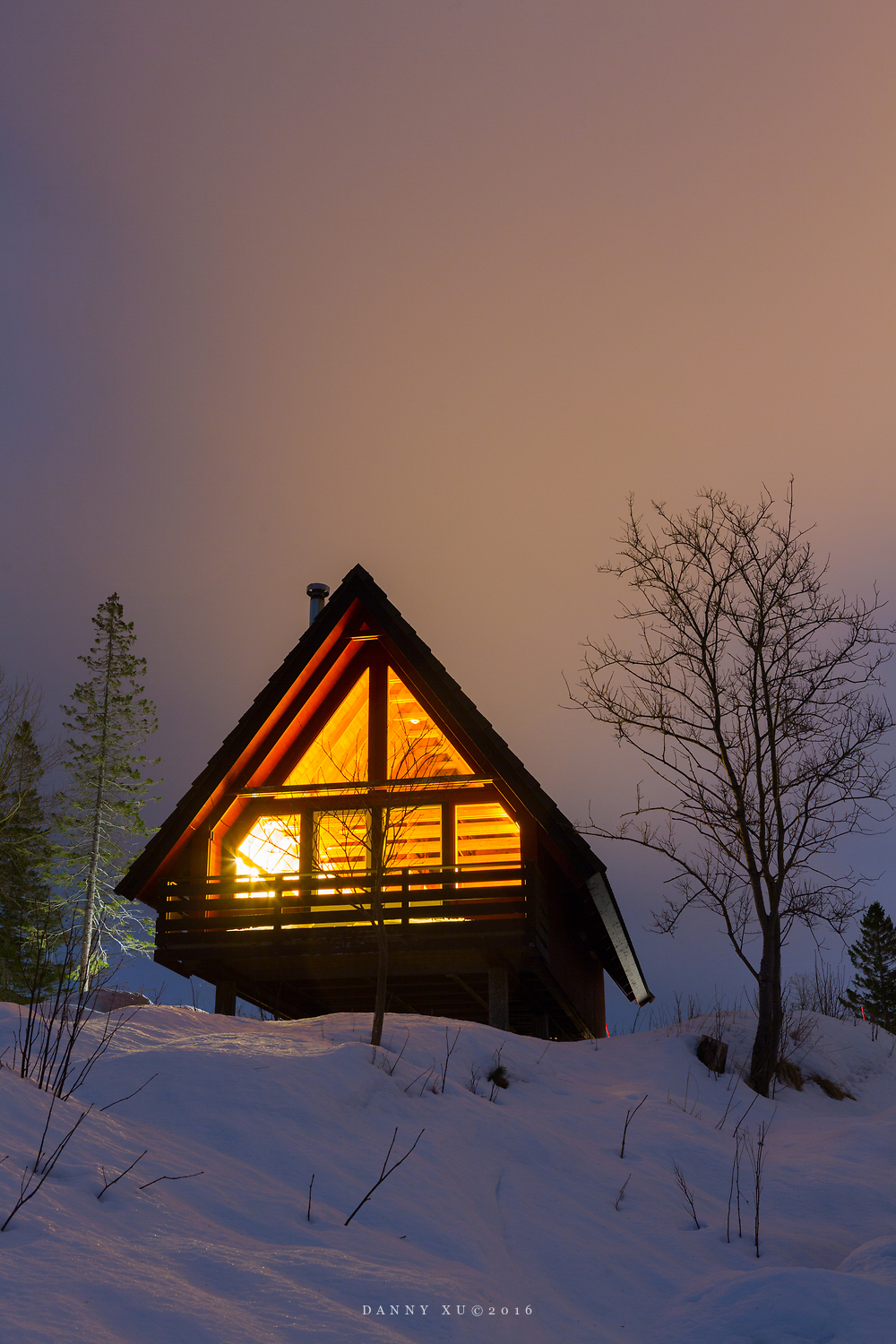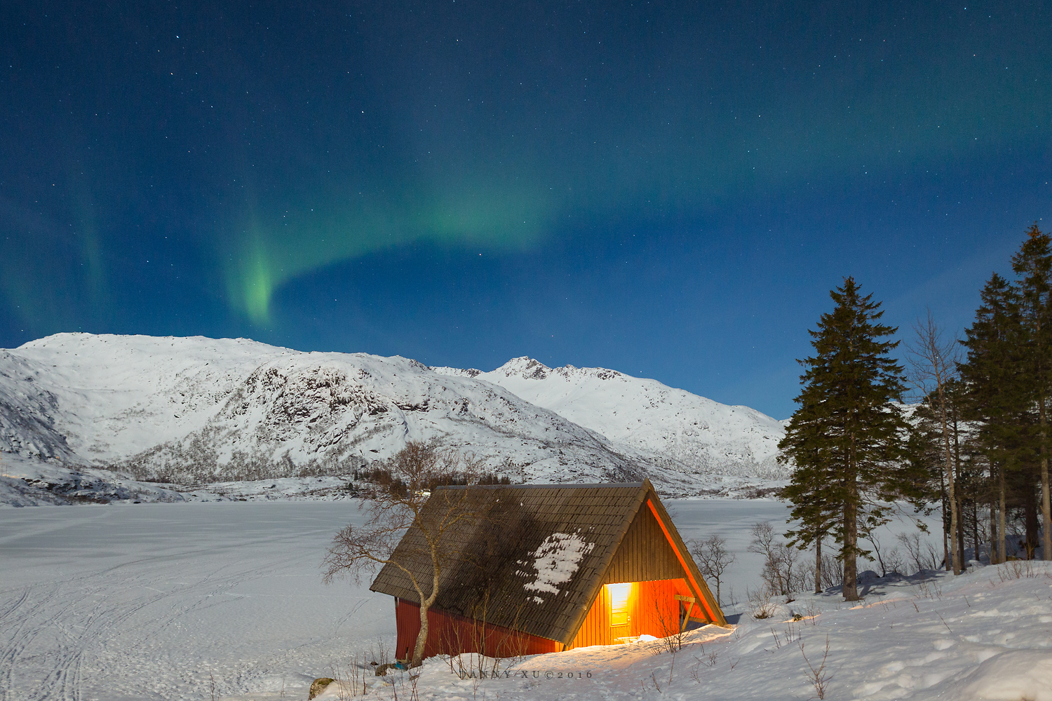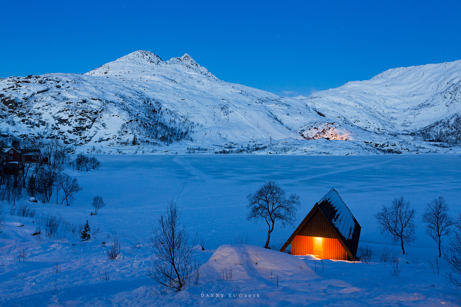 我们在斯沃尔韦尔选择的住宿点的是一个渡假村,紧靠着一个封冻了的湖泊,湖对岸是一座大山,冬季山坡就是滑雪场。我们住的小木屋,正对着湖边一个晚上亮灯的小房子,这个小房子在冰雪世界里显得如此温馨,以致我们在阳台上拍了它很多照片。