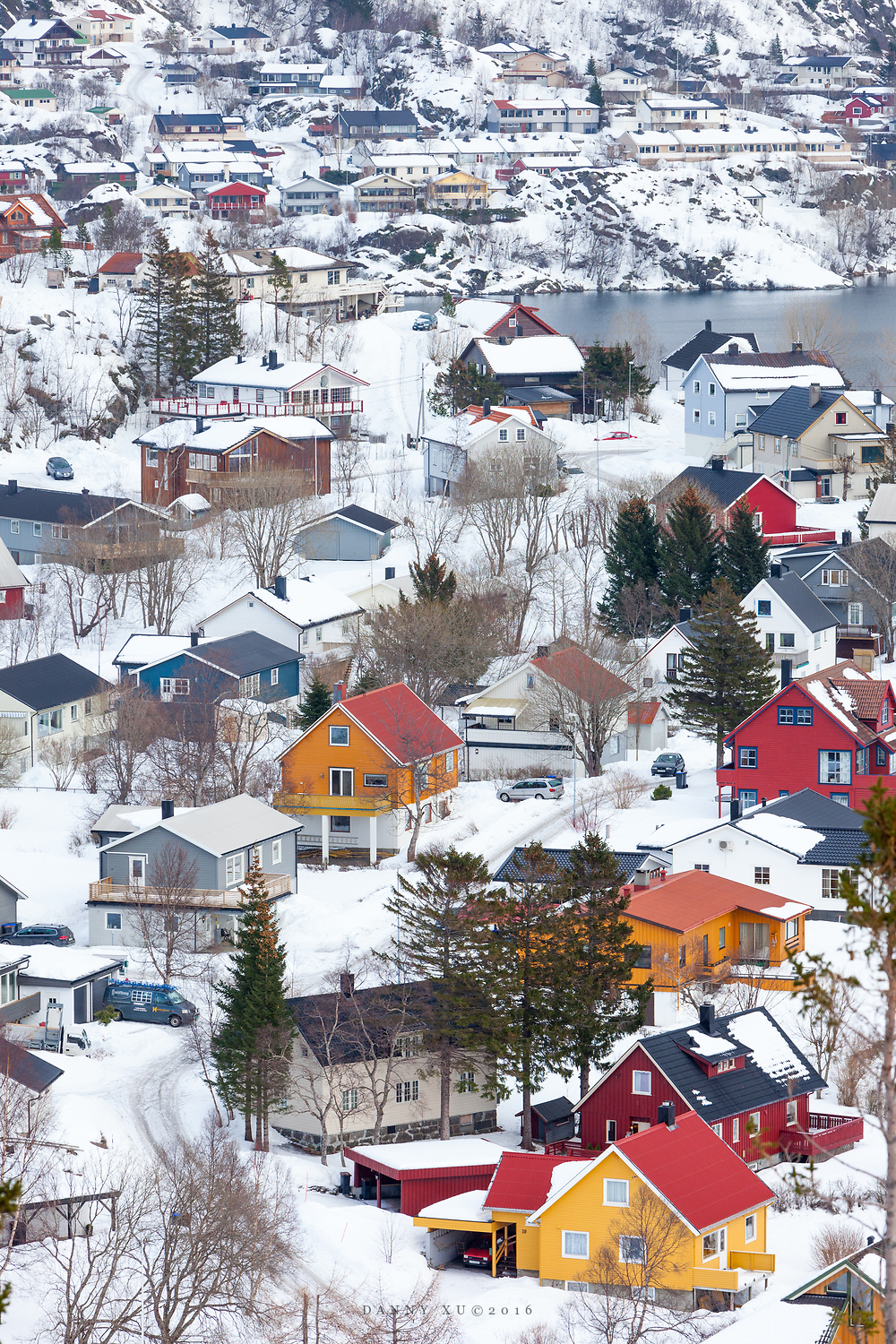 为了寻找不寻常的角度拍摄这个美丽的渔村,我们穿上了雪鞋,攀爬了村边的一座大山的雪坡。看上去并不很陡的雪坡,一旦雪被冻硬成为冰之后,就不是雪鞋可以胜任的了。我们上到一定高度,发觉脚下很难站稳,更别说架脚架拍片了。只好下撤到比较安全的地方拍。