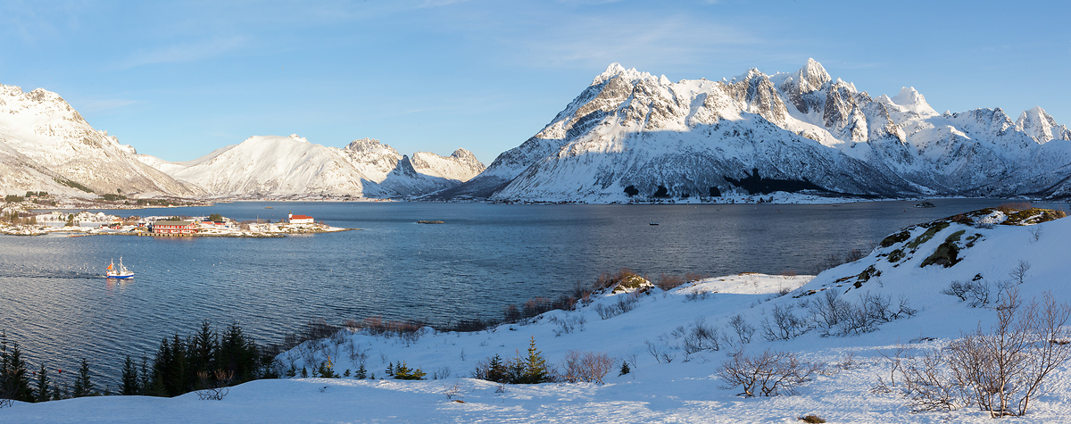 罗弗敦群岛毕竟是极地挪威最著名的旅游目的地。这里大小岛屿千百个,峡湾水道曲折,陡峭的雪峰从海面直拔而起,色彩醒目的小渔村星星点点。这种奇美的极地景色是地球一绝。