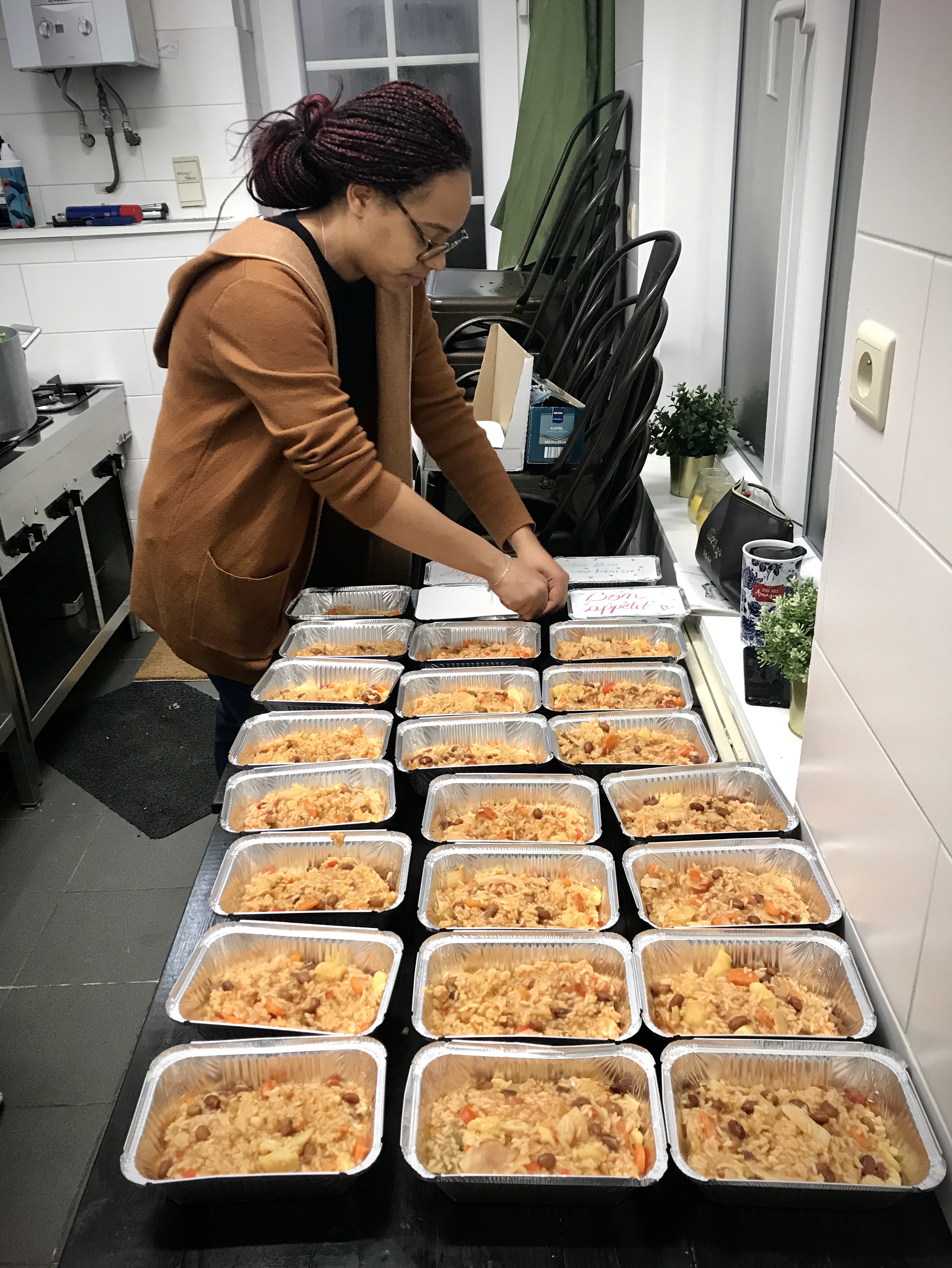 Nous continuons aussi le travail dans le quartier rouge avec Cherut. Nous décidons d’inviter certaines des femmes à un repas chez nous. Notre idée est de les inviter à partager avec nous une recette de leur pays d’origine que nous allons cuisiner et manger ensemble. Nous recevons une jeune femme du Nigéria, avec qui nous passons un très bon moment !