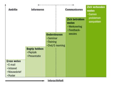 - Personeelsbijeenkomsten: verschillende afdelingen moeten onderling contact hebben zodat er binnen een organisatie niet allemaal losse eilandjes ontstaan.