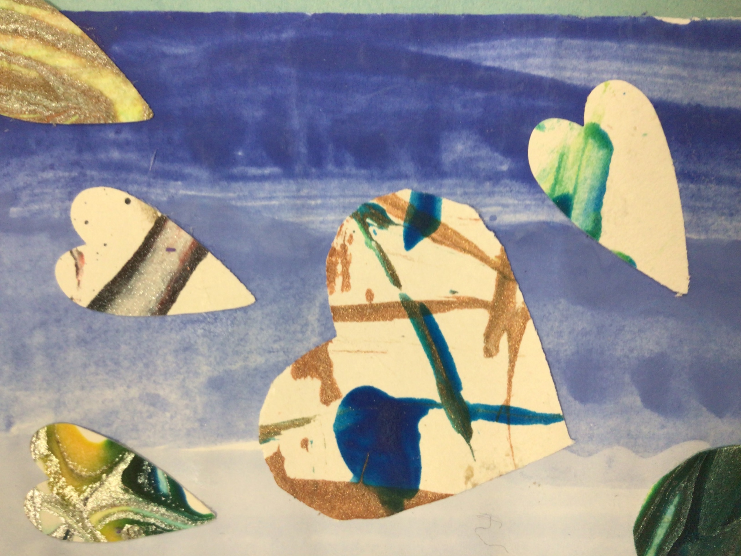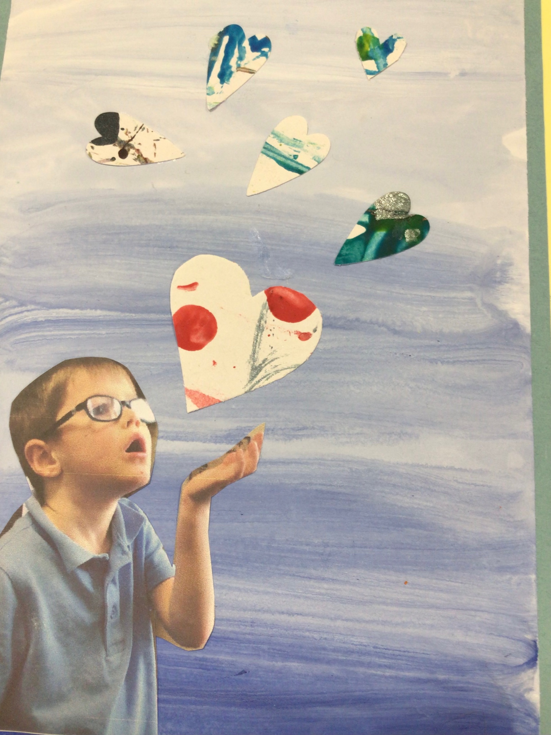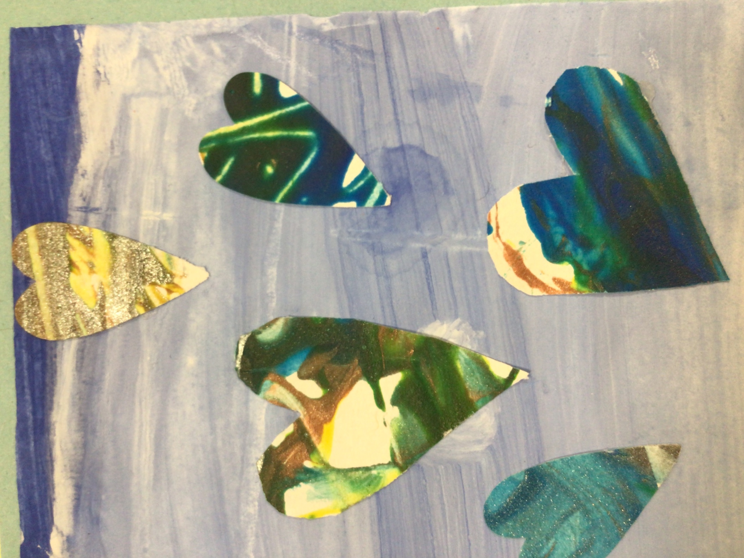 We added the hearts onto a background which was created by different shades of blue.