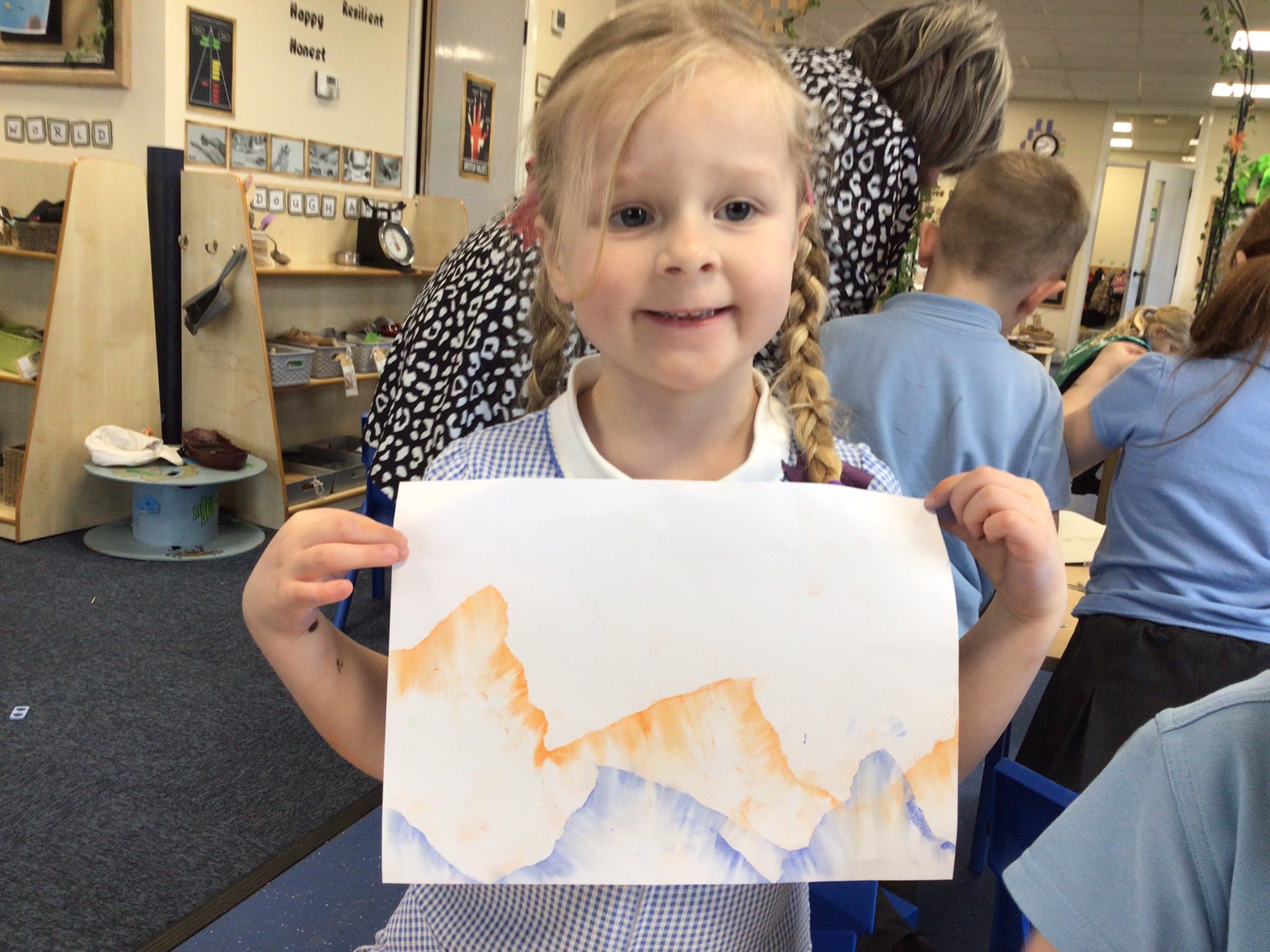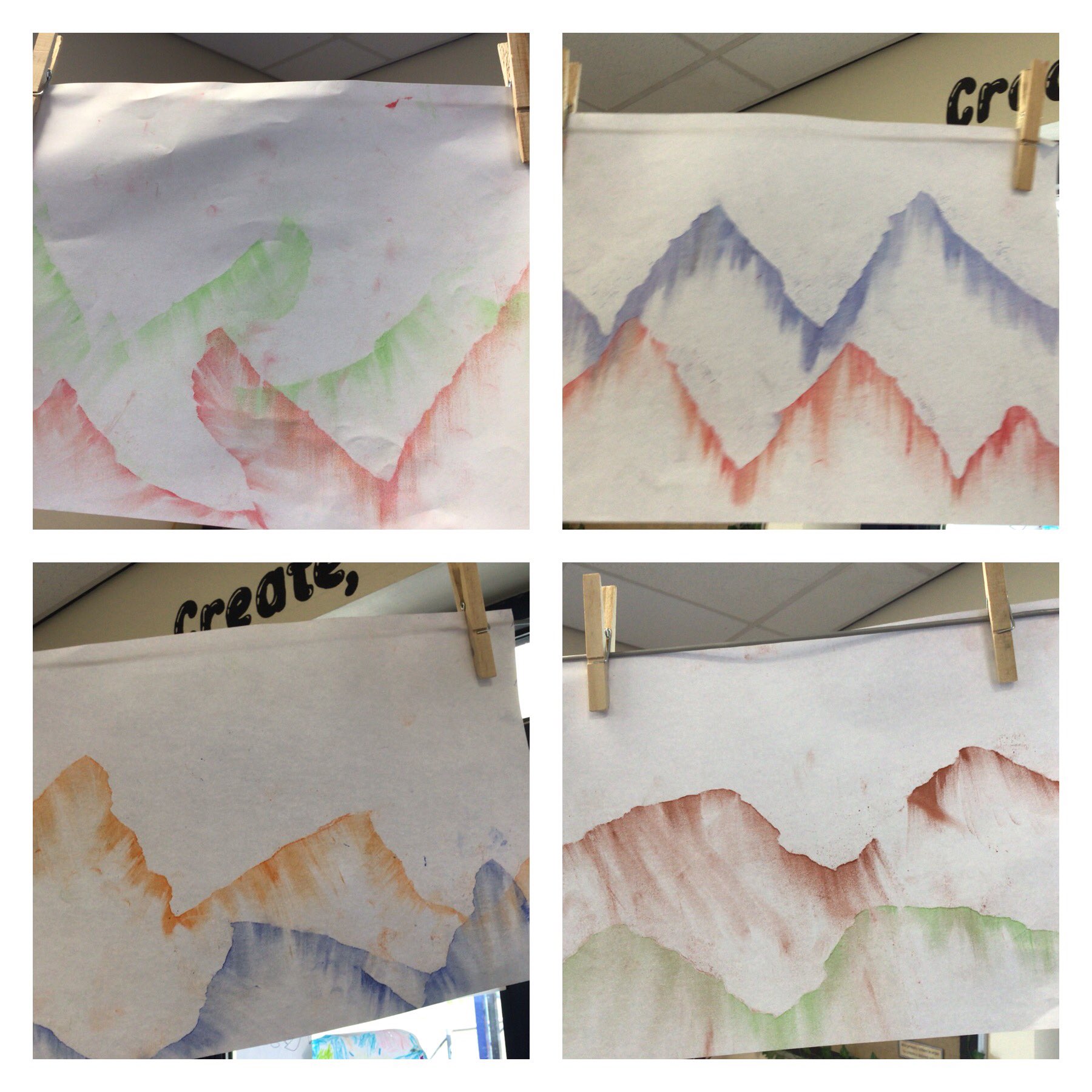 We made mountain ranges using chalk.we blended the chalk and used a stencil to create the mountain range.