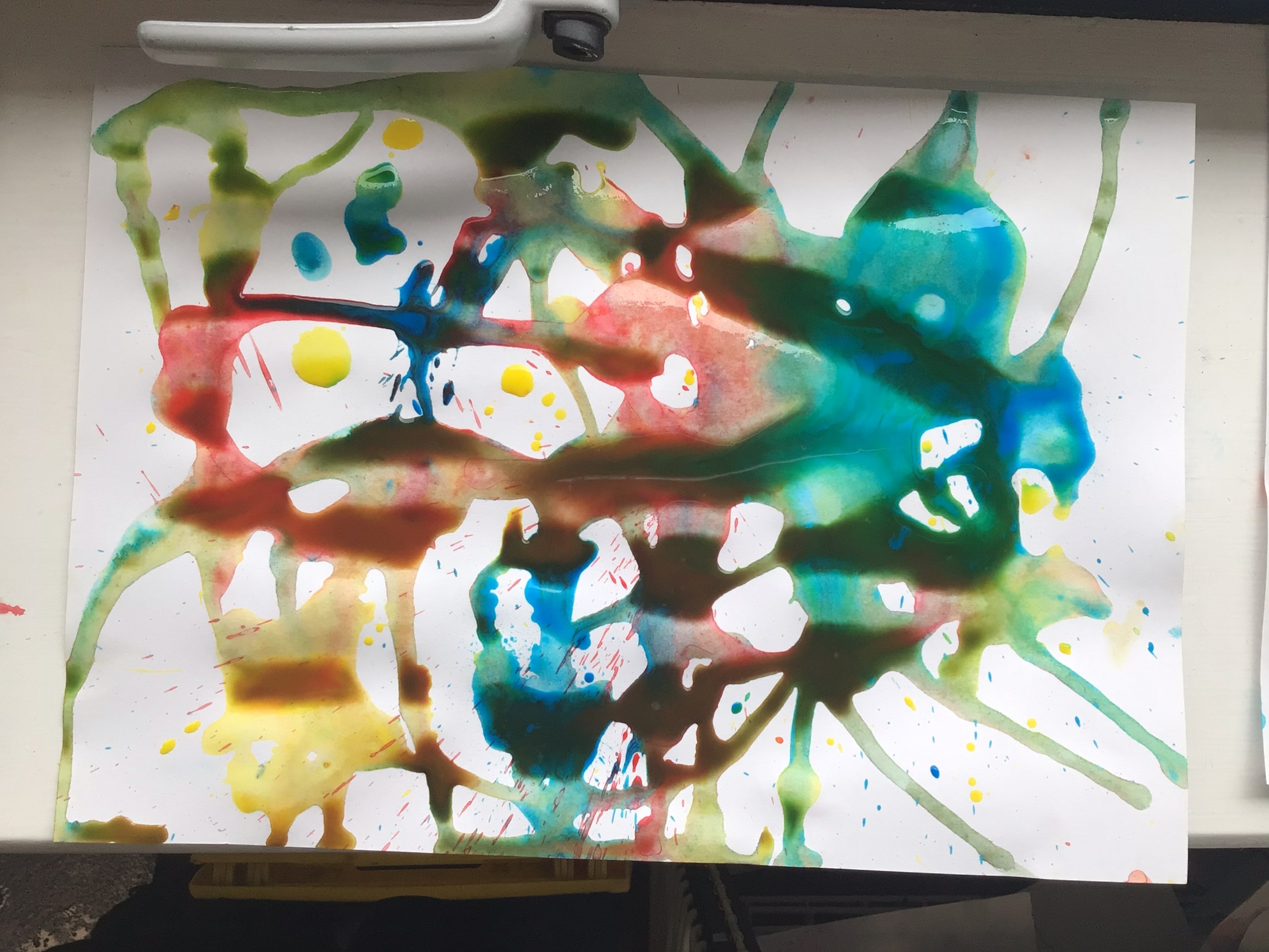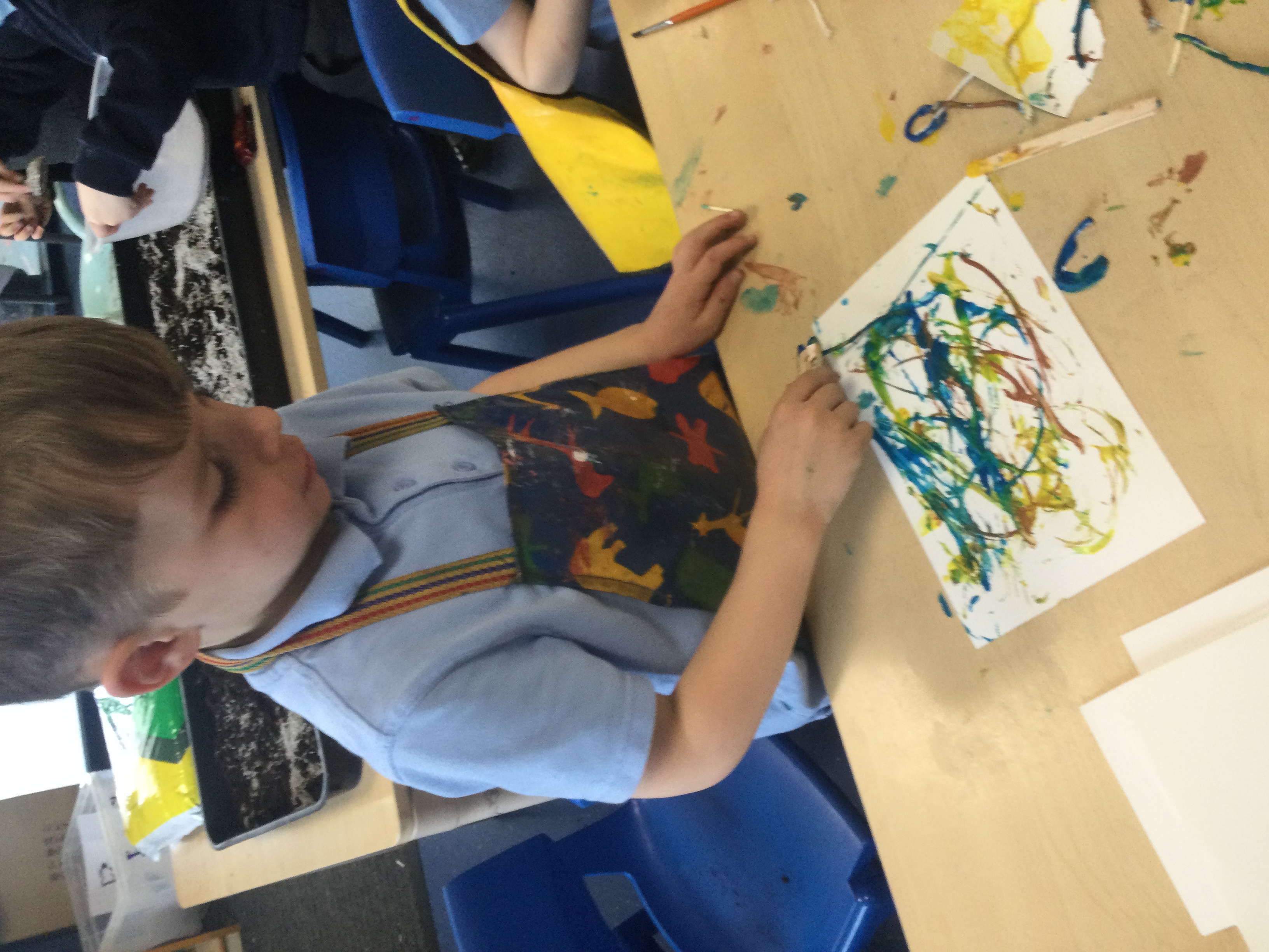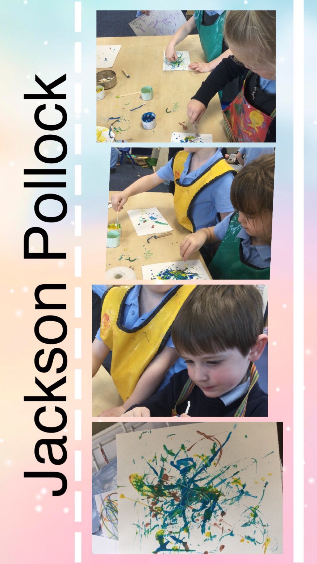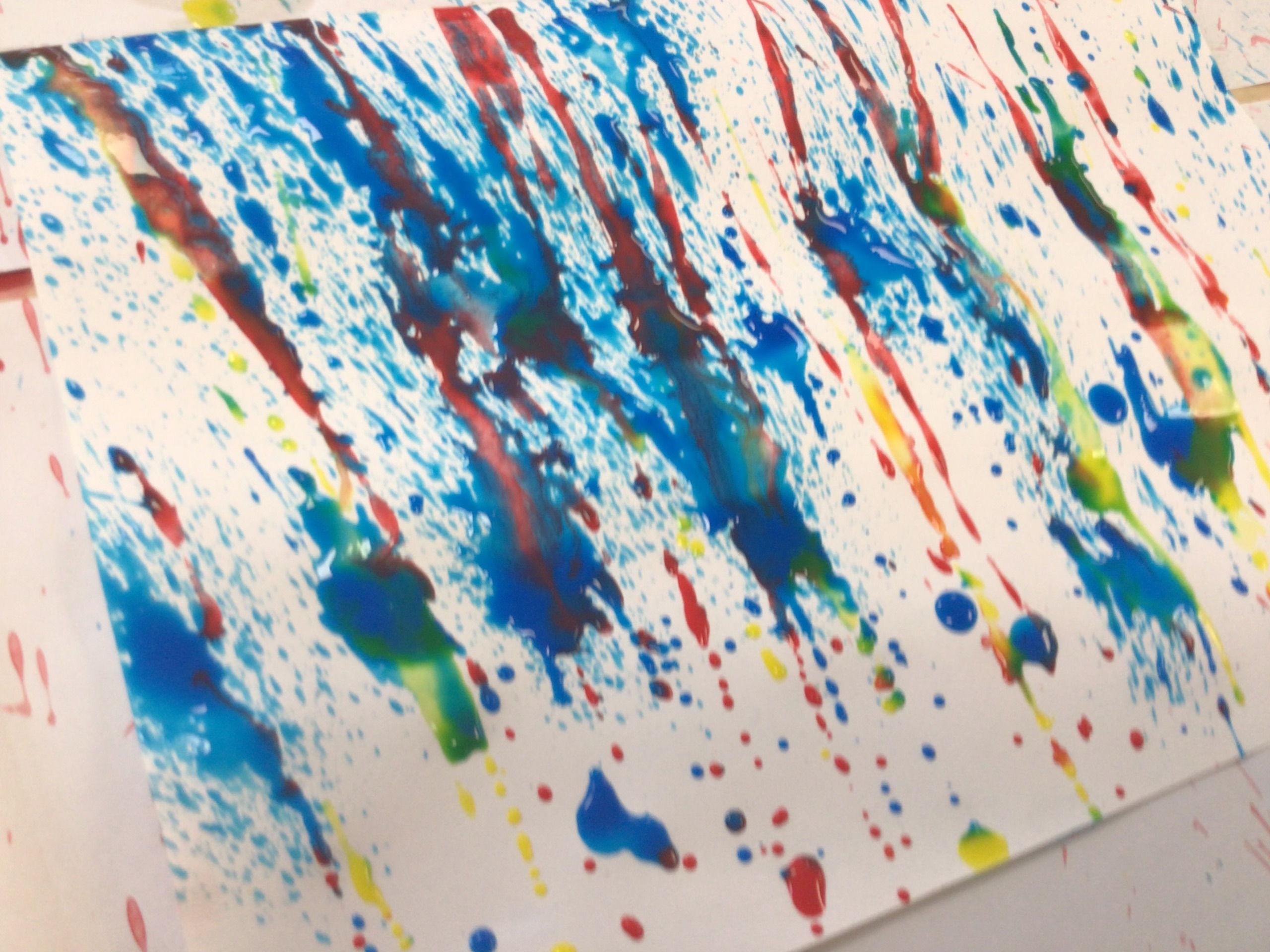 We created our own pieces of art inspired by Jackson Pollock. He used splatting on paper with paint and used different tools.