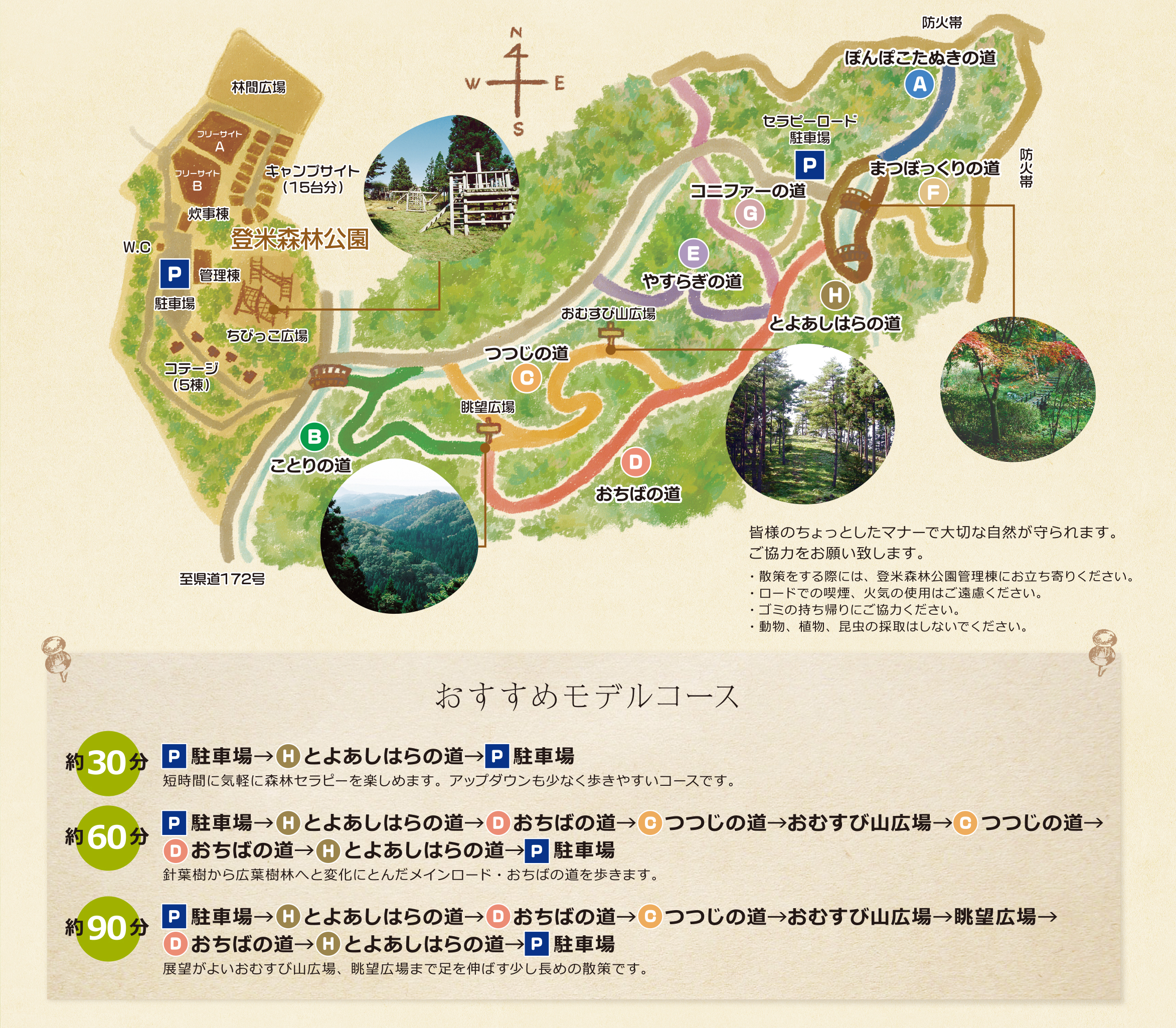 その時々のコンディションに合わせて選べるコースがあり、森林は四季折々の美しい姿で、皆様をお迎えします。