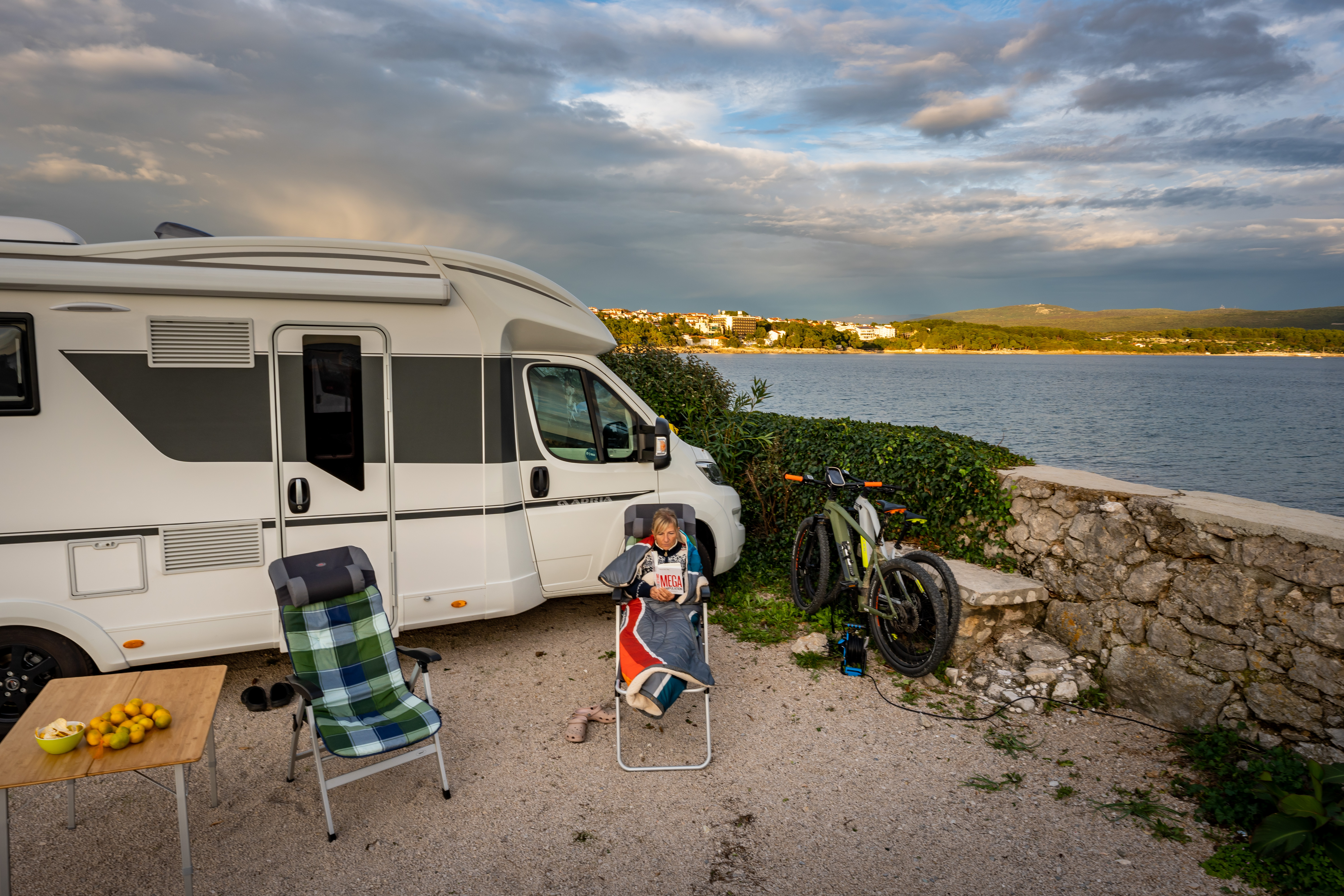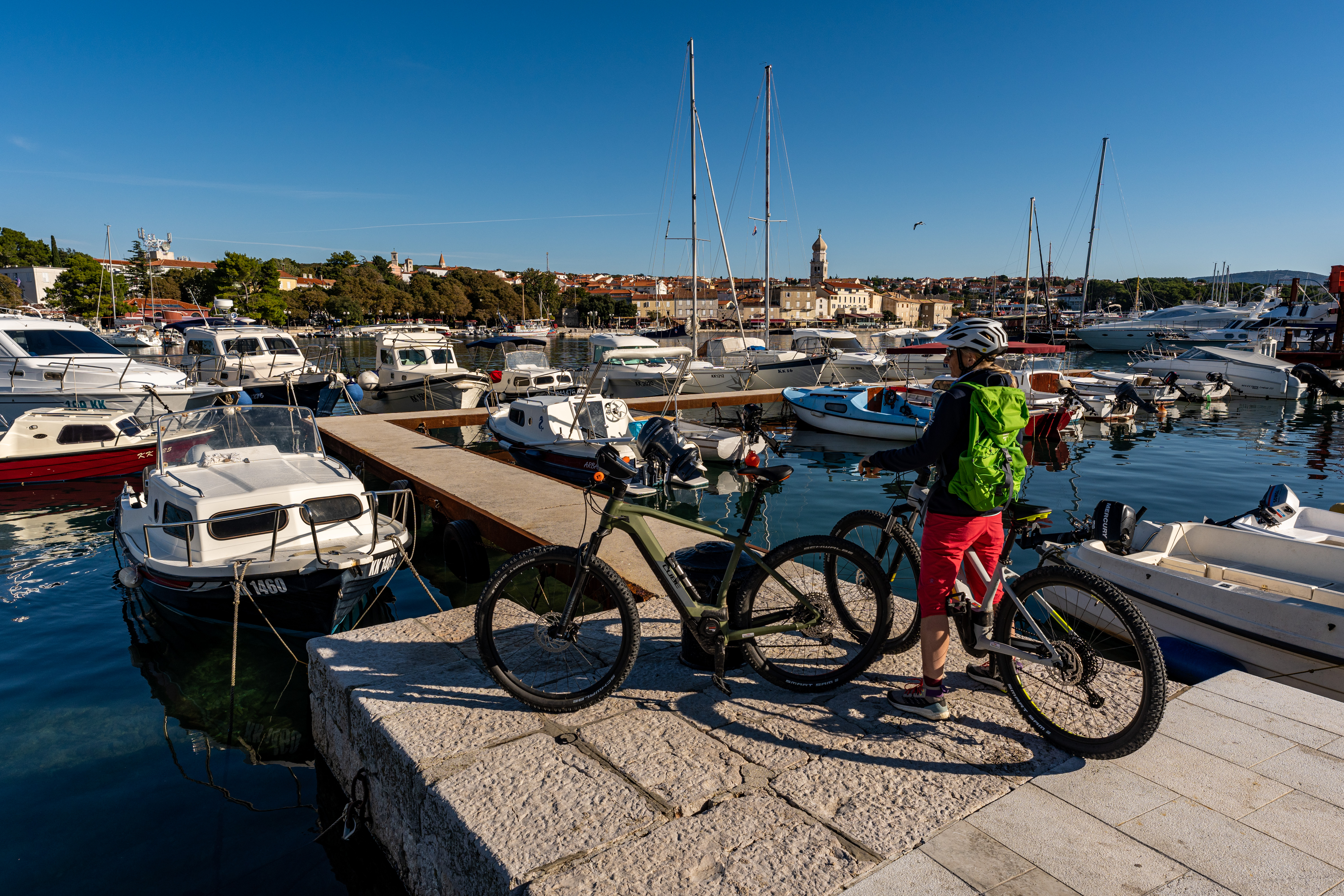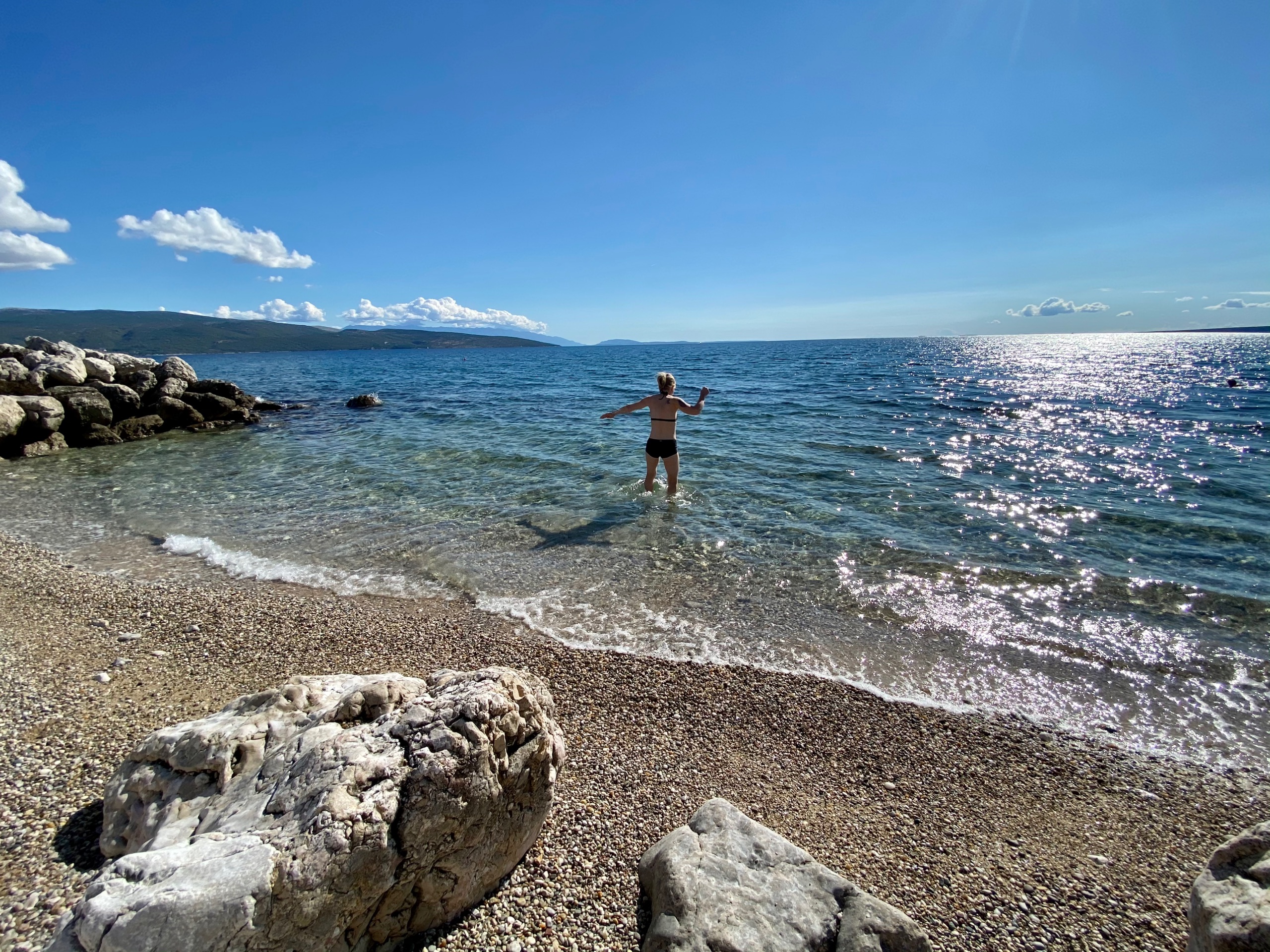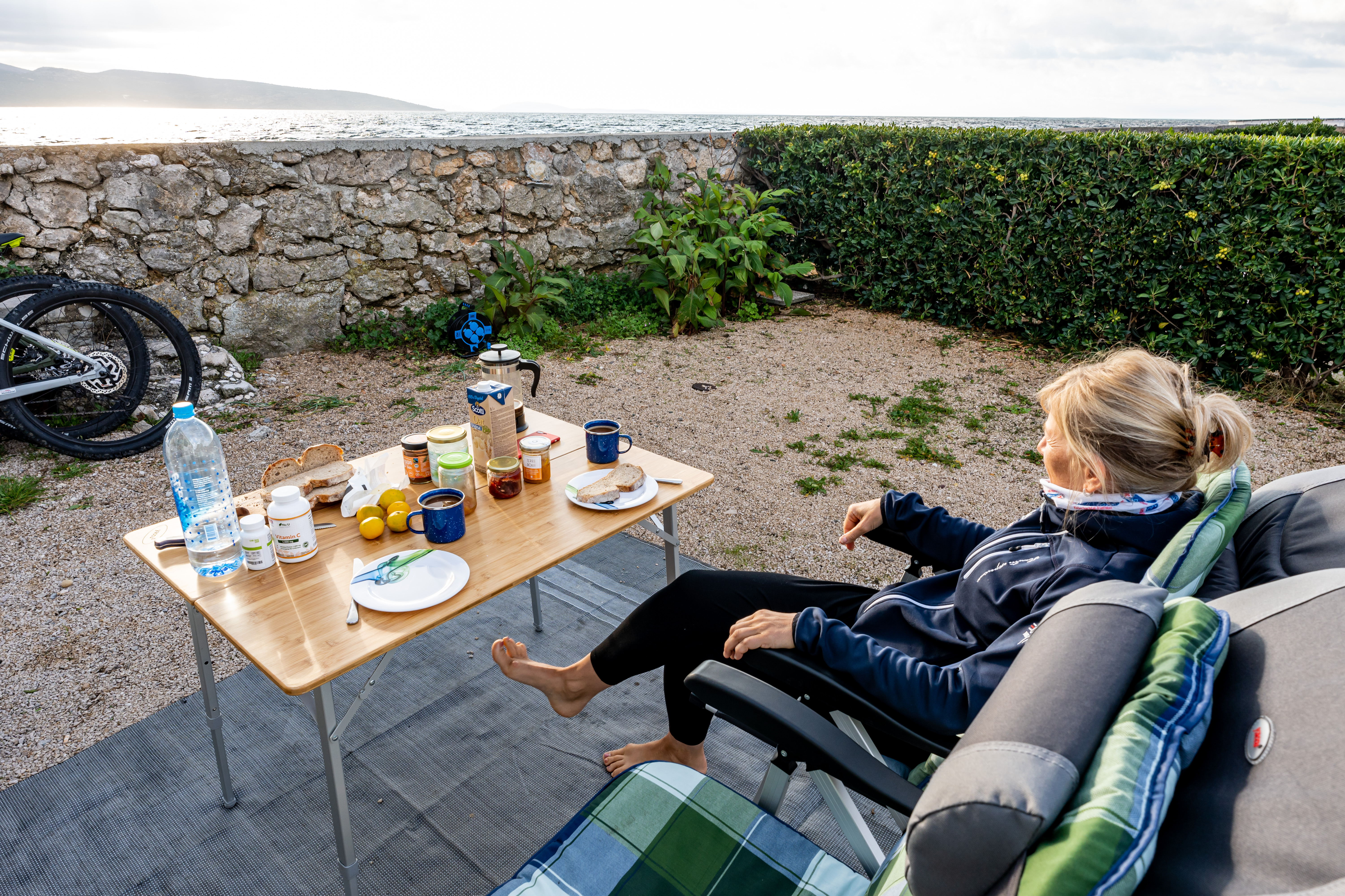 Heute sind wir richtig zeitig wach. 07:30 schleichen wir aus dem Wohnmobil. Wir gehen erstmal in das fast glatte Meer baden, dann frühstücken wir gemütlich ein Müsli. Wir satteln unsere Bikes und radeln gegen 10:10 los in Richtung Vrbnik. Wir fahren auf großen und kleinen Straßen über die Insel Krk. Wir schauen im kleinen Fischerdorf Malinska vorbei und ruhen uns dort erstmal aus. Es geht nach Dobrinj, Risika über Weinfelder weiter bis wir zum Mittag Vrbnik erreichen. Hier shoppen wir ein paar Kleinigkeiten und essen eine „Mittagspizza“ - super lecker aber zu groß für uns. Wir kaufen noch fix eine Flasche lokalen Wein, den Zlahtina (Rebsorte) von Gospoja/Vrbnik. Unterwegs fangen wir kurz vor Krk noch 4kg Mandarinen ein. Bei der Dame hatten wir schon vor Tagen eingekauft, und weil es so lecker war sind wir nochmal zu Ihr. Um 15:00 erreichen wir wieder den Campingplatz. Erstmal fix mit den Nachbarn latschen und nochmal ein schnelles Bad im Meer. Brrrr...schon kalt. Zum Abendessen gibt es Spaghetti Aglio Olio und den Wein dazu. Wir sind durch den sonnenreichen Tag und die Bewegung ganz schön platt. Unsere Platznachbarin Brunhilde hat uns fünf Bücher über ihren letzten Italienurlaub geliehen. Sehr inspirierend. Sieben Wochen in aller Ruhe durch Italien - sehr inspirierend. Dann gehts zeitig in die Koje.