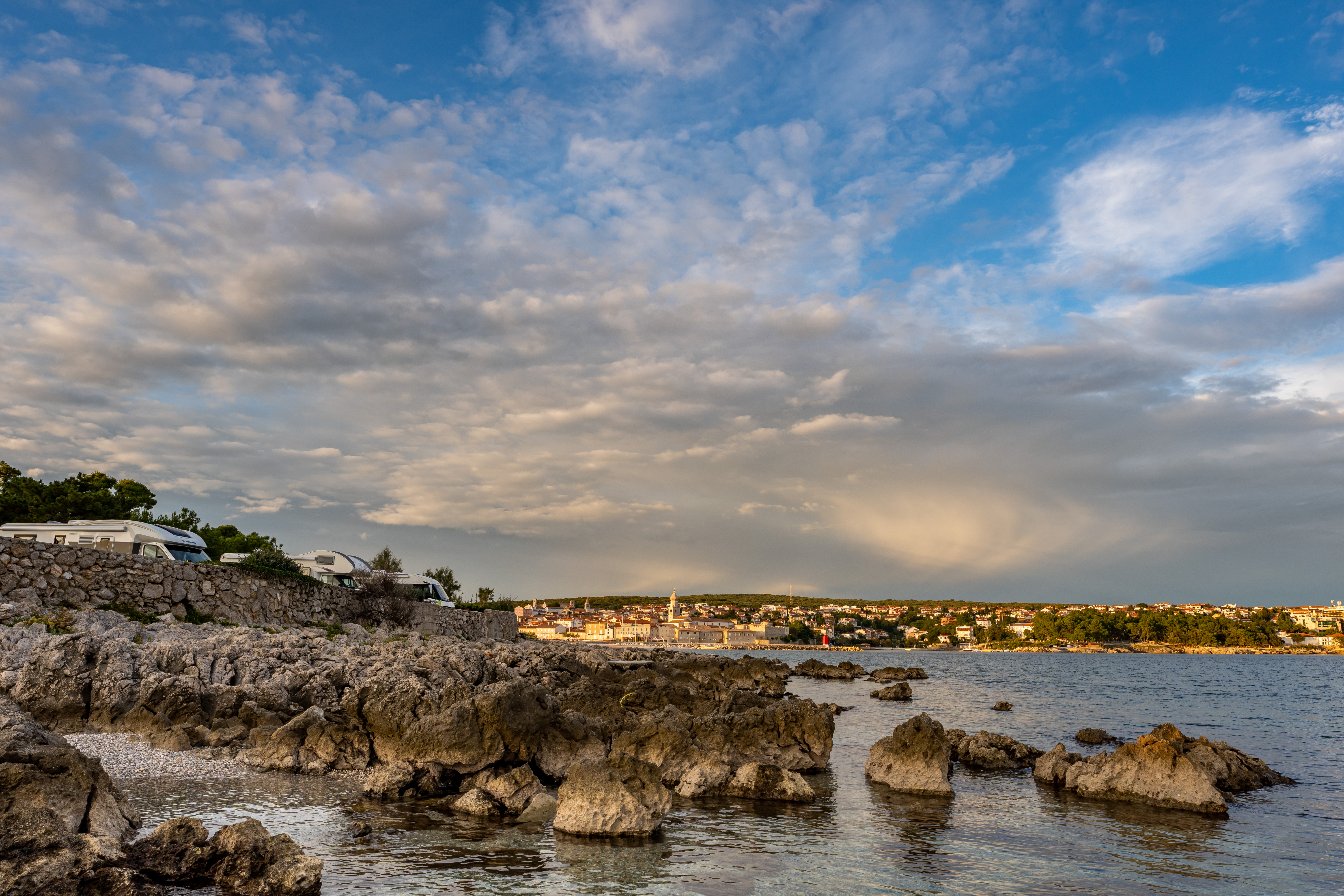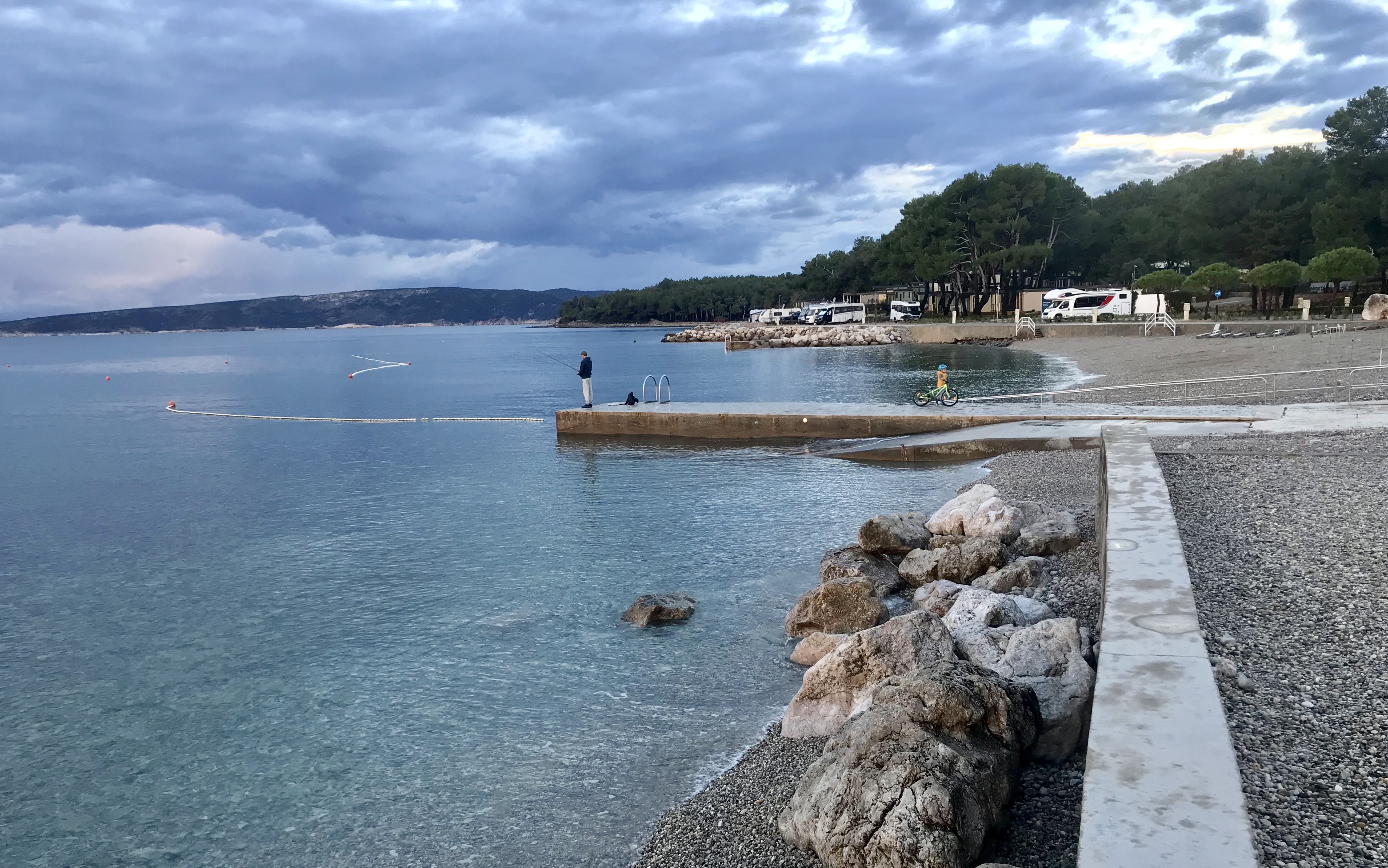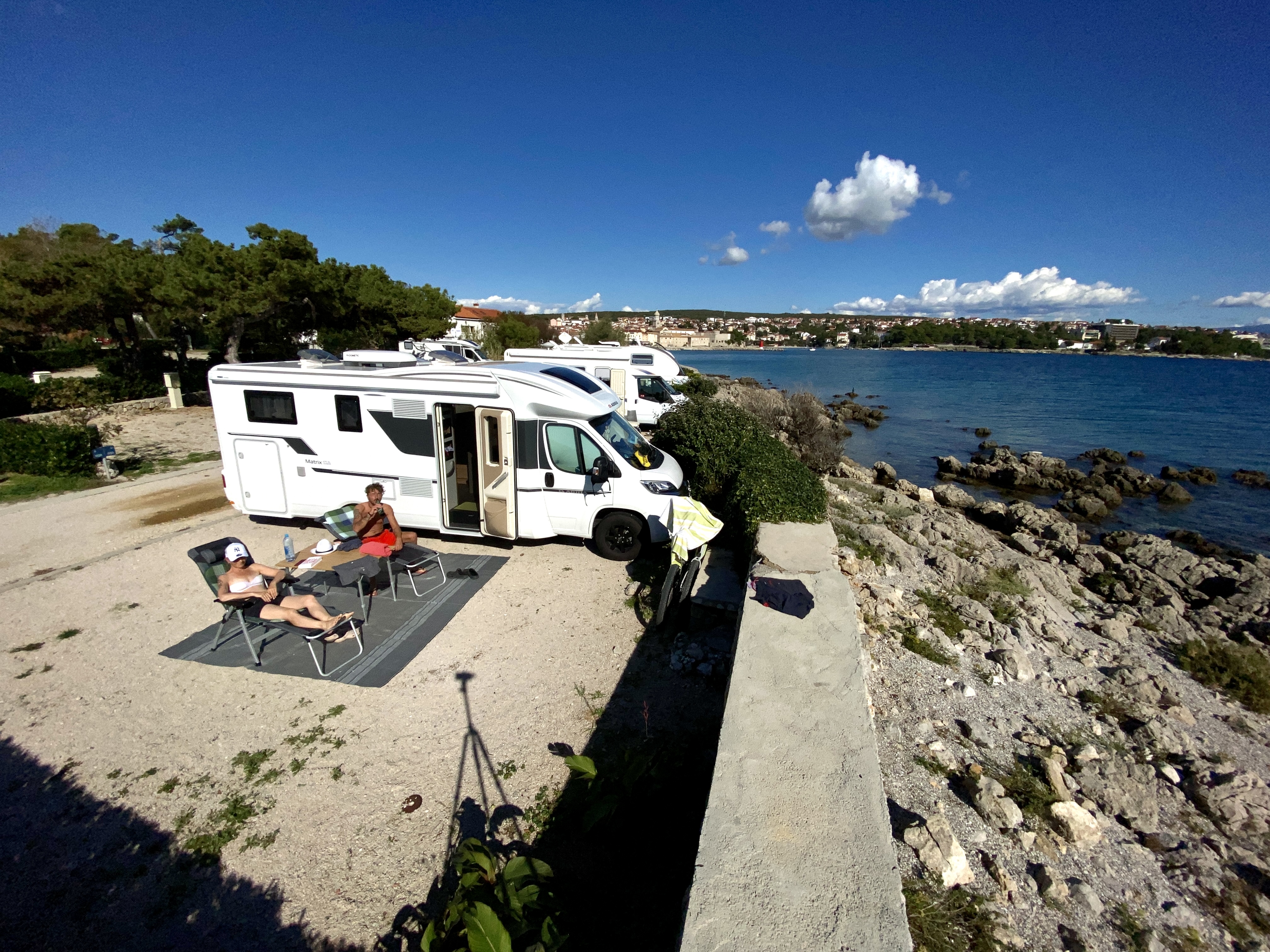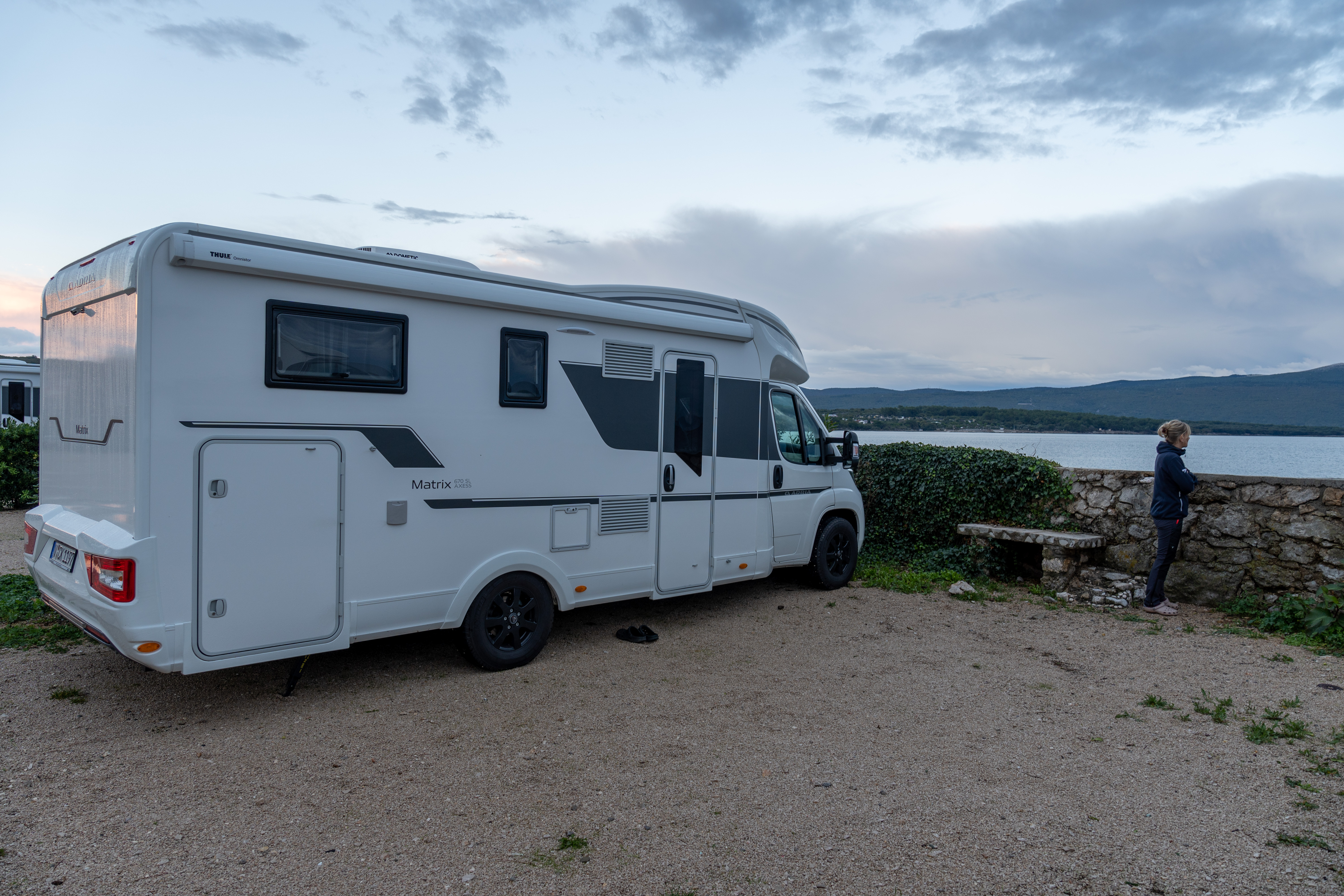 Nach einer doch anstrengenden Fahrt von über 450km und einigen Stunden hinter dem Lenkrad erreichen wir gegen 17:00 Uhr die Insel Krk und den gleichnamigen Ort. Im Supermarkt „Plodine“ füllen wir unsere Vorräte auf. Wir checken auf dem neuen Campingplatz Ježevac Premium Camping Resort ein und freuen uns wie die Kinder über den tollen Stellplatz D 013 - direkt am Meer. Wir stehen lediglich durch eine Mauer getrennt wirklich direkt am Meer. Die Anlage ist super gepflegt und in einem tollen Zustand, kleine Bar, sanitäre Einrichtungen top und eine günstige Lage zum Ortskern von Krk. Morgen soll es noch bisschen regnen, aber da machen wir uns mal nix draus, Regenjacke und fertsch. Wir lassen gerade ein Gewitter über uns ergehen - hat aber keine Ausdauer. Nach 30 Minuten ist alles vorbei.