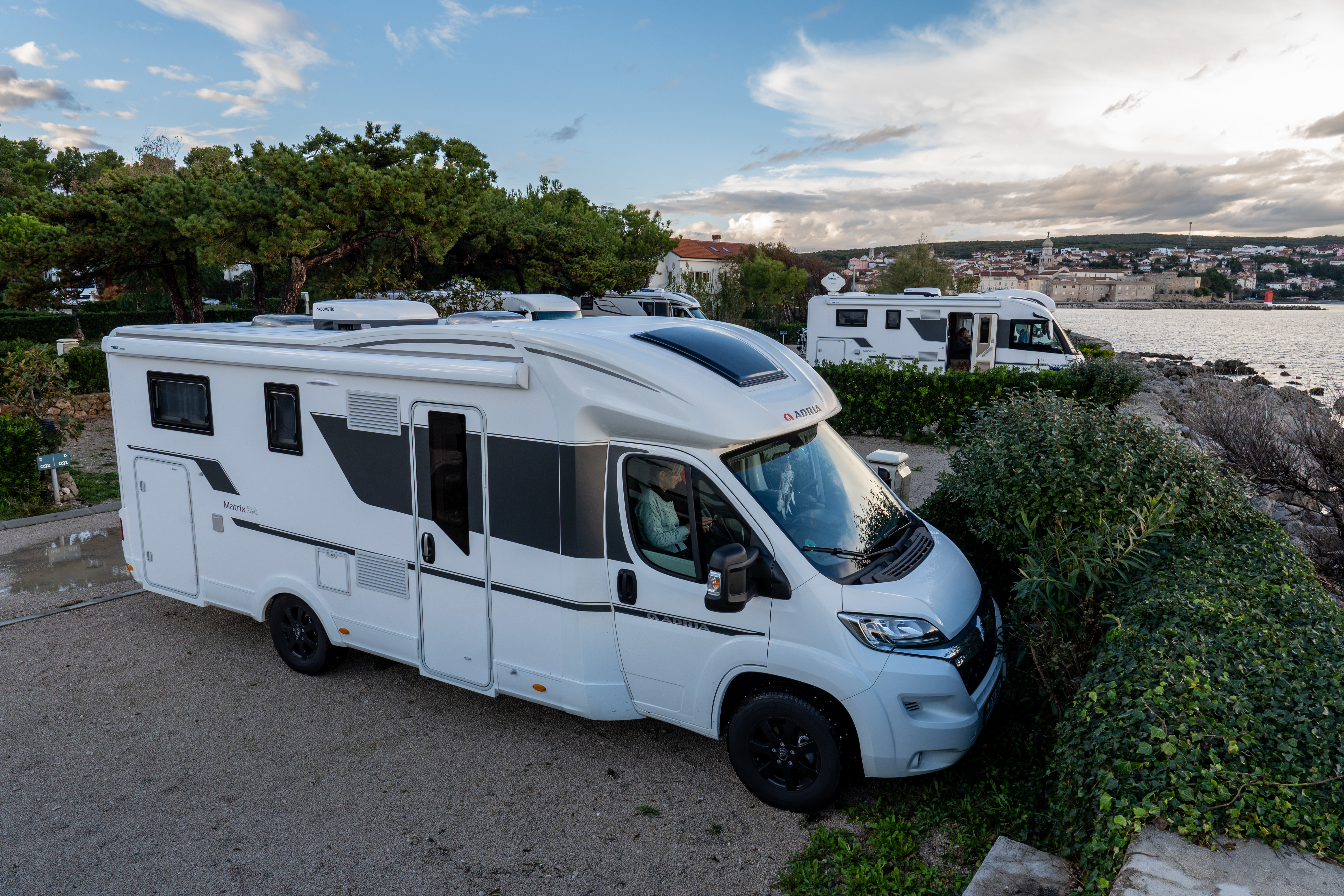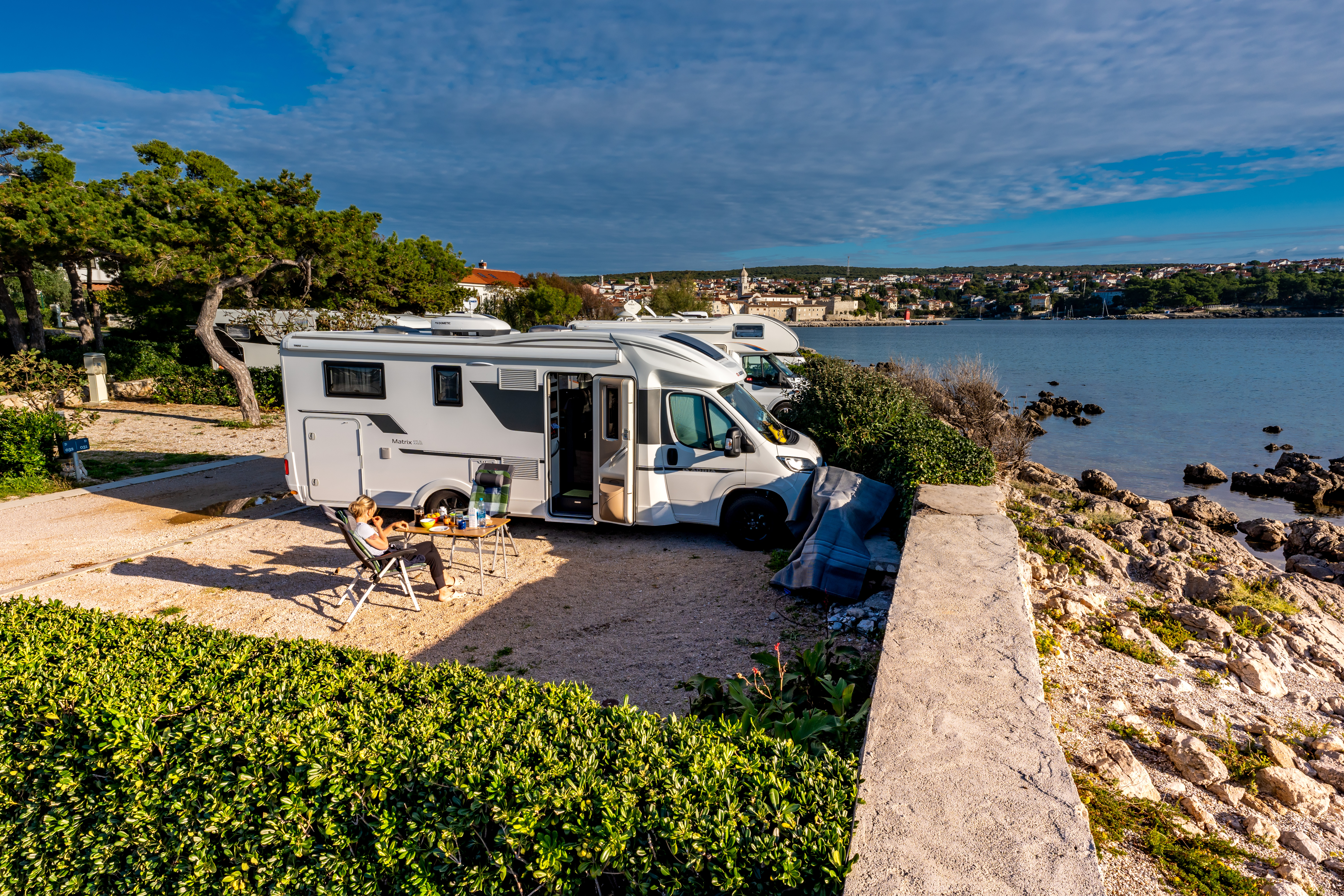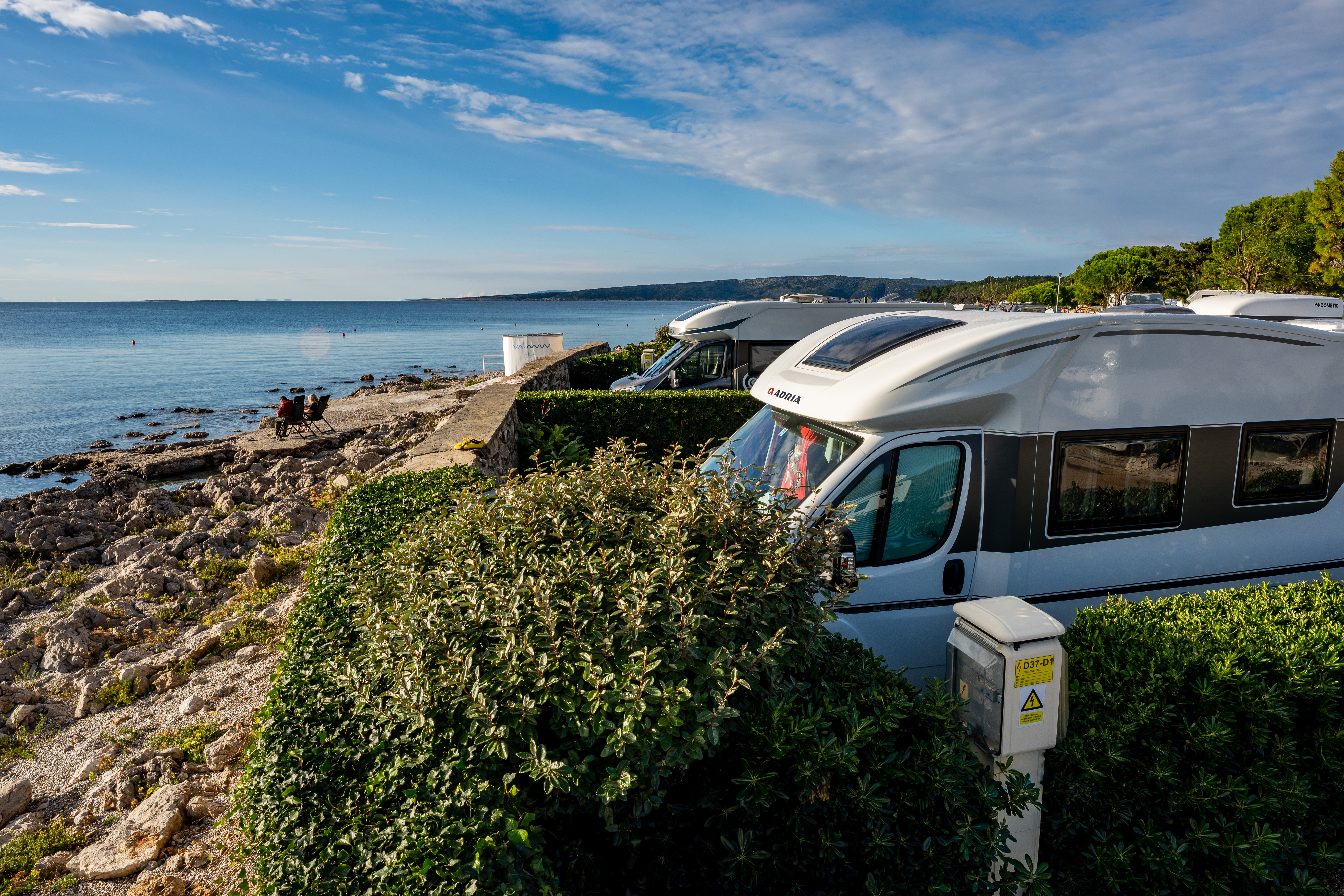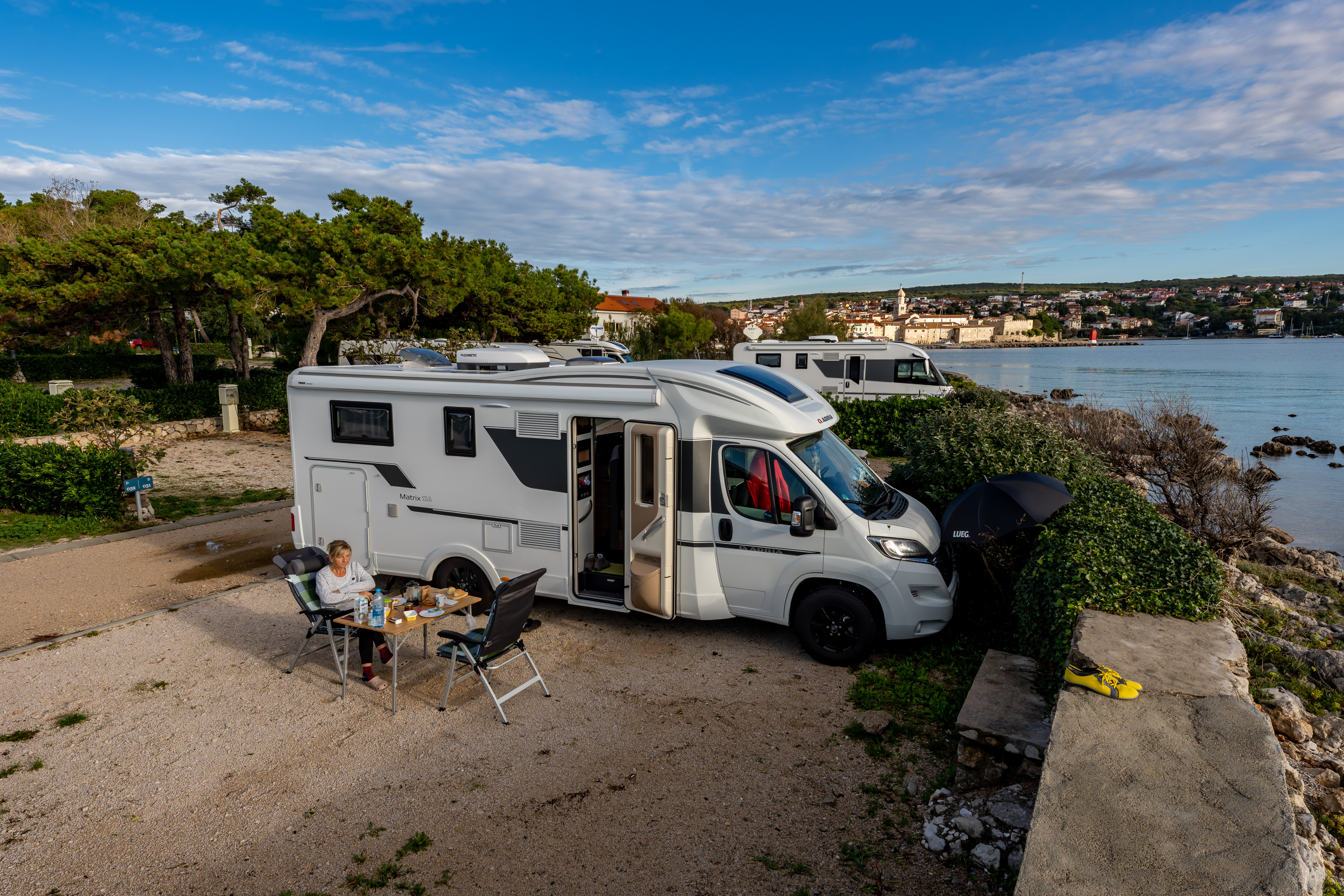 Nach einer doch anstrengenden Fahrt von über 450km und einigen Stunden hinter dem Lenkrad erreichen wir gegen 17:00 Uhr die Insel Krk und den gleichnamigen Ort. Im Supermarkt „Plodine“ füllen wir unsere Vorräte auf. Wir checken auf dem neuen Campingplatz Ježevac Premium Camping Resort ein und freuen uns wie die Kinder über den tollen Stellplatz D 013 - direkt am Meer. Wir stehen lediglich durch eine Mauer getrennt wirklich direkt am Meer. Die Anlage ist super gepflegt und in einem tollen Zustand, kleine Bar, sanitäre Einrichtungen top und eine günstige Lage zum Ortskern von Krk. Morgen soll es noch bisschen regnen, aber da machen wir uns mal nix draus, Regenjacke und fertsch. Wir lassen gerade ein Gewitter über uns ergehen - hat aber keine Ausdauer. Nach 30 Minuten ist alles vorbei.