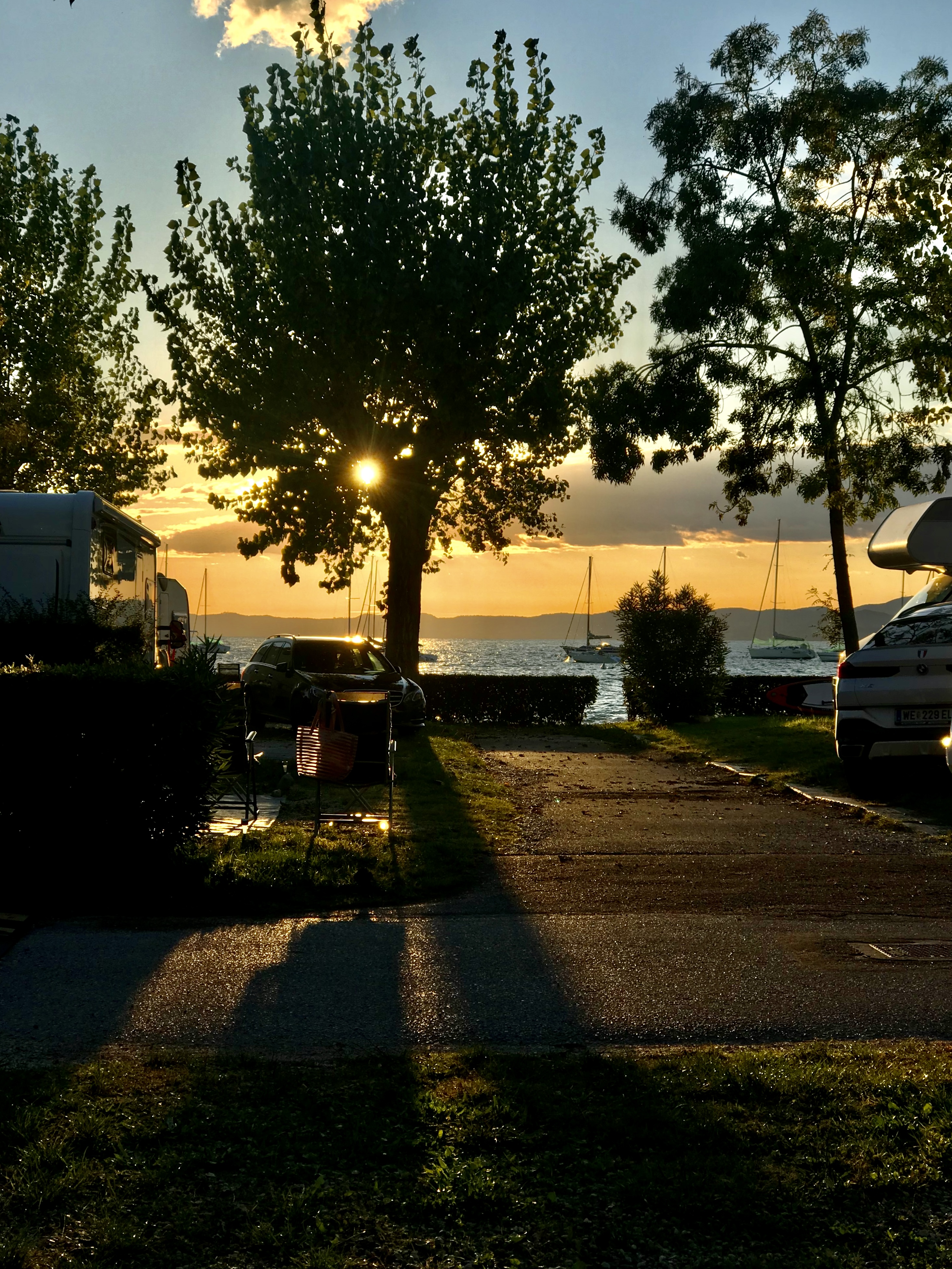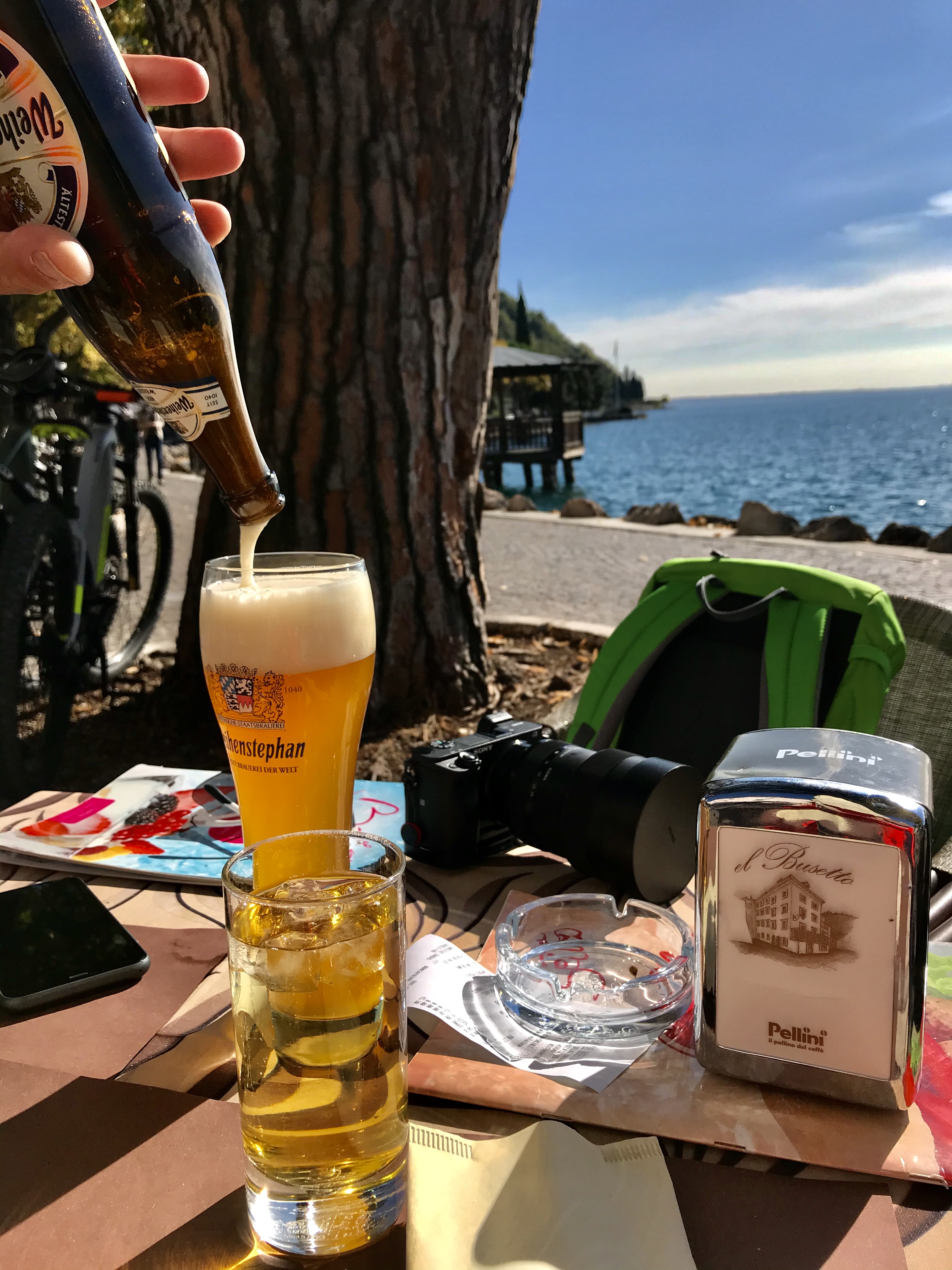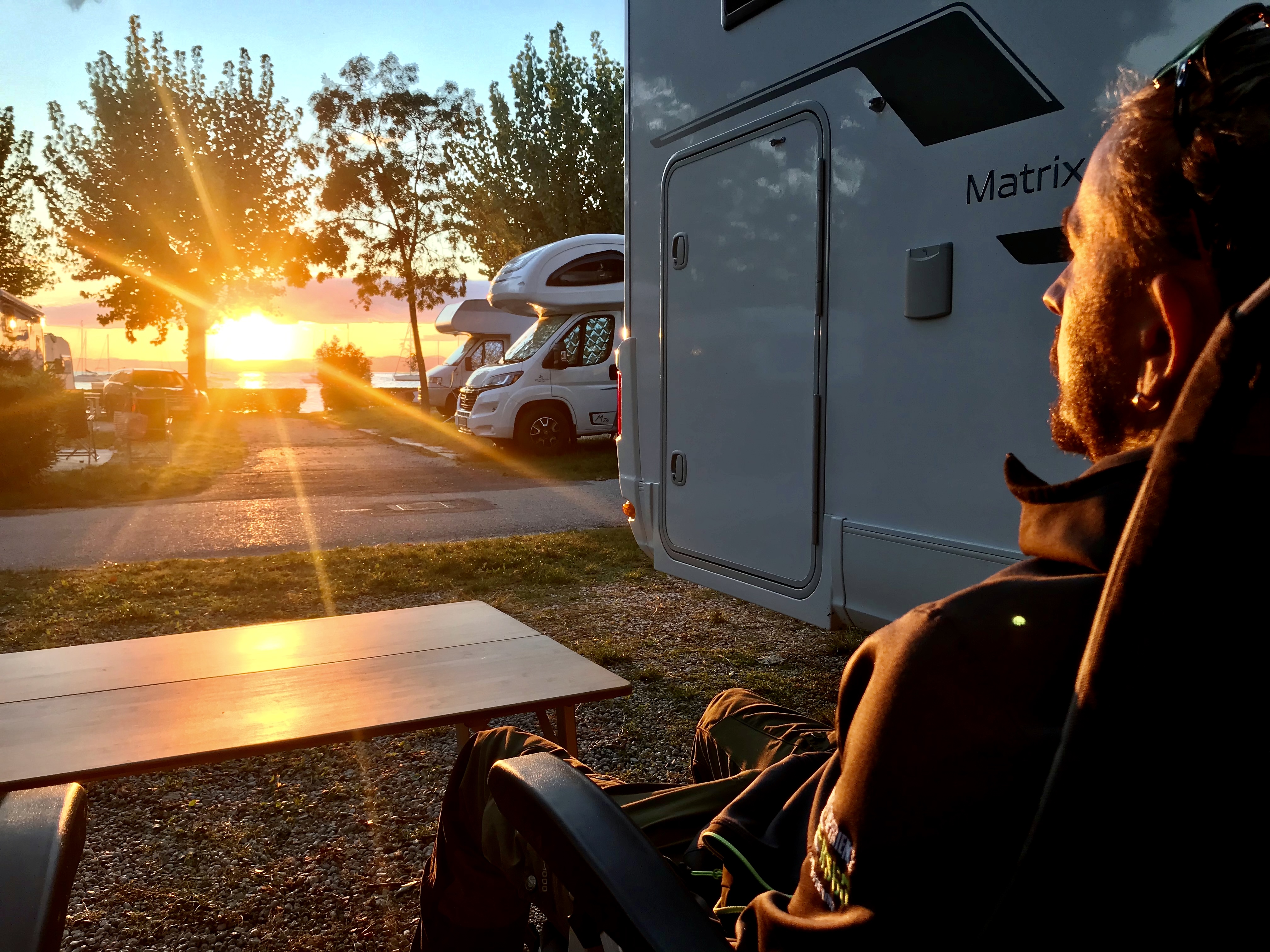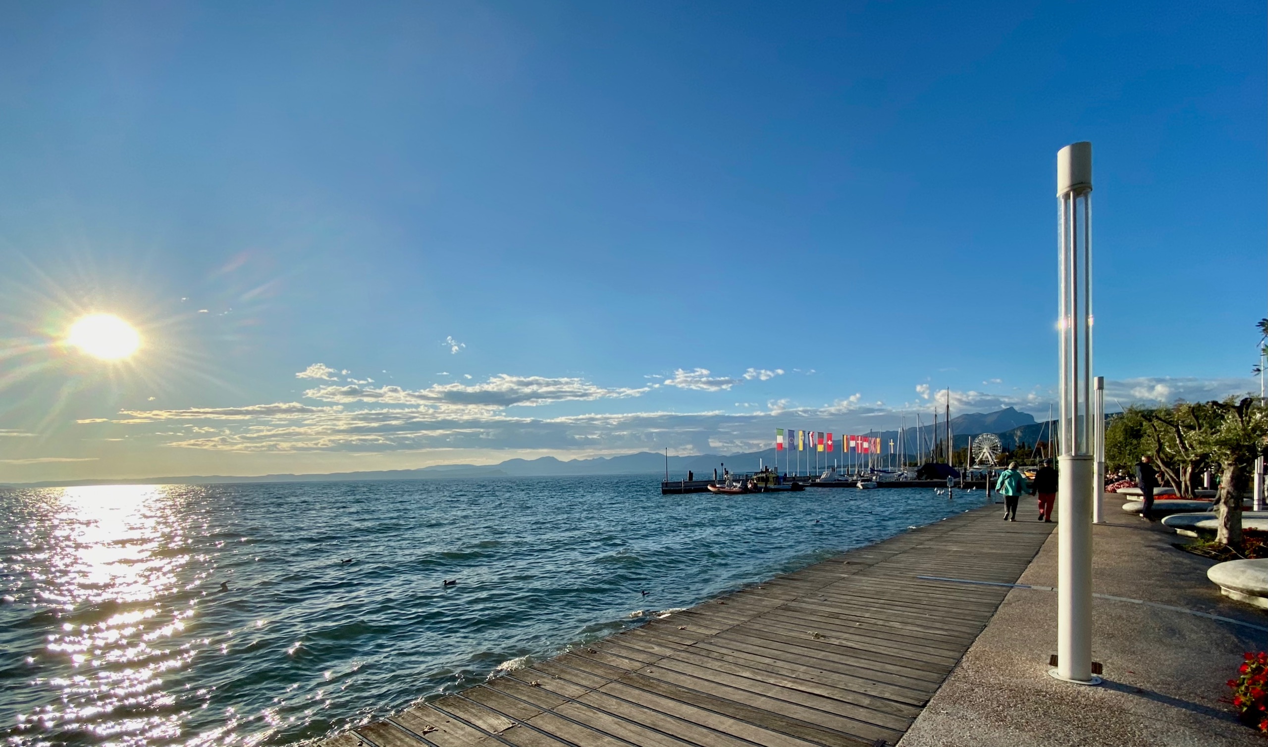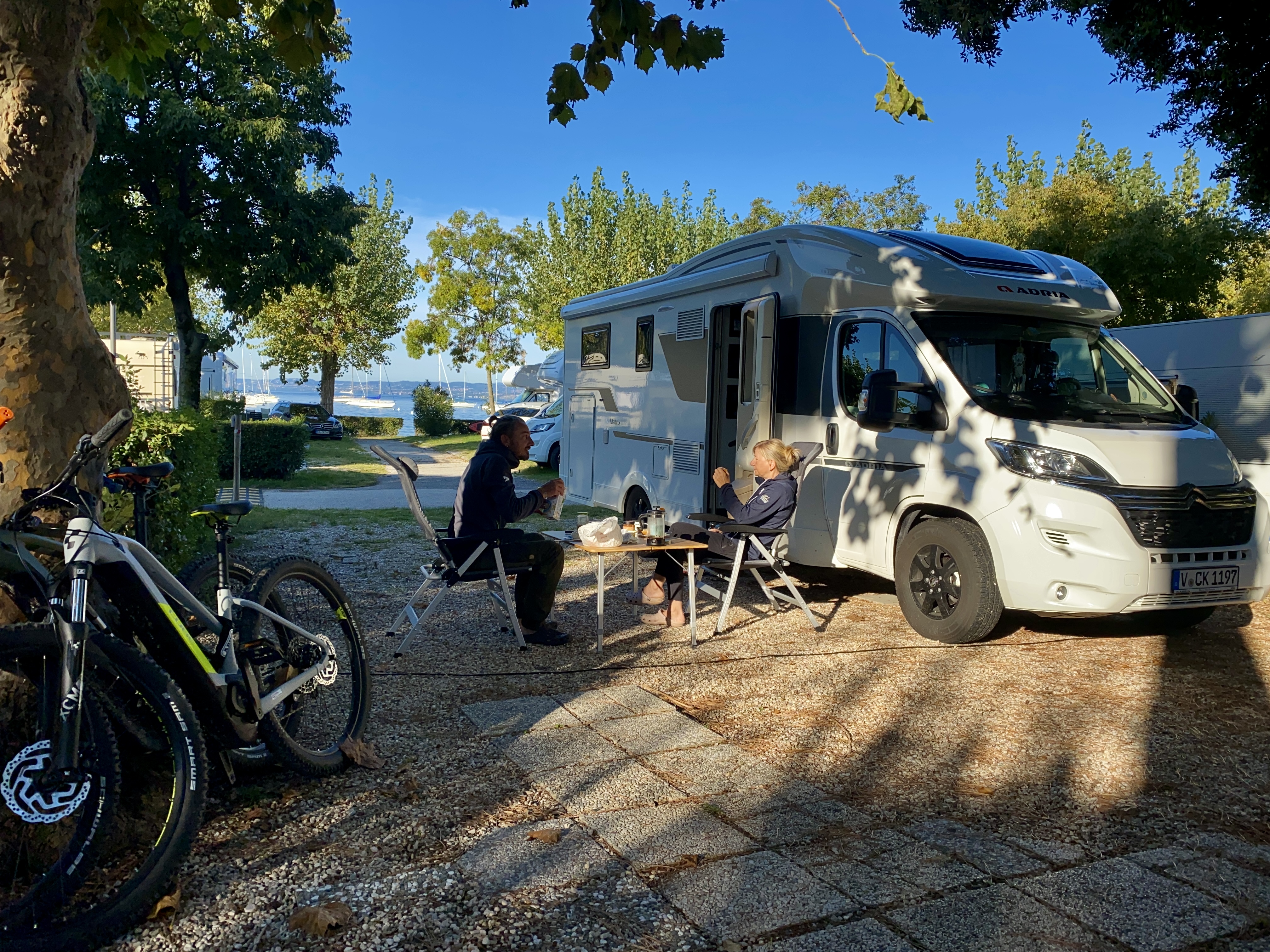 Es hat die ganze Nacht wie angesagt geregnet, aber nicht schlimm - wir haben ja eine festes Dach über dem Kopf. Als wir gegen 08:00 aufstehen klart es aber schon bisschen auf. Wir frühstücken gemütlich und entscheiden uns für eine Fahrradtour. Es geht über den Stadtrand von Affi über die Weinberge in Richtung Garda. 26 km mit unseren tollen Rädern machen auf dieser Tour wirklich viel Spass. Ob kleine Schotterwege oder Landstraße, jeder Untergrund wird gelassen gemeistert. Wir teilen uns in Garda am Hafen eine Pizza und das schöne Wetter wird in vollen Zügen genossen. Wir amüsieren uns über die ganzen Maskenschafe die vorbeilaufen. Es geht am Wasser zurück nach Bardolino. Wir chillen am Wohnmobil auf dem Campingplatz. Es sind immerhin ca. 21°C und da kann man doch schon von Sonnenbad reden. Gegen 17:00 raffen wir uns auf und radeln zum Eurospar. Unser Kühlschrank und die Reserven gehen zur Neige also müssen wir mal wieder bisschen „Bunkern“. 18:30 gönnen wir uns den tollen Sonnenuntergang und machen unser Abendessen. Noch ein paar Minuten aktuelle Politik, man kann sich ja auch im Urlaub weiter bilden.