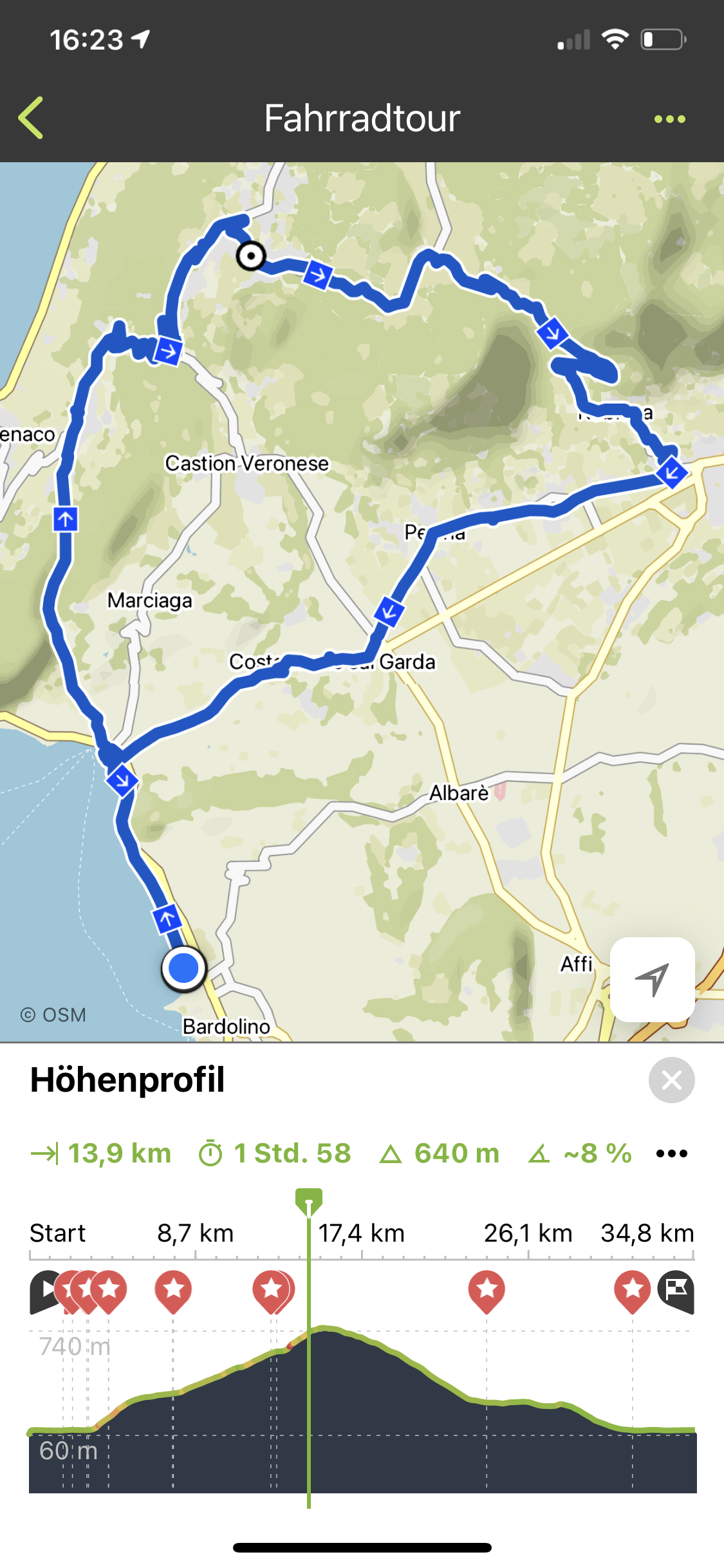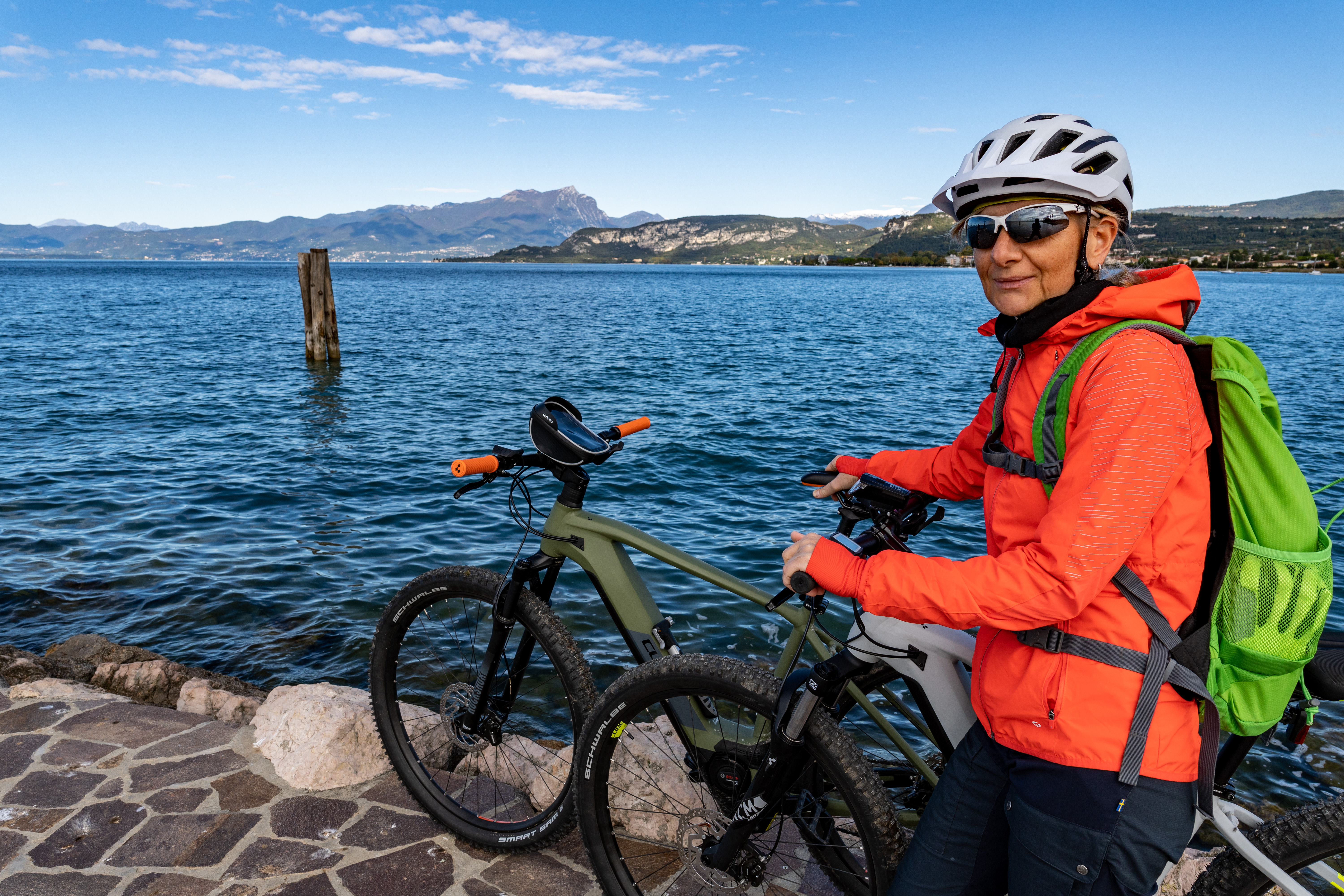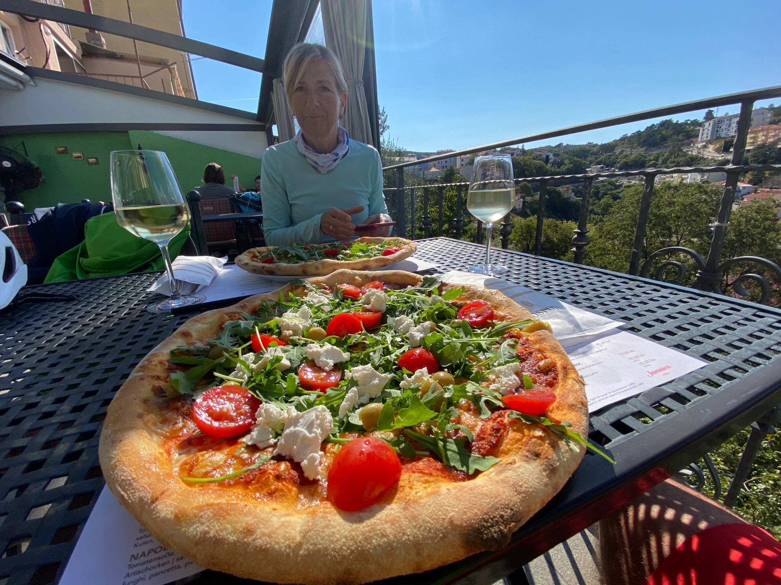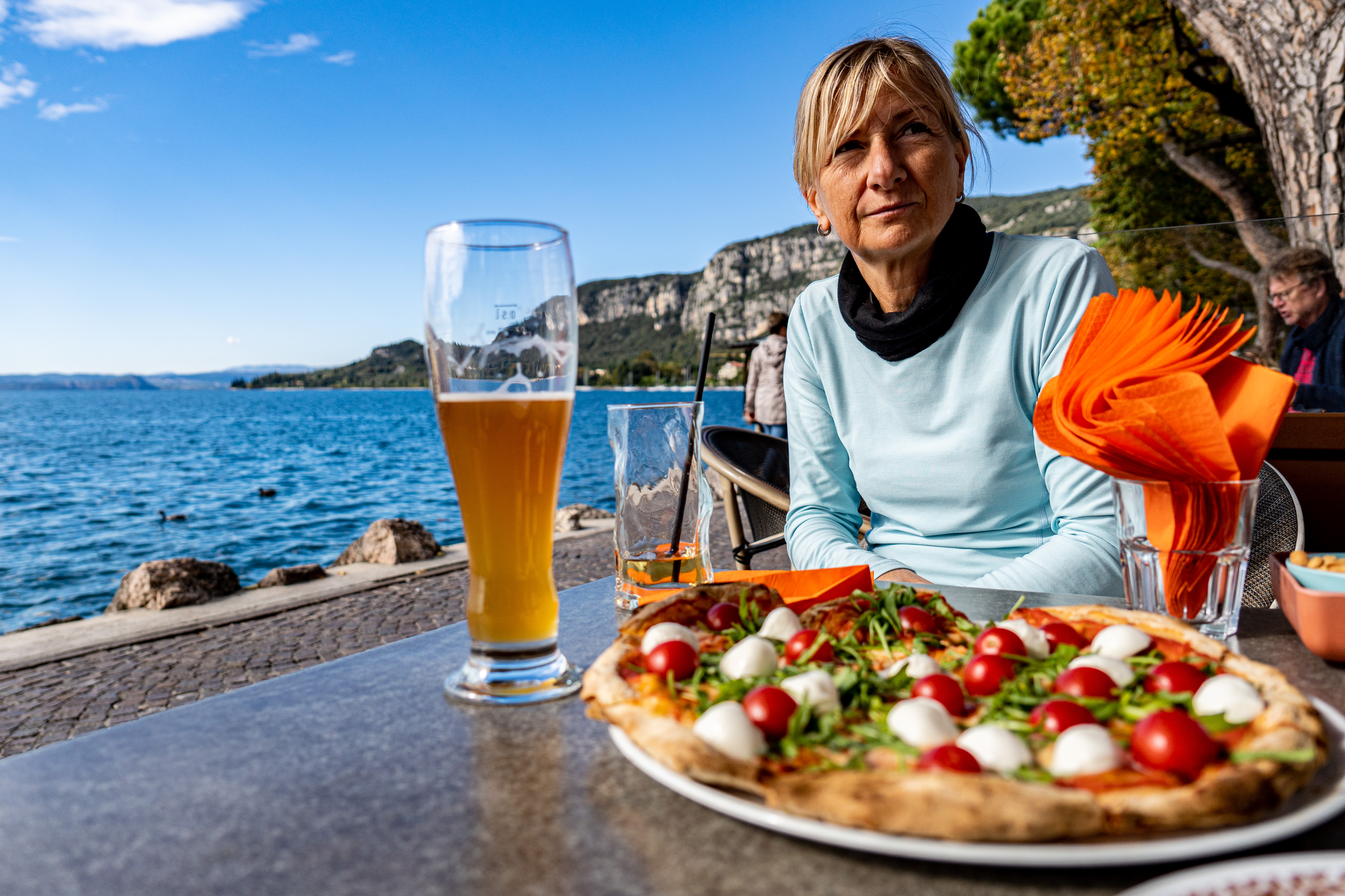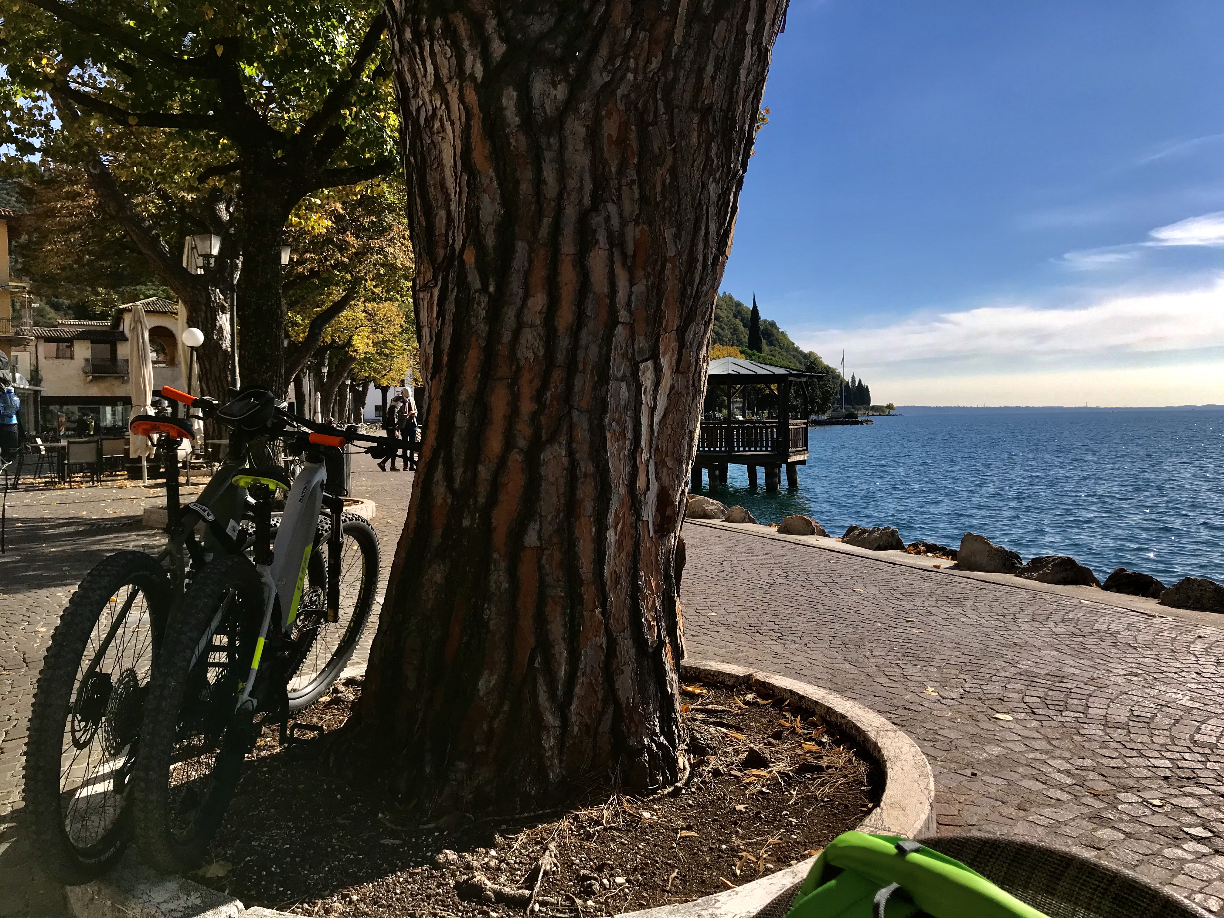 Wie es der Wetterbericht es vorhergesagt hatte, Topwetter. Wir stehen 08:30 auf und freuen uns über die lauen Temperaturen und frühstücken draußen. Bei dem tollen Wetter machen wir uns gegen 10:30 Uhr auf den Weg und radeln in die Berge oberhalb von Bardolino. Wir haben uns heute eine für unsere Verhältnisse schwierige Tour entschieden. Durchschnittlich 8% Steigung. Aber Dank dem starken Akku und 85Nm Drehmoment am Motor an unseren Bikes war das fast kein Problem, wir hatten nur die Restkapazität des Akkus falsch interpretiert, wir sind mit 5km Restlauf am Wohnmobil wieder angekommen. Unterwegs haben wir einen Snack in einem tollen Restaurant oberhalb des Gardasee`s genossen. Auf dem Rückweg haben wir wieder eine Pizza in Garda am Hafen „genascht“. :-)