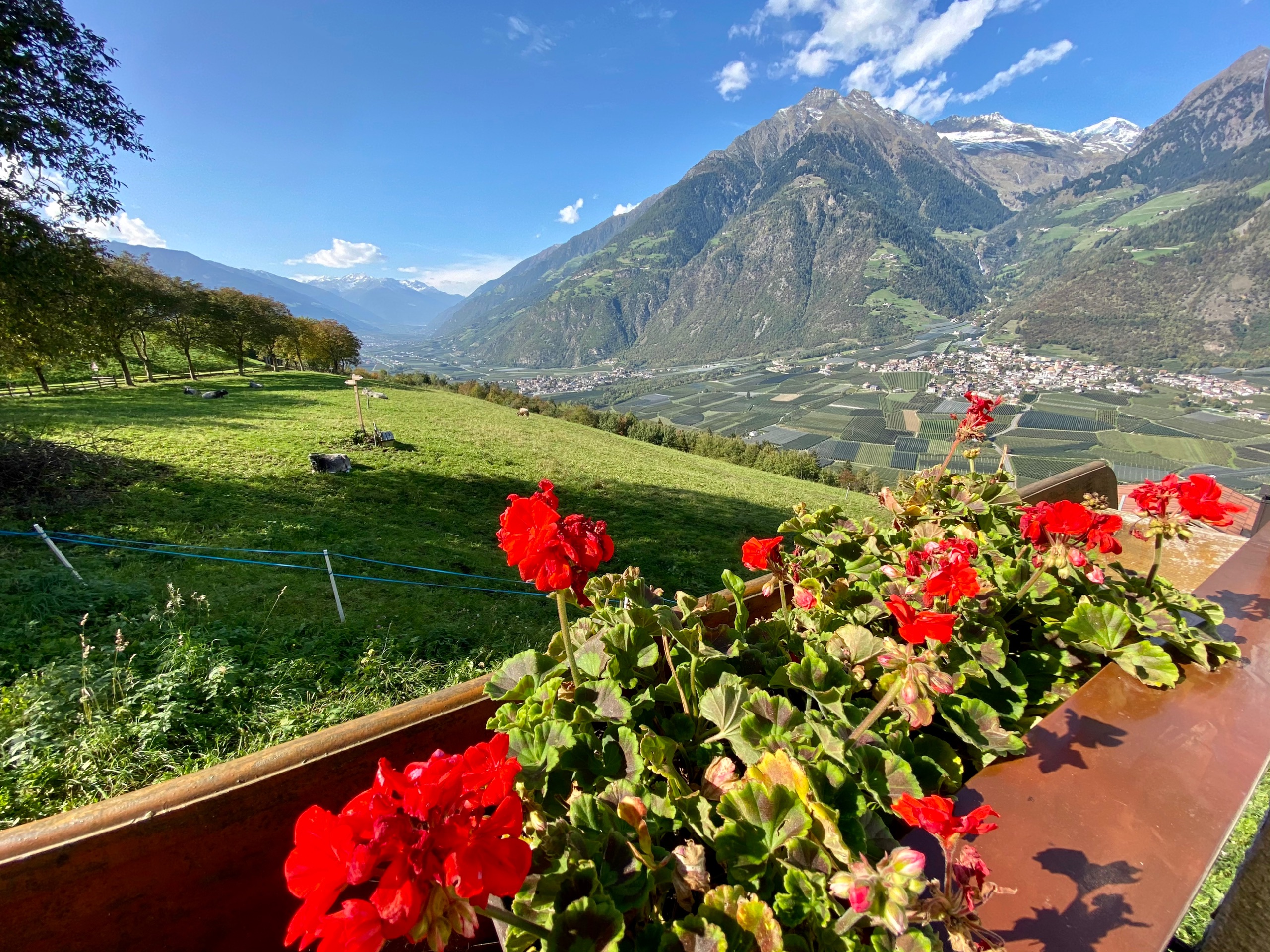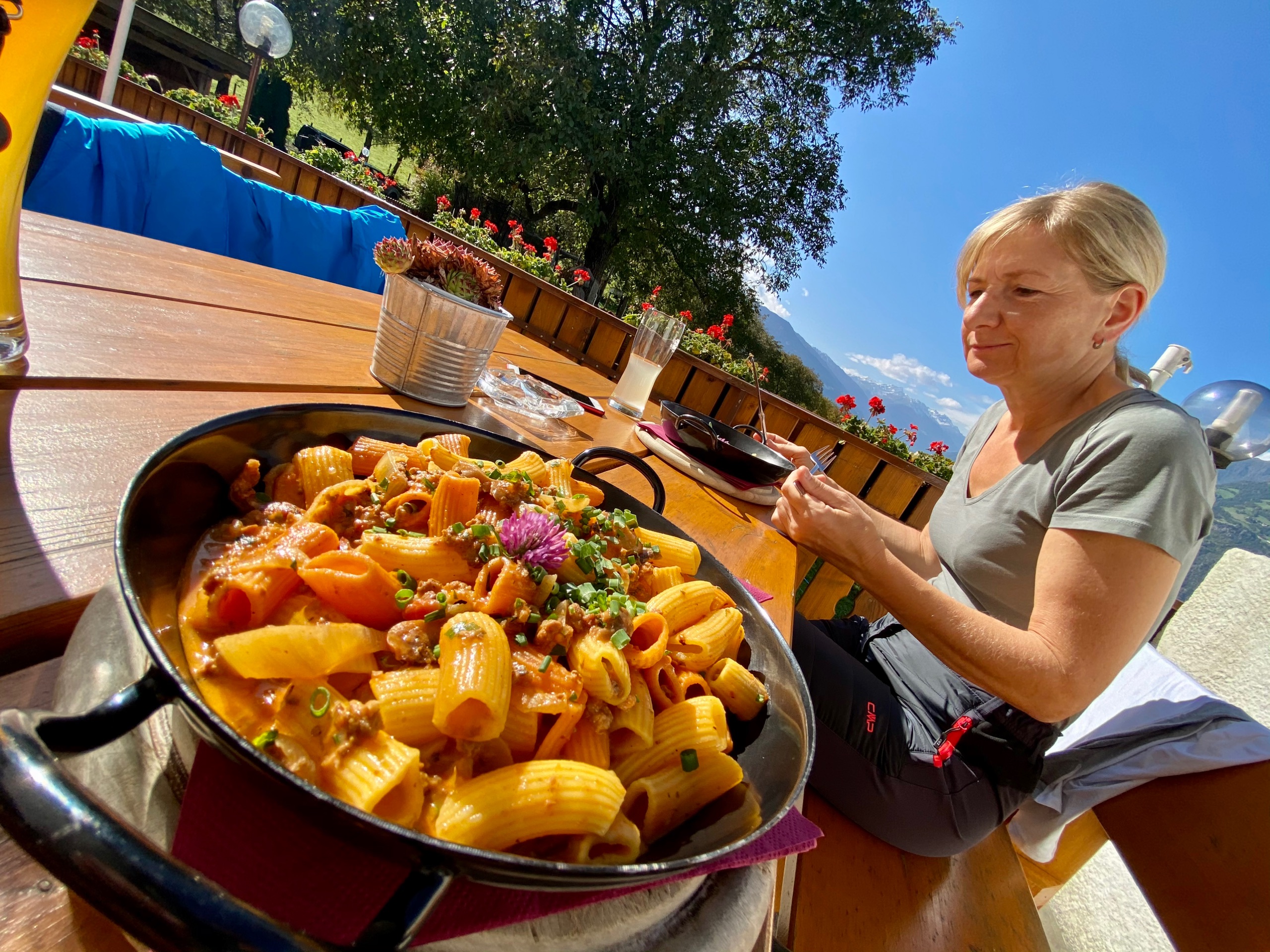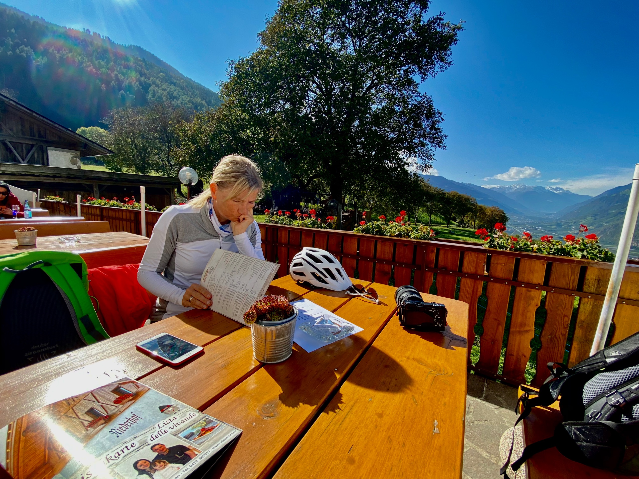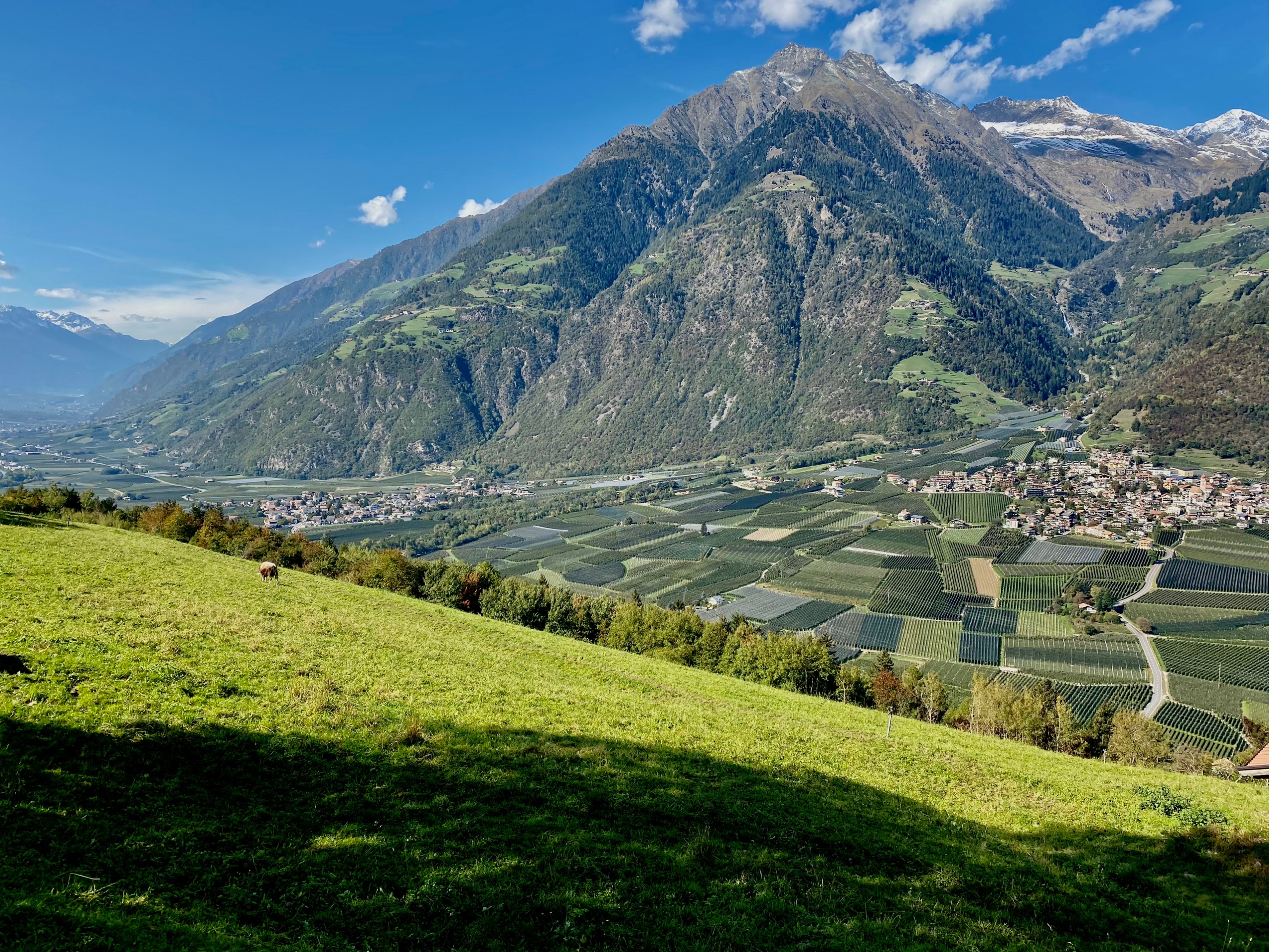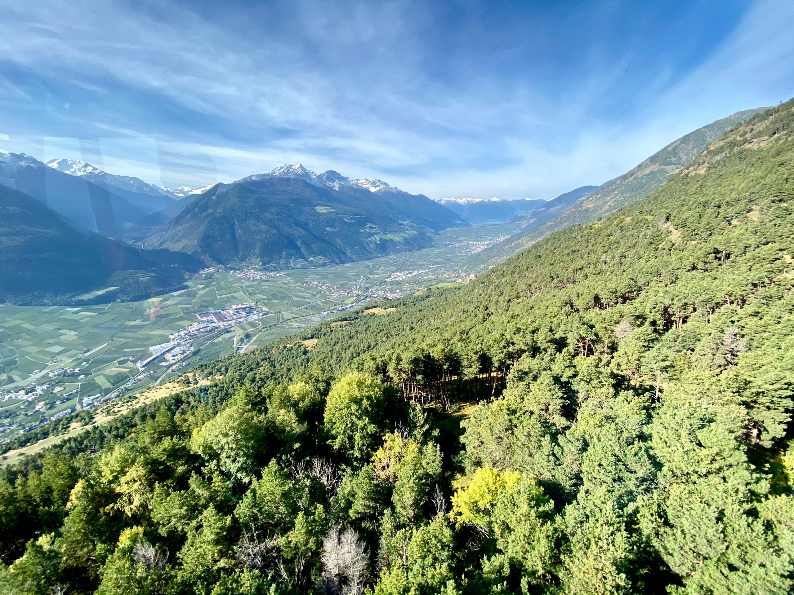 Heute steht wandern ganz gross auf dem Plan. Wir stehen schön gechillt auf, denn da wo wir hin wollen ist es morgens doch noch etwas frisch. Wir starten den Tag mit frischen Brötchen und Kaffee, schlüpfen in die neuen Wanderklamotten und los geht es zur Talstation der St. Martin Seilbahn in Latsch. Mit einer mächtigen Rabattkarte vom Campingplatz ausgestattet wird uns beim bezahlen ein Rabatt von 2,-€ gewährt, wir zahlen also für Berg -und Talfahrt 24,-€ für zwei Erwachsene. Supi. Auf 1.740m ü. NN ist die Bergfahrt dann nach 8 Minuten schon wieder beendet, dafür haben wir uns einen stundenlangen Anstieg gespart. Wir laufen laut Komoot, der Wanderführer verspricht 5,8 km in zwei Stunden. Kein Problem, wir sind ja geübt. Wir kommen am Dolomitenblick vorbei, von wo aus man tatsächlich einen herrlichen Blick auf eben jene genießen kann. Zurück an der Bergstation der Seilbahn genehmigen wir uns eine gemischte Jause nebst zwei Fritatensuppen und ein schönes Hefeweizen. Talfahrt. Chillen. Tag vorbei :-) - wir haben ja Urlaub.