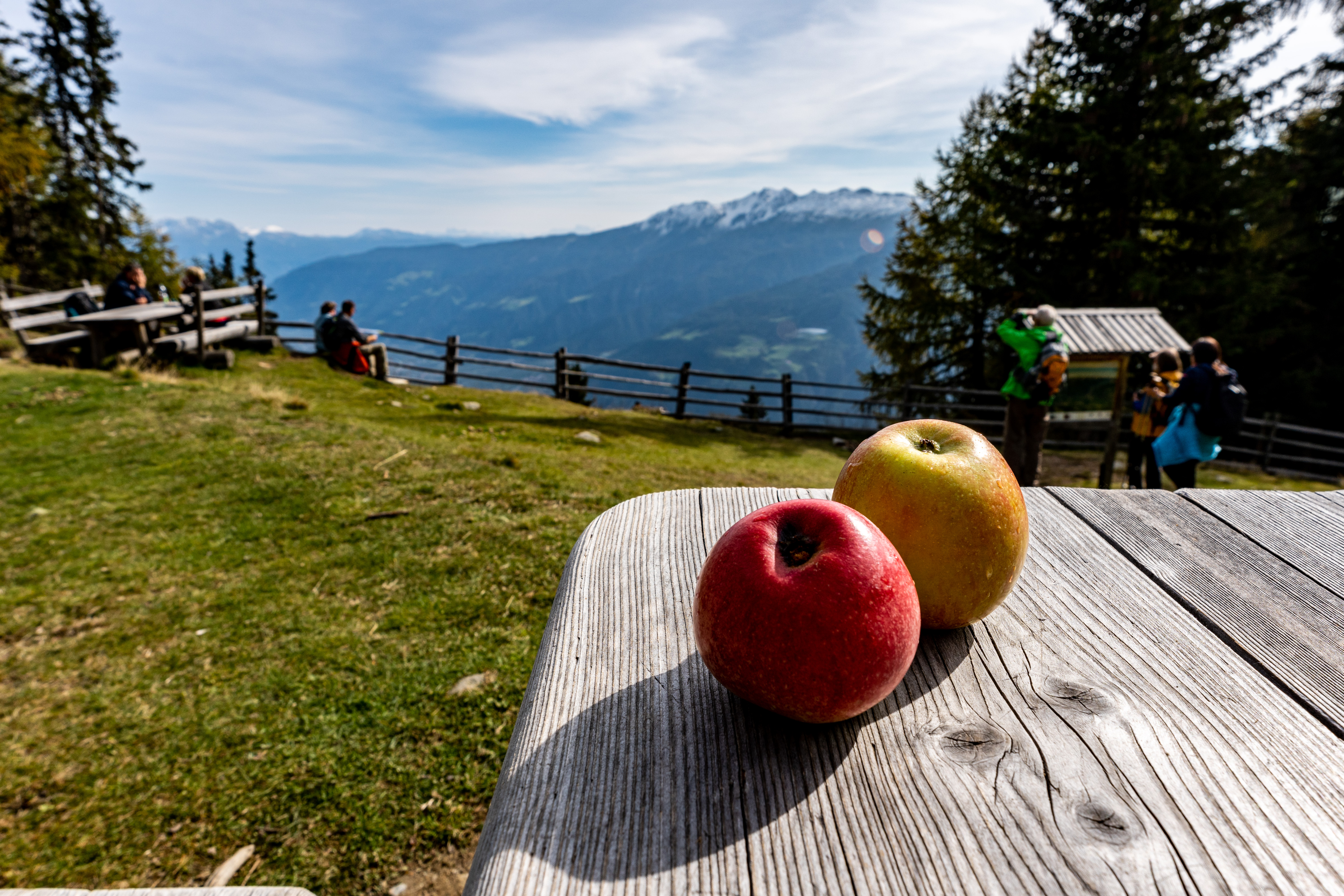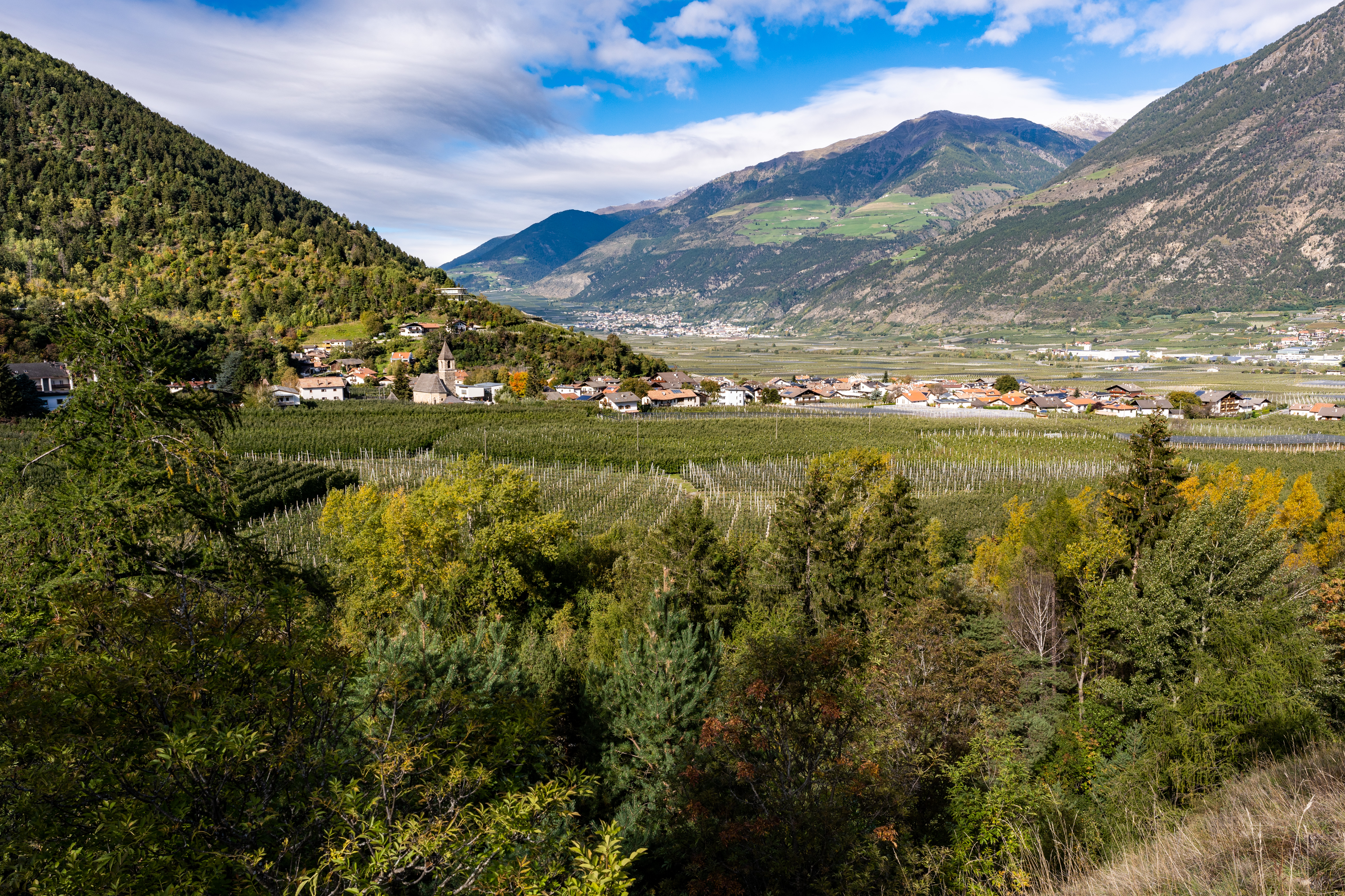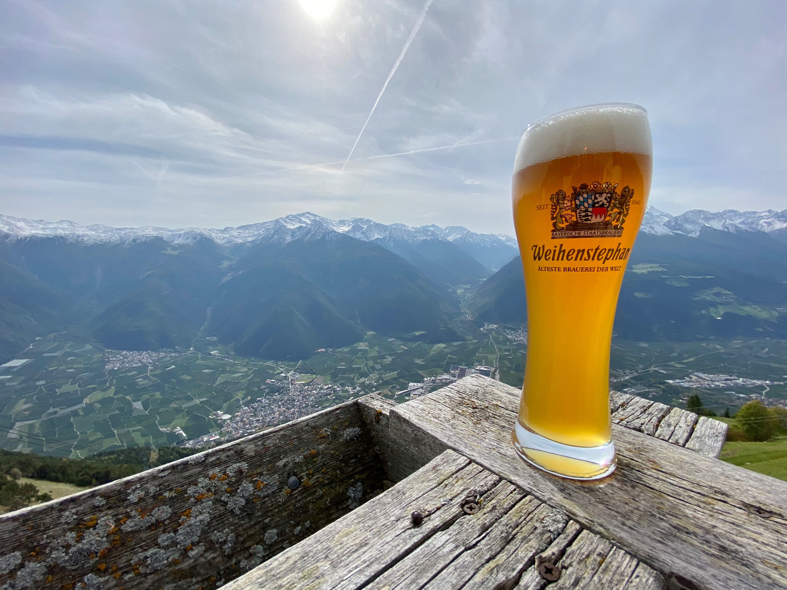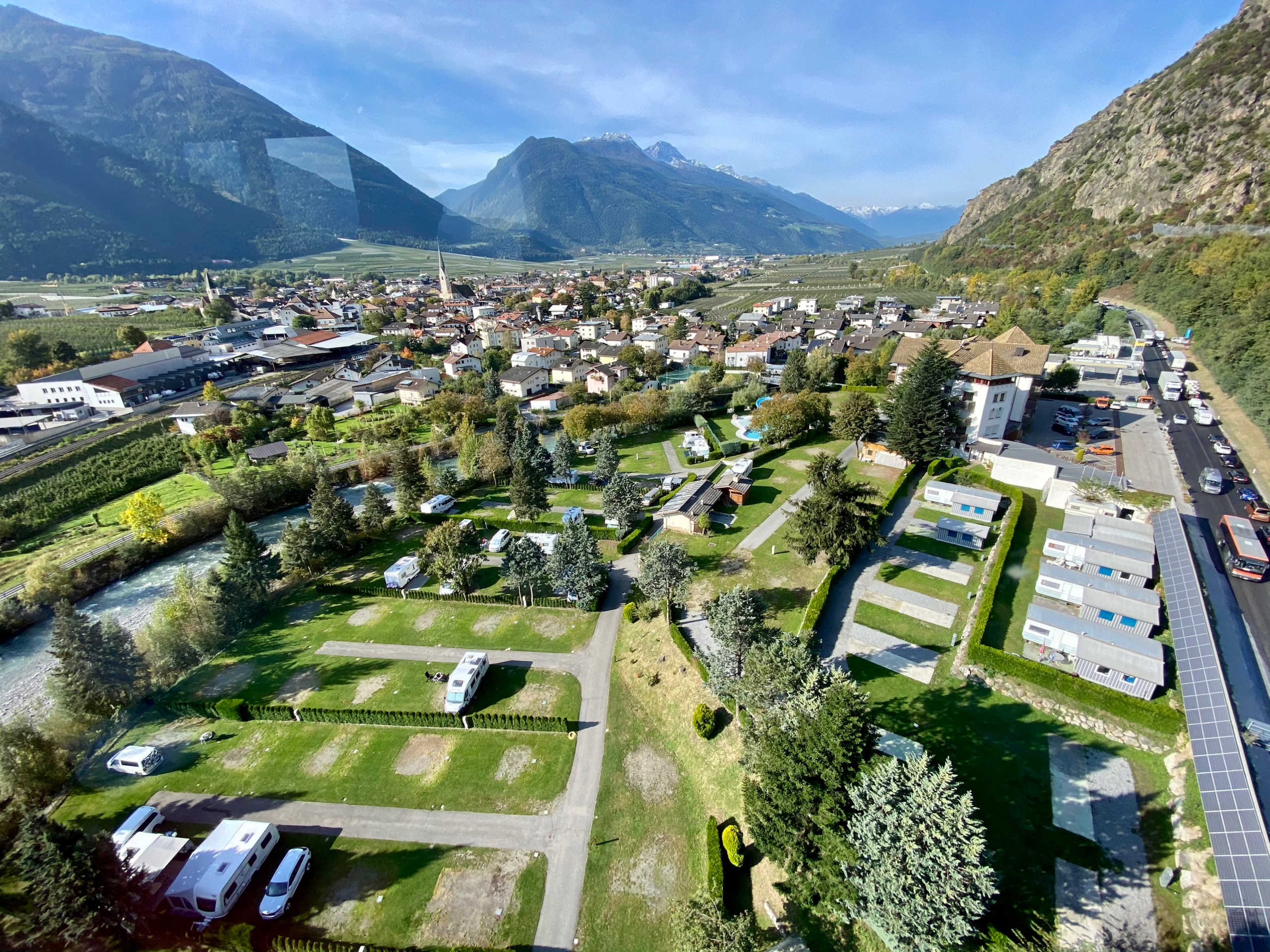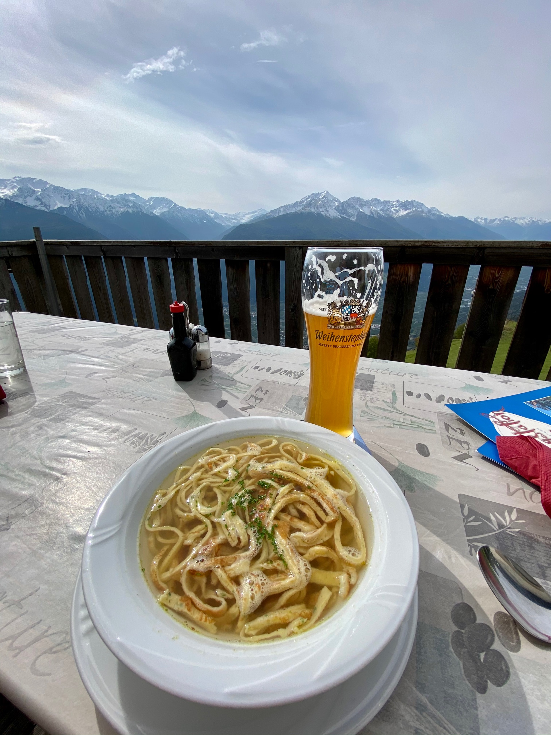 Heute steht wandern ganz gross auf dem Plan. Wir stehen schön gechillt auf, denn da wo wir hin wollen ist es morgens doch noch etwas frisch. Wir starten den Tag mit frischen Brötchen und Kaffee, schlüpfen in die neuen Wanderklamotten und los geht es zur Talstation der St. Martin Seilbahn in Latsch. Mit einer mächtigen Rabattkarte vom Campingplatz ausgestattet wird uns beim bezahlen ein Rabatt von 2,-€ gewährt, wir zahlen also für Berg -und Talfahrt 24,-€ für zwei Erwachsene. Supi. Auf 1.740m ü. NN ist die Bergfahrt dann nach 8 Minuten schon wieder beendet, dafür haben wir uns einen stundenlangen Anstieg gespart. Wir laufen laut Komoot, der Wanderführer verspricht 5,8 km in zwei Stunden. Kein Problem, wir sind ja geübt. Wir kommen am Dolomitenblick vorbei, von wo aus man tatsächlich einen herrlichen Blick auf eben jene genießen kann. Zurück an der Bergstation der Seilbahn genehmigen wir uns eine gemischte Jause nebst zwei Fritatensuppen und ein schönes Hefeweizen. Talfahrt. Chillen. Tag vorbei :-) - wir haben ja Urlaub.