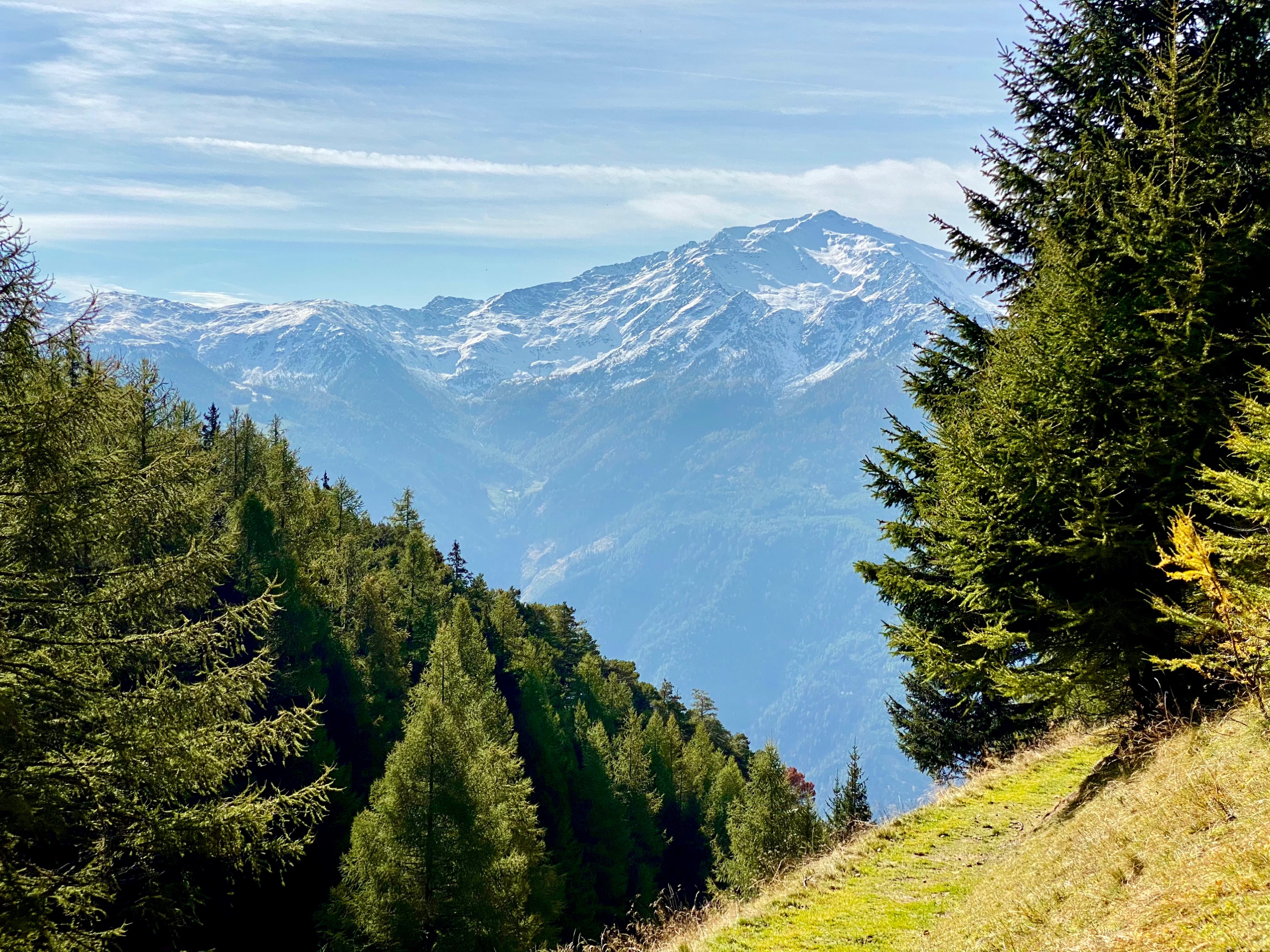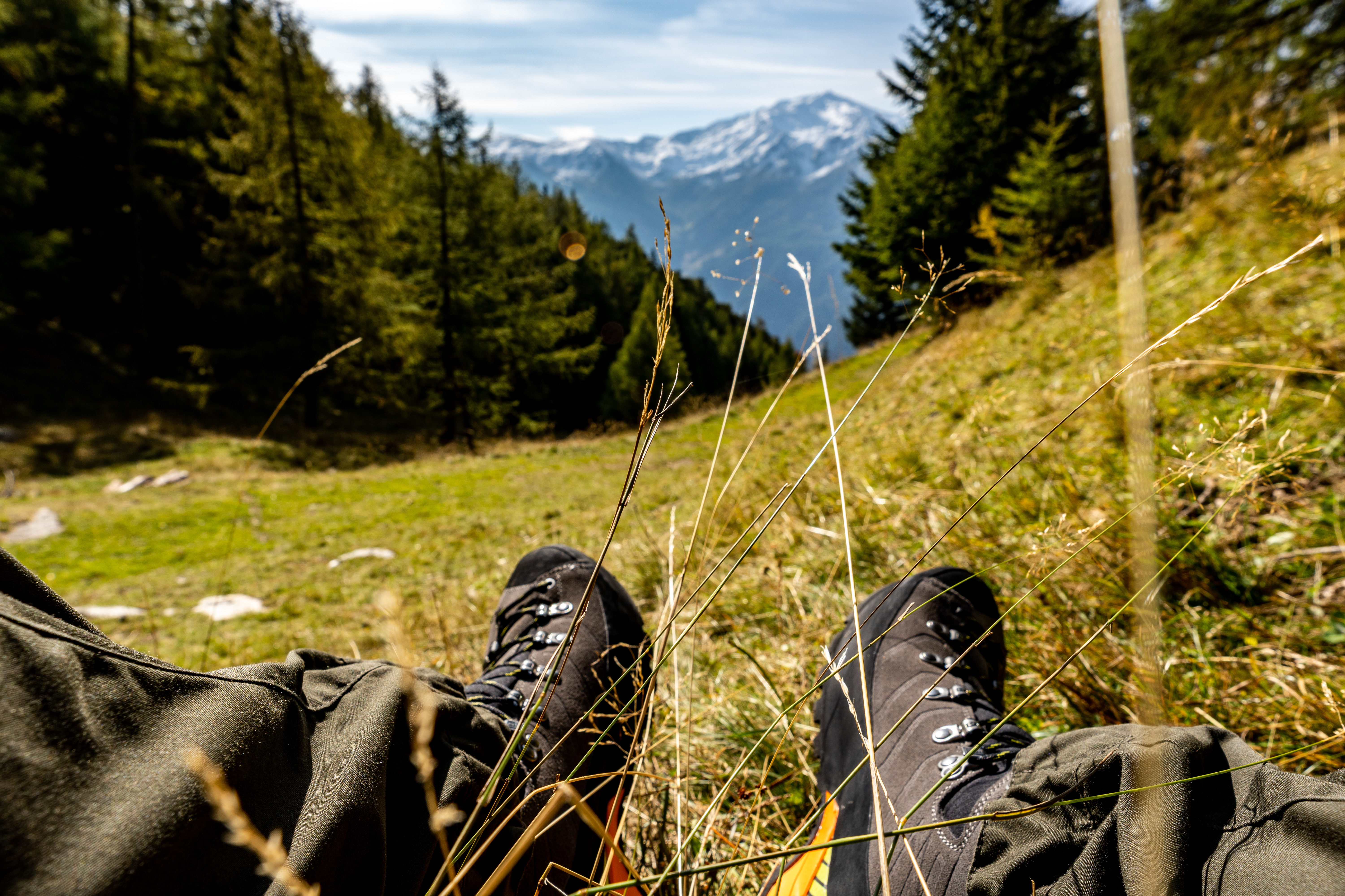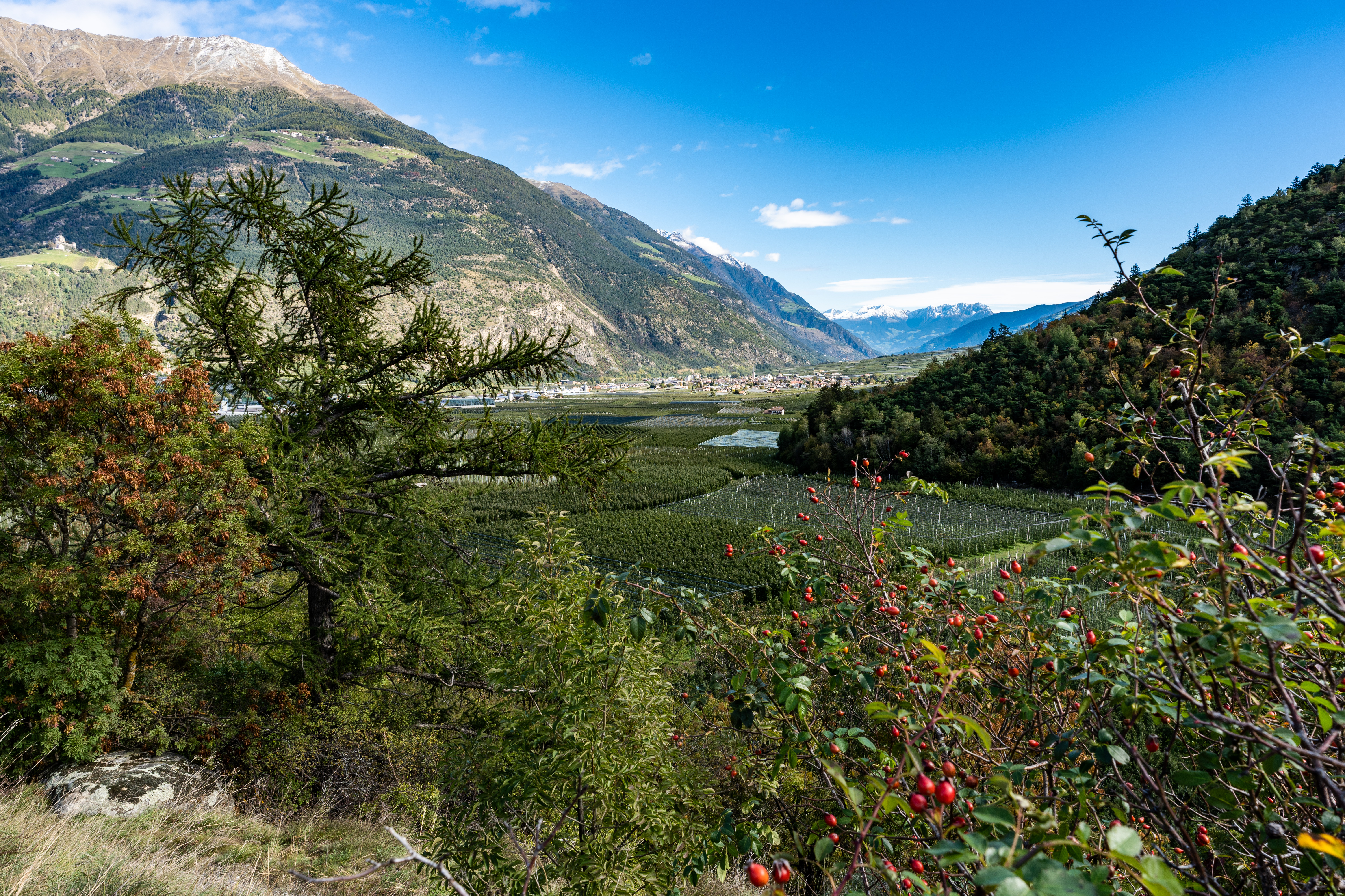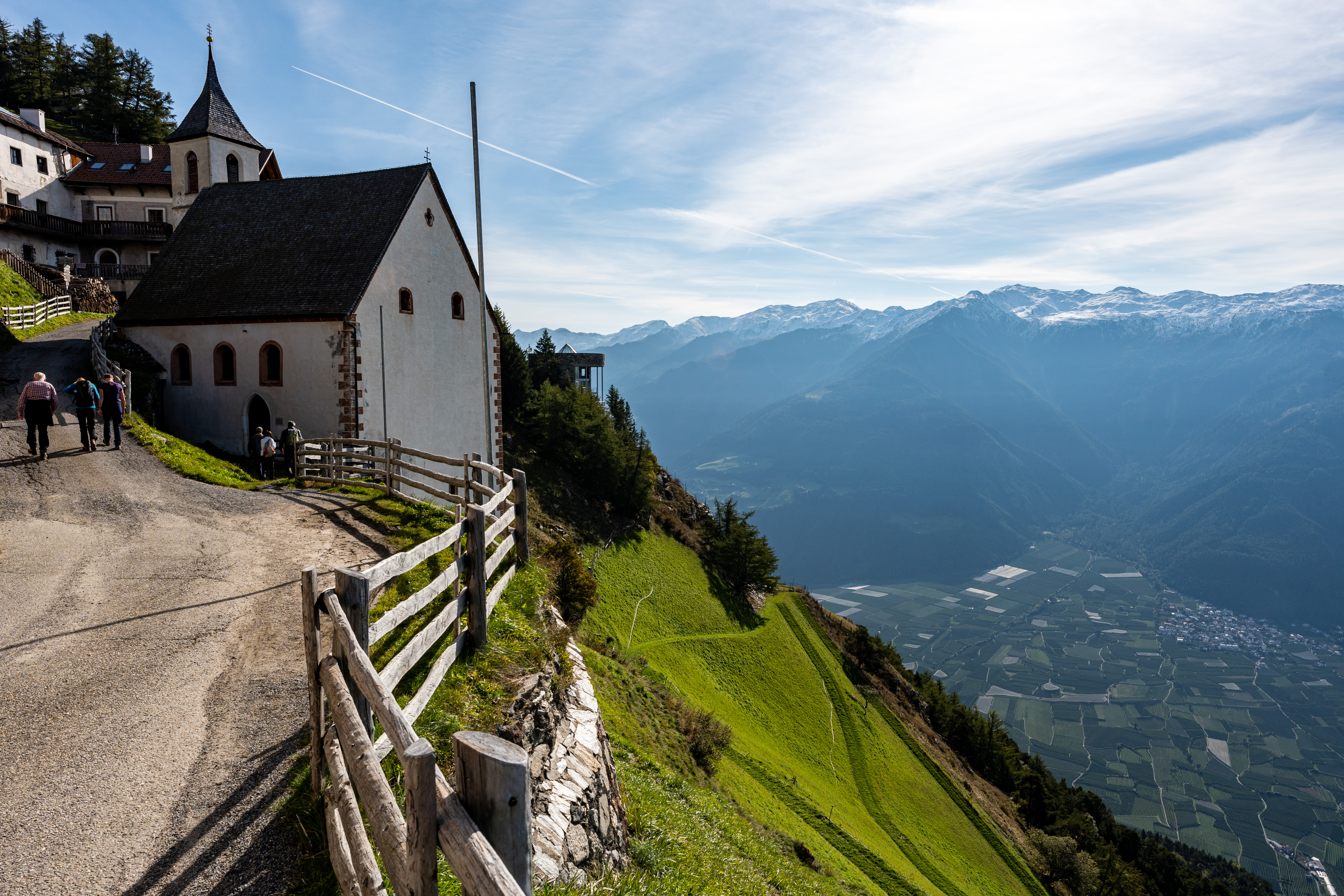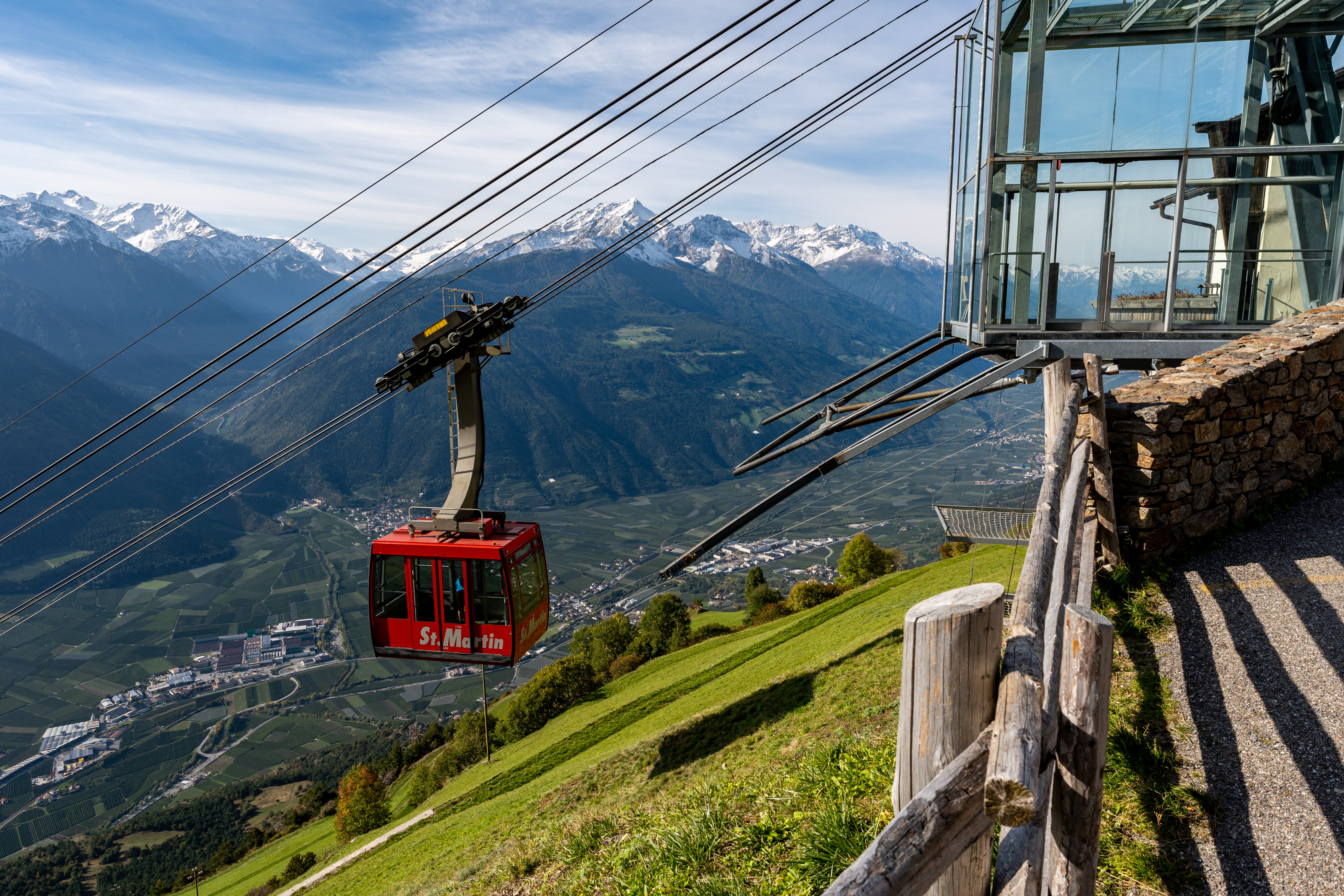 Heute steht wandern ganz gross auf dem Plan. Wir stehen schön gechillt auf, denn da wo wir hin wollen ist es morgens doch noch etwas frisch. Wir starten den Tag mit frischen Brötchen und Kaffee, schlüpfen in die neuen Wanderklamotten und los geht es zur Talstation der St. Martin Seilbahn in Latsch. Mit einer mächtigen Rabattkarte vom Campingplatz ausgestattet wird uns beim bezahlen ein Rabatt von 2,-€ gewährt, wir zahlen also für Berg -und Talfahrt 24,-€ für zwei Erwachsene. Supi. Auf 1.740m ü. NN ist die Bergfahrt dann nach 8 Minuten schon wieder beendet, dafür haben wir uns einen stundenlangen Anstieg gespart. Wir laufen laut Komoot, der Wanderführer verspricht 5,8 km in zwei Stunden. Kein Problem, wir sind ja geübt. Wir kommen am Dolomitenblick vorbei, von wo aus man tatsächlich einen herrlichen Blick auf eben jene genießen kann. Zurück an der Bergstation der Seilbahn genehmigen wir uns eine gemischte Jause nebst zwei Fritatensuppen und ein schönes Hefeweizen. Talfahrt. Chillen. Tag vorbei :-) - wir haben ja Urlaub.