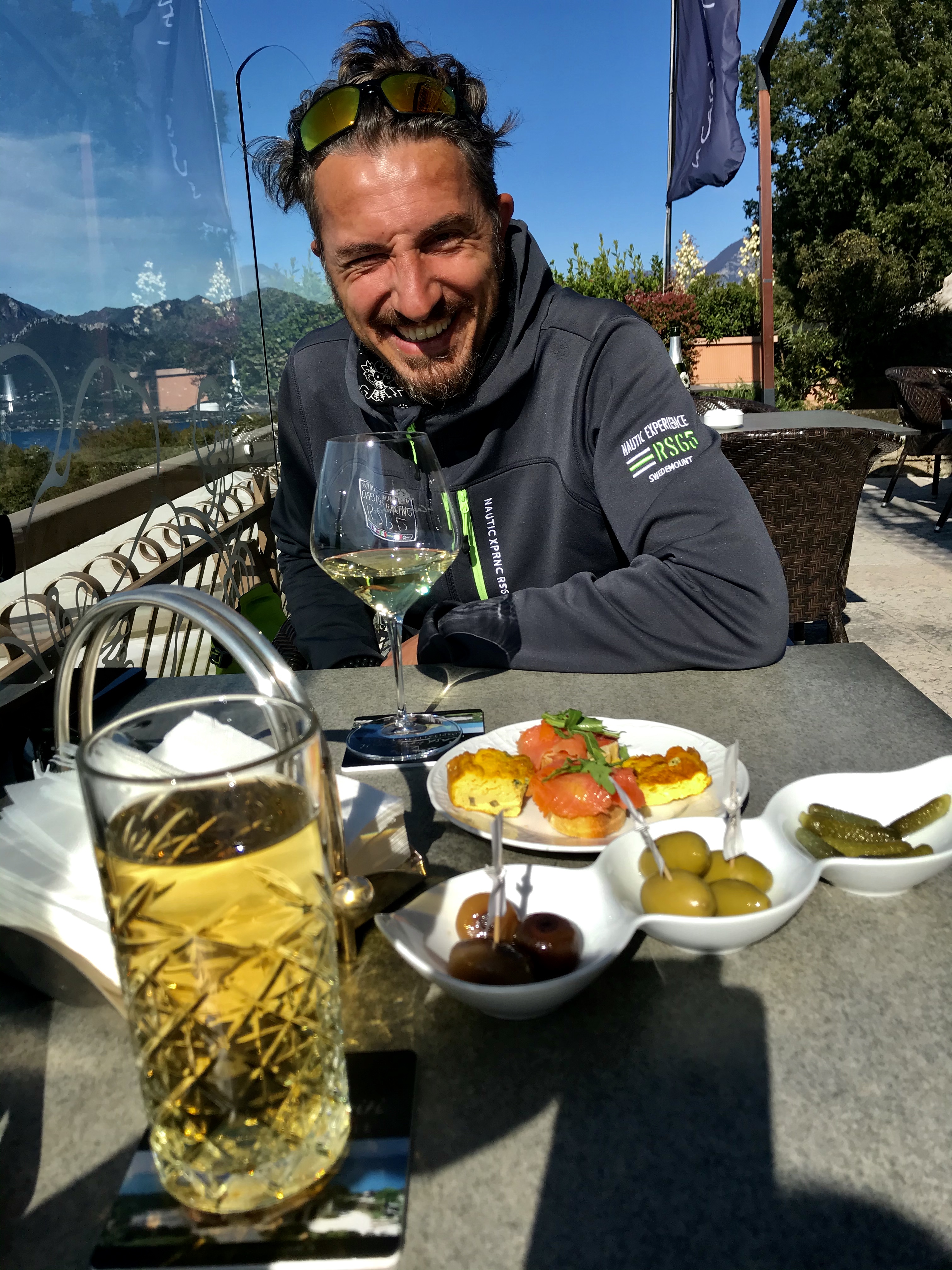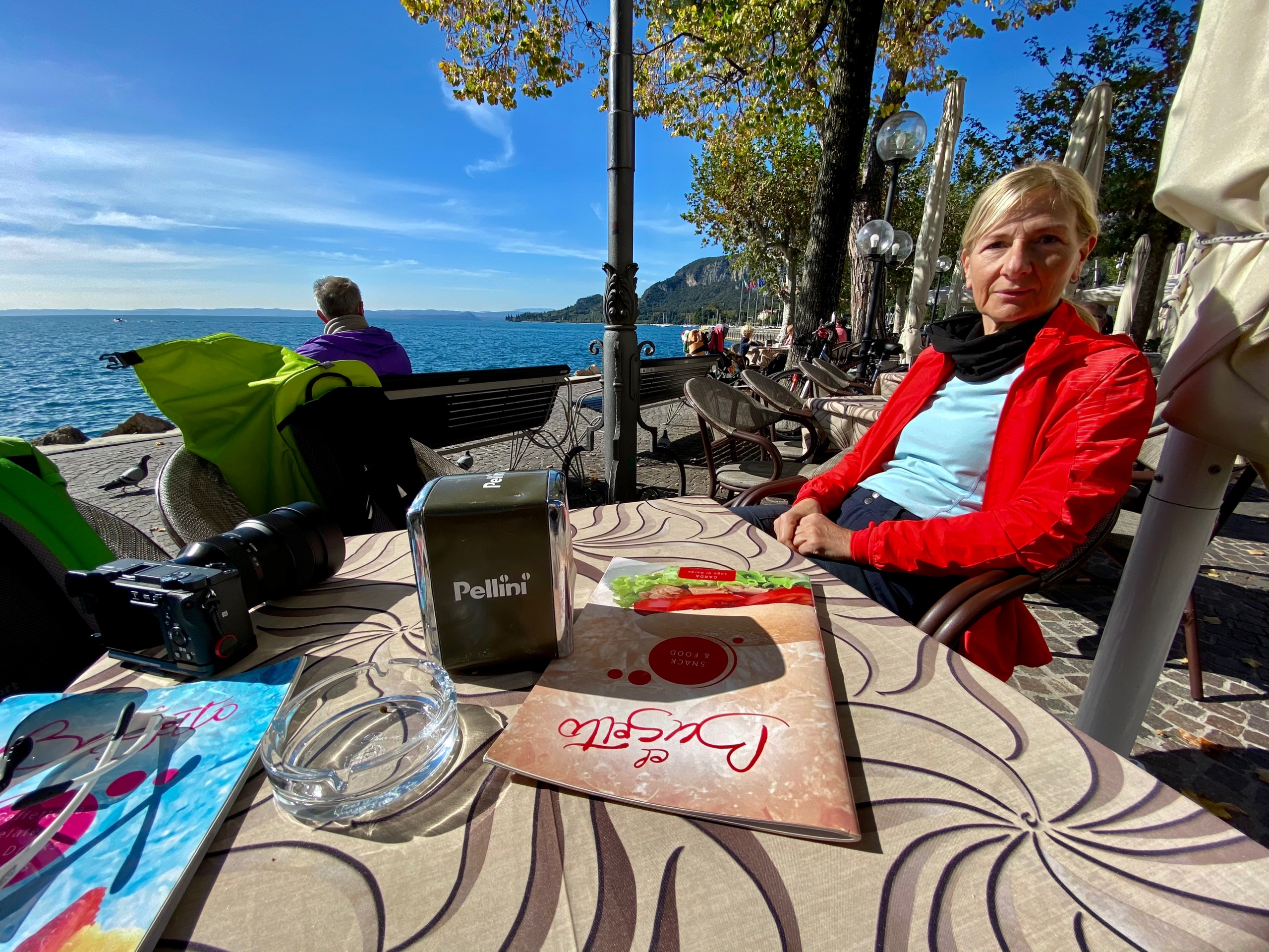 Zurück am Wohnmobil war Vitamin D-Produktion angesagt. Wir chillen und trinken ein „Weinchen“. 17:00 schmeißen wir uns in die Ausgehklamotten und schlendern vor nach Bardolino - wir wollen noch ein paar Besorgungen für das Abendessen machen und mal einen Blick in die lokalen Klamottenläden werfen. Erfolg, toller Pullover für Katja und eine Hose und Jäckchen für Christian. Tomaten, in Balsamico eingelegte Zwiebeln, Ziegenkäse und ein paar Birnen. Wir essen gemütlich um 19:00 Uhr und jetzt sind wir biss`l croggi. Mal sehen was wir morgen machen. Wird wohl noch eine letzte Radtour am Gardasee werden, Akku`s laden jedenfalls heute mal richtig voll.