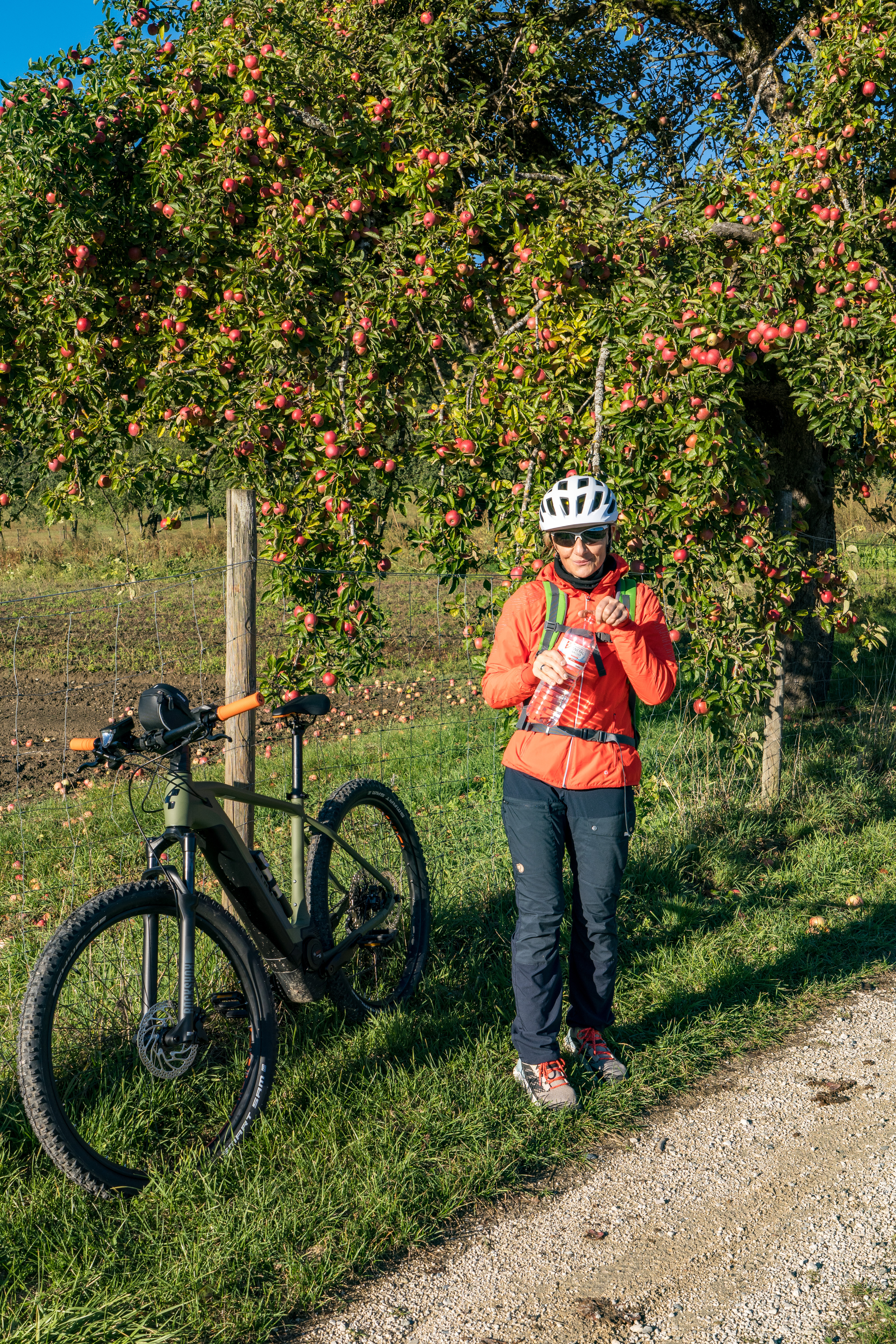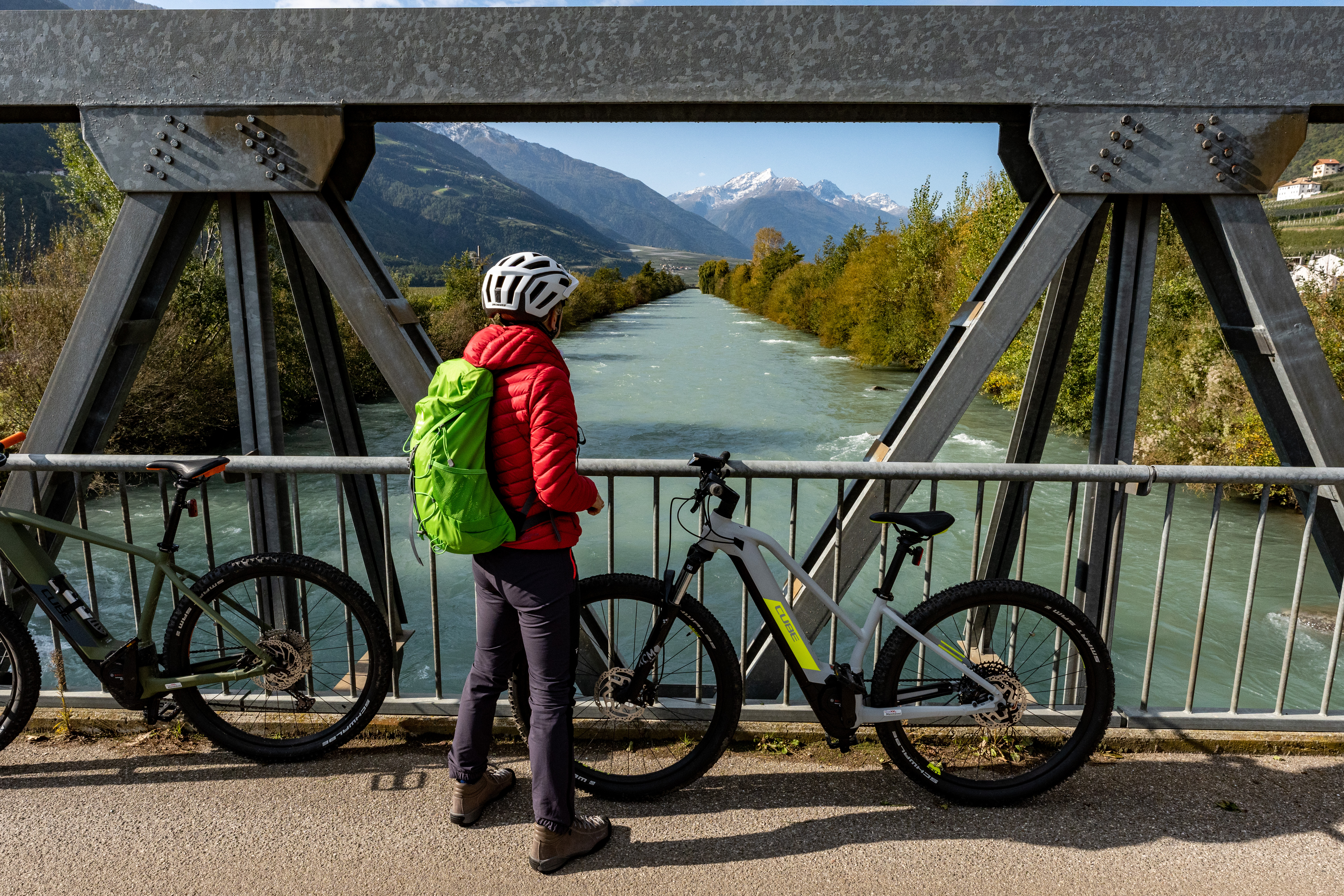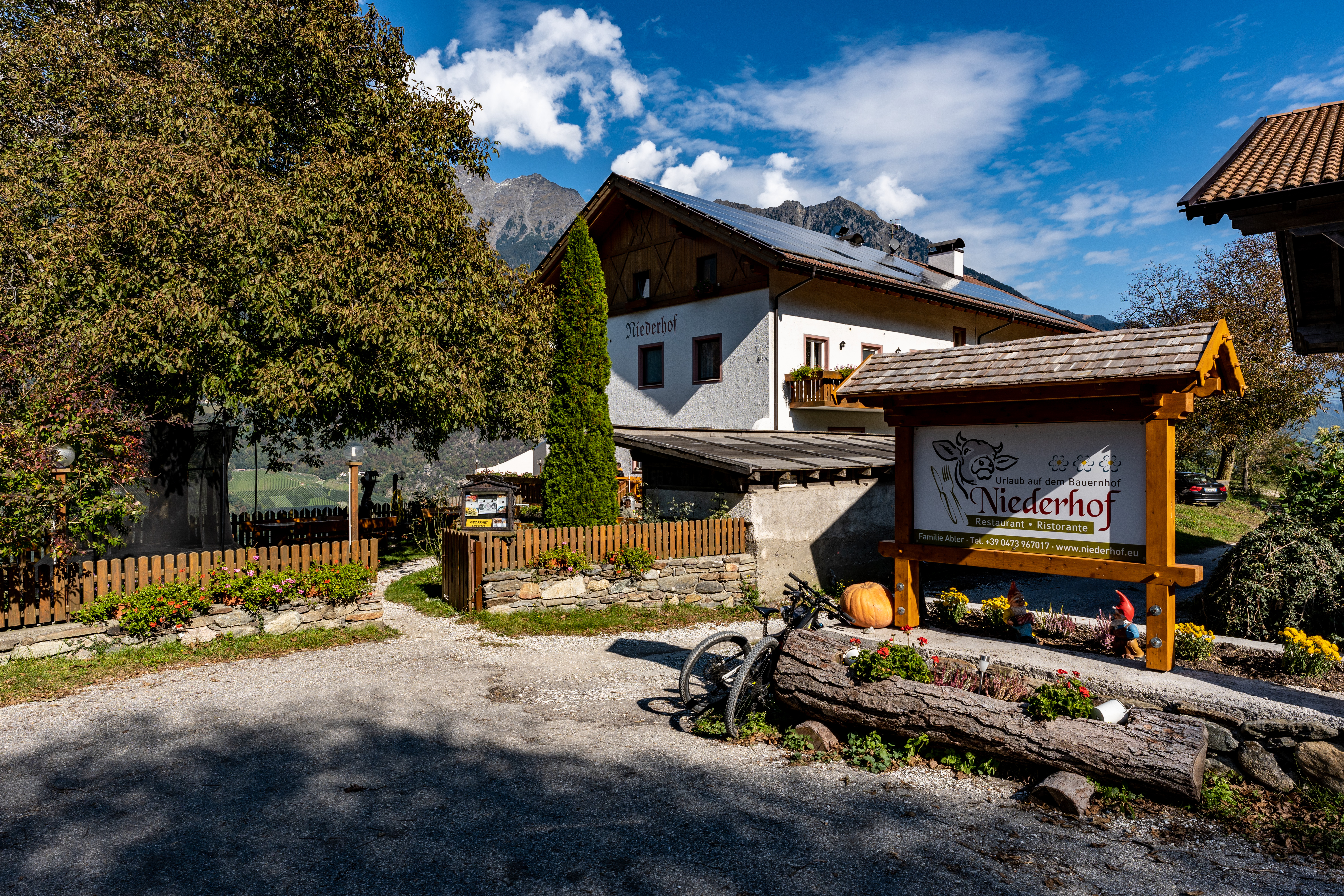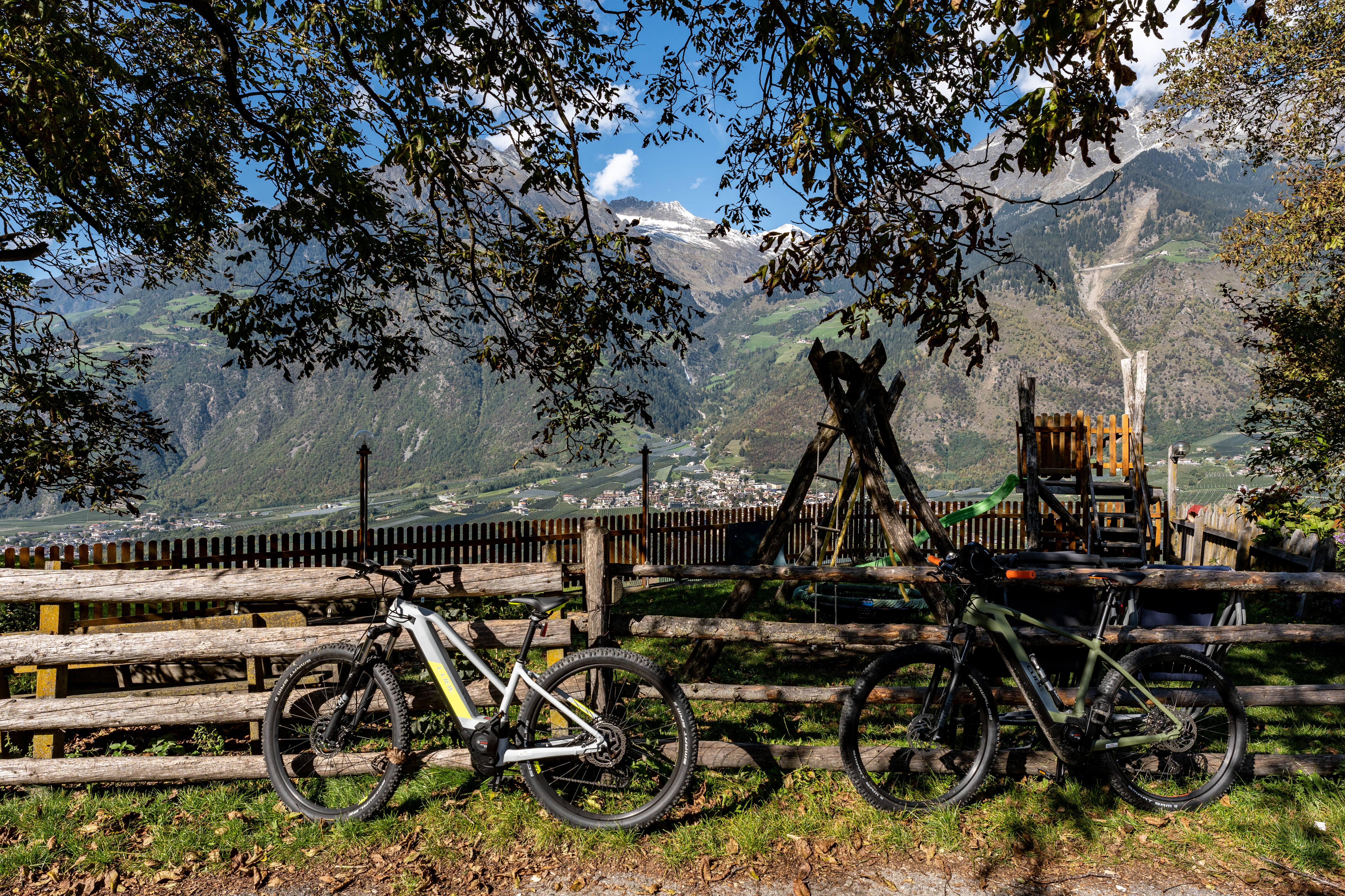 Schon wieder Samstag. Unsere zweite Woche ist angebrochen. Wir beschließen nach dem Aufstehen, dass wir uns nach einem Müsli-Frühstück heute wieder auf unsere frisch geladenen Bikes werfen. Erstes Ziel ist Partschins, mal sehen auf was wir nach den ersten 17 km und knapp einer Stunde Fahrzeit noch Lust haben. Das Wetter ist super, daher wollen wir, nach dem Kartenstudium, uns noch auf das knapp 300m über uns liegende Plateau „Quadrat“ begeben. Nach ca. 5km sind wir oben und kehren in der herrlich gelegenen Jausenstation „Niederhof“ ein. Kühles Blondes und Bauernmakkaroni sowie Schlutzen (gefüllte Ravioli). Wir haben eine wunderbare Sicht auf die Berge. Nach einer Stunde geht´s auf den Rückweg. 23 km mit dem E-Bike werden in knapp etwas über einer Stunde erledigt. Kaffee trinken in der schwindenden Sonne, es zieht sich wie angekündigt langsam zu. Naja, wenigstens stimmt der Wetterbericht. Jetzt um 17:00 beginnt es auch zu regnen. Wir haben alles im Wohnmobil verstaut, dann wird über Nacht nix nass und es kann morgen zügig Richtung Gardasee gestartet werden. Bezahlt haben wir auch schon - 174,-€ für vier Nächte, passt schon für den wirklich schönen Platz.