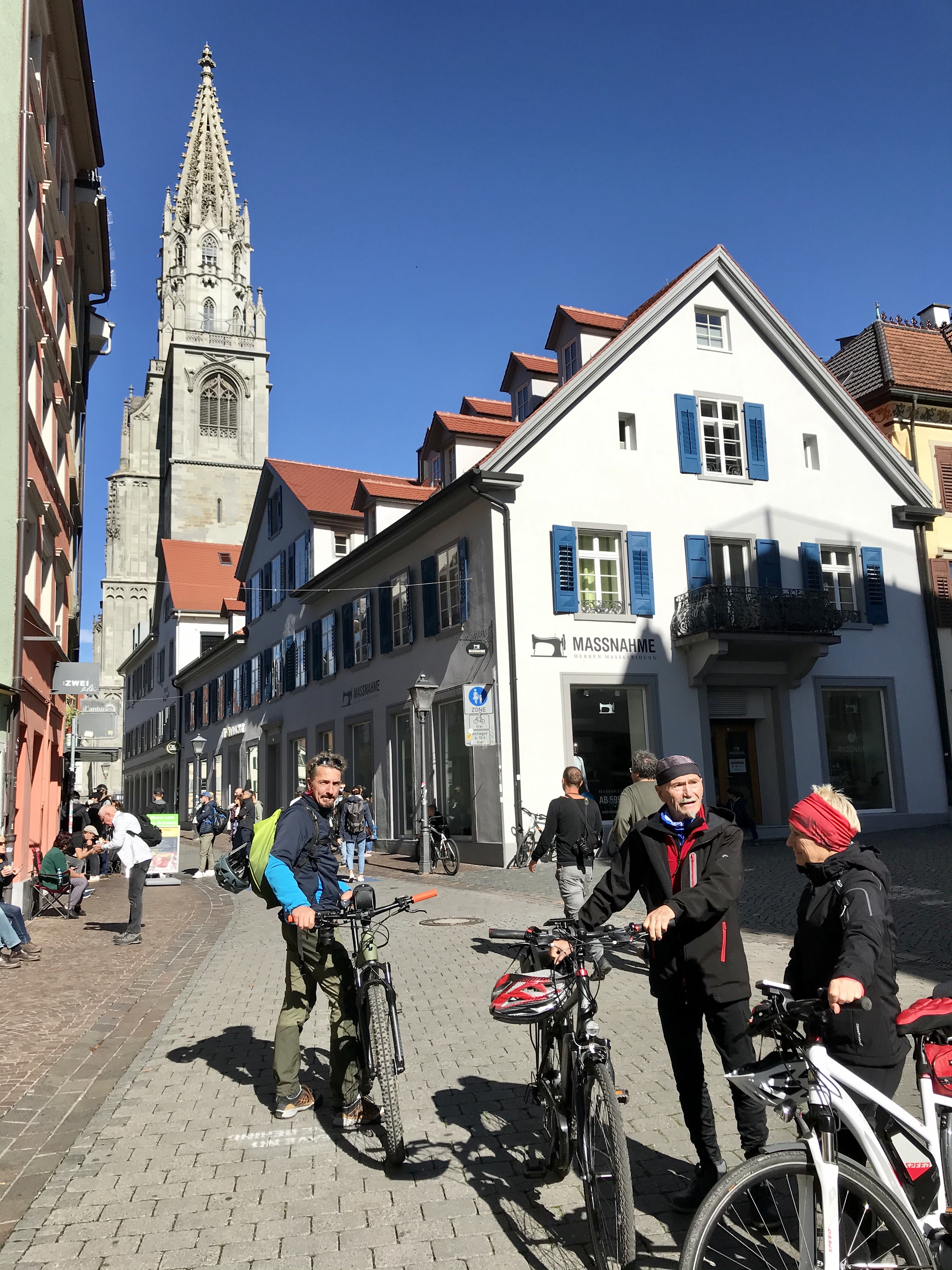 Heute ist die Stadt Konstanz unser Tagesziel. 15 km mit dem Fahrrad sind doch ein Klacks. Peter ´s Fahrrad wurde kurz trocken geföhnt dann war es wieder fit. Toller Radweg von Wallhausen bis Konstanz. Vorbei an der Blumeninsel Mainau. Leider auch hier, obwohl alles im Freien stattfindet, Maskenzwang. Da bekommt ihr leider unser Geld nicht! Schwachsinn. Hier laufen die Leute doch tatsächlich auch auf den Wanderwegen mit Ihrem Unterwerfungssymbol durch die Gegend, ja scheinbar scheint es auch ein IQ-Test zu sein. 80% der Menschen haben ihn wohl verrissen. Naja. Also weiter nach Konstanz. Kurzer Stopp an der Ruppaner Brauerei, Radeln macht ja doch irgendwie durstig. Kleine Fahrt mit dem Rad durch die hübsche Konstanzer Altstadt. Einen schönen Flammkuchen am Münster der Bodenseestadt und ein lokales „Blondes“ dazu. Nochmal ans Wasser - „Seeluft“ schnuppern und wieder zurück an unsere Wohnmobile. Die Sonne scheint, es ist warm, da wollen wir noch bisschen Vitamin D tanken :-). Nach dem Abendessen geht es in die finale Pokerrunde. Heute bei uns. Wir haben zusammen insgesamt 35 € erspielt, die hauen wir dann zu Hause mit den beiden bei einer Wanderung wieder auf den Kopf.