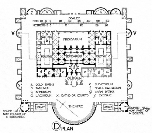 These are the Baths of Caracalla (completed in 216 CE), one of the best surviving examples of roman baths. These baths display the Romans ability to create breath-taking interior space using arches, domes, vaults, and buttresses. The largest baths typically included a huge complex, build symmetrically along side each other, with pools, cold and hot rooms, fountains, libraries, under-floor heating, and sometimes inner-wall heating. The exteriors were usually quite plain but the inside was always lavish with columns, marble, statues and mosaics.