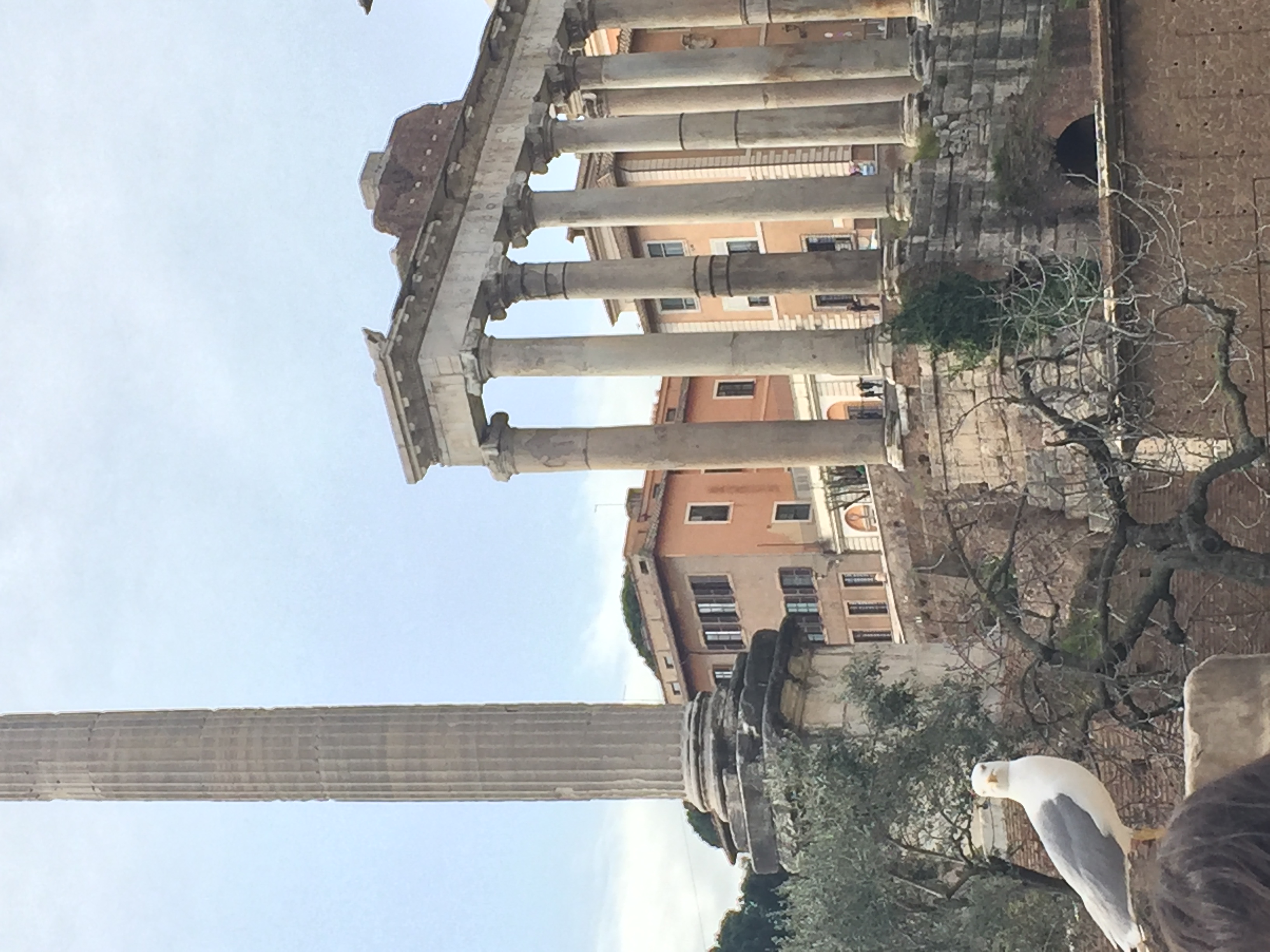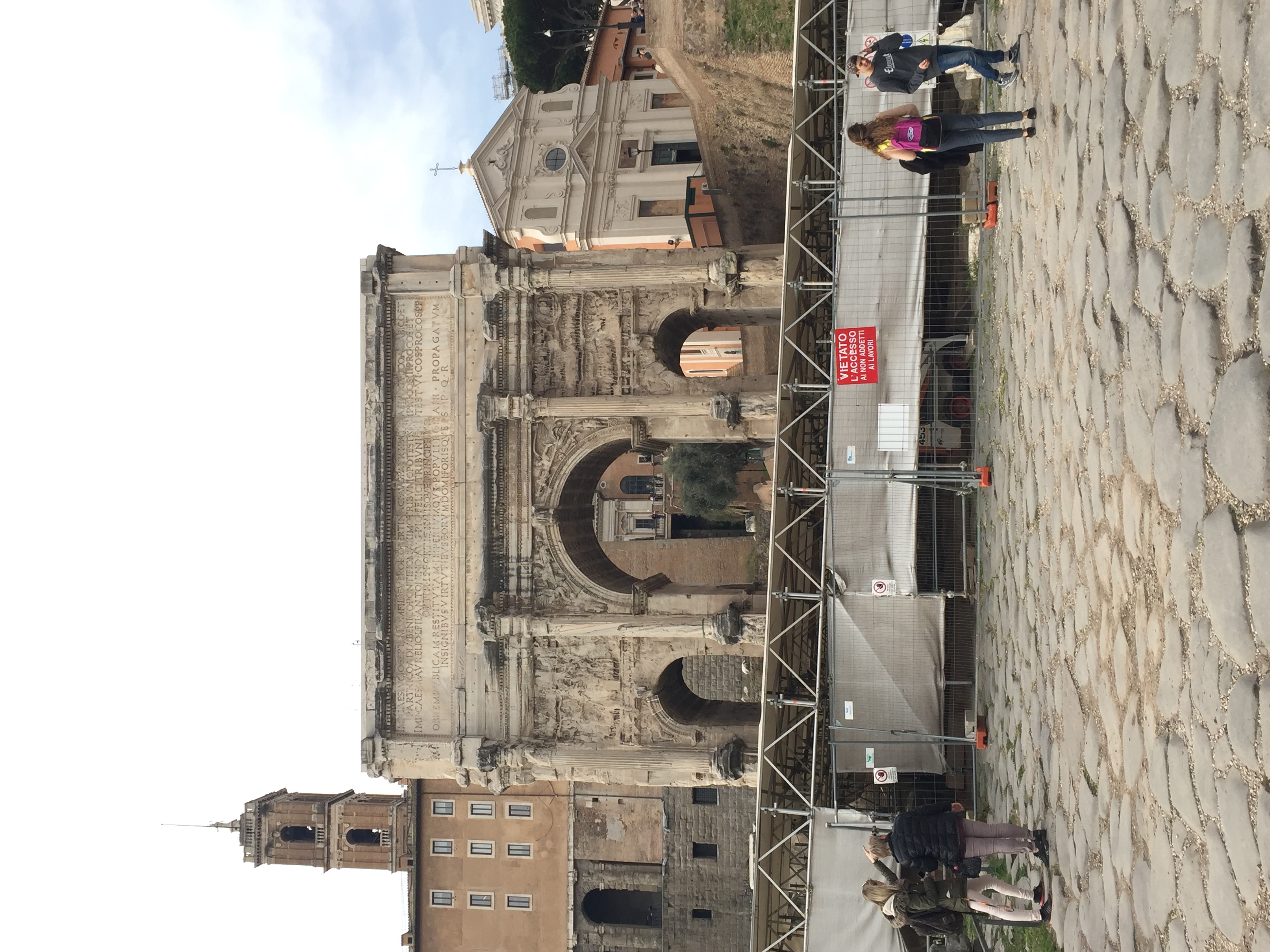 Within the Roman Forum there are many Temples. One of the most prominent ones is the Temple of Antoninus and Faustina (pictured in the background) which was dedicated by Antoninus Pius in AD 41 to his deified wife Faustina. This is the most prominent temples because it is one of the best preserved temples. With the Baroque-style top-knot, it is also one of the oddest temples because of ideas like the carvings of griffins along the side frieze.