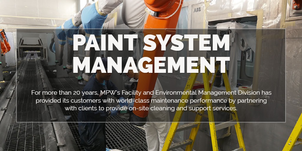 MPW provides comprehensive cleaning and management of paint booth systems including booth cleaning, process labor support, fixture cleaning, airflow analysis and corrective measures, light maintenance, and commodity management.
