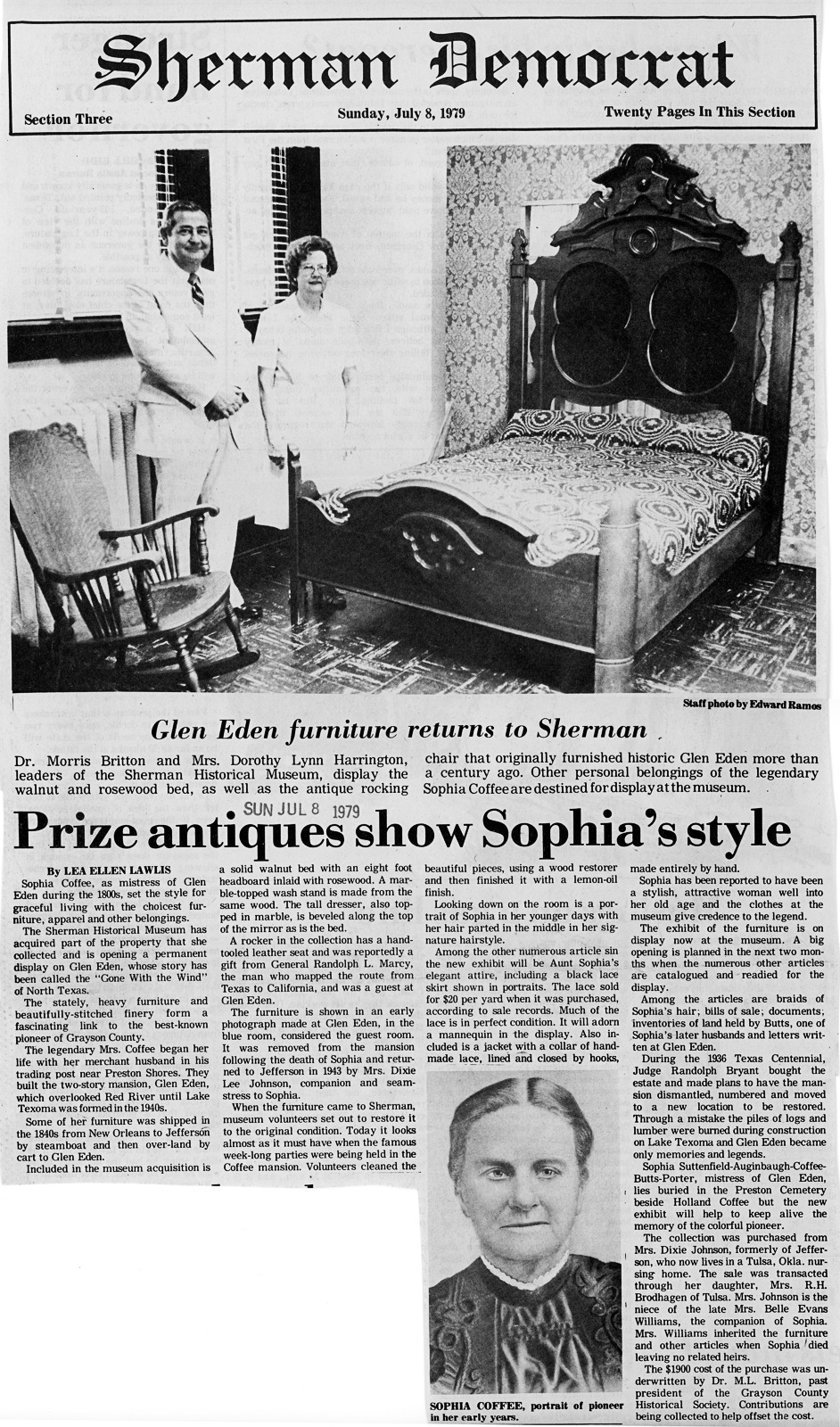 Photograph of Sophia Coffee that was on display at the Sherman Museum in 1979. Also pictured is a marble top dresser that was part of the furniture at Glen Eden located north of Pottsboro. The two story mansion overlooked the Red River until Lake Texoma was built in the 1940's