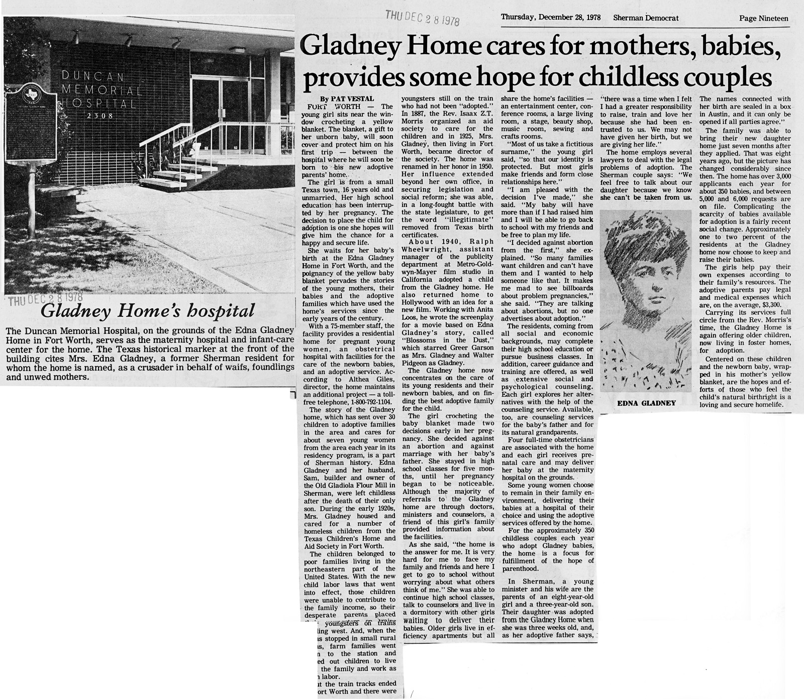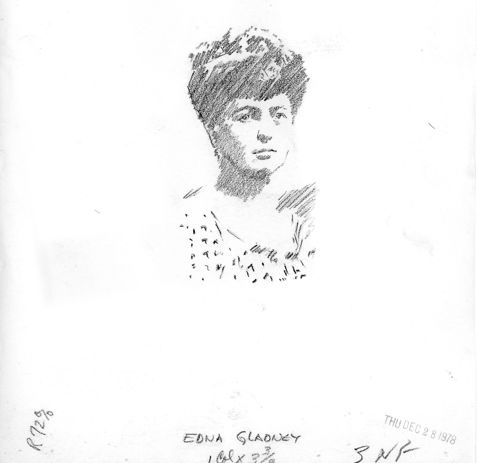 Hand drawn sketch of Edna Gladney. Gladney was heavily involved in the care of foster children. Her influence extended beyond her own office in securing legislation and social reform; she was able, in a long fought battle with the state legislature to get the word "illegitimate" removed from Texas birth certificates.