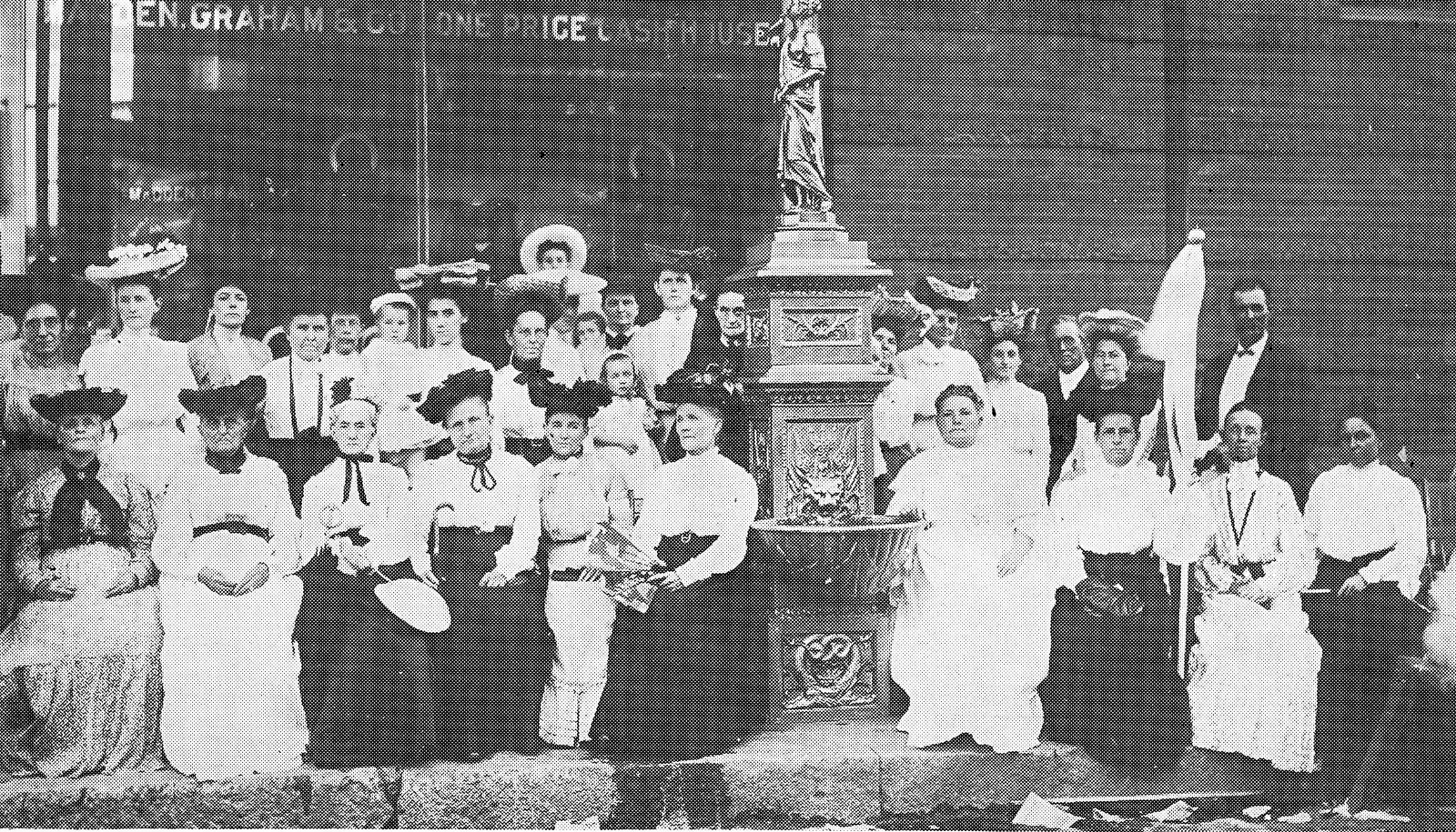 Mary Elizabeth Lease, bottom right, and Sarah Cooke Acheson Were both involved in the Denison Temperance Union, pictured at top. The drinking fountain on the bottom left was erected in memory of Sarah Cooke Acheson who was state president of the Women's Christian Temperance Union.