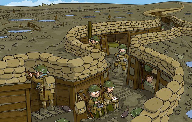 Long ditches were dug in the ground. Soldiers lived in these trenches and sometimes climbed out to attack.