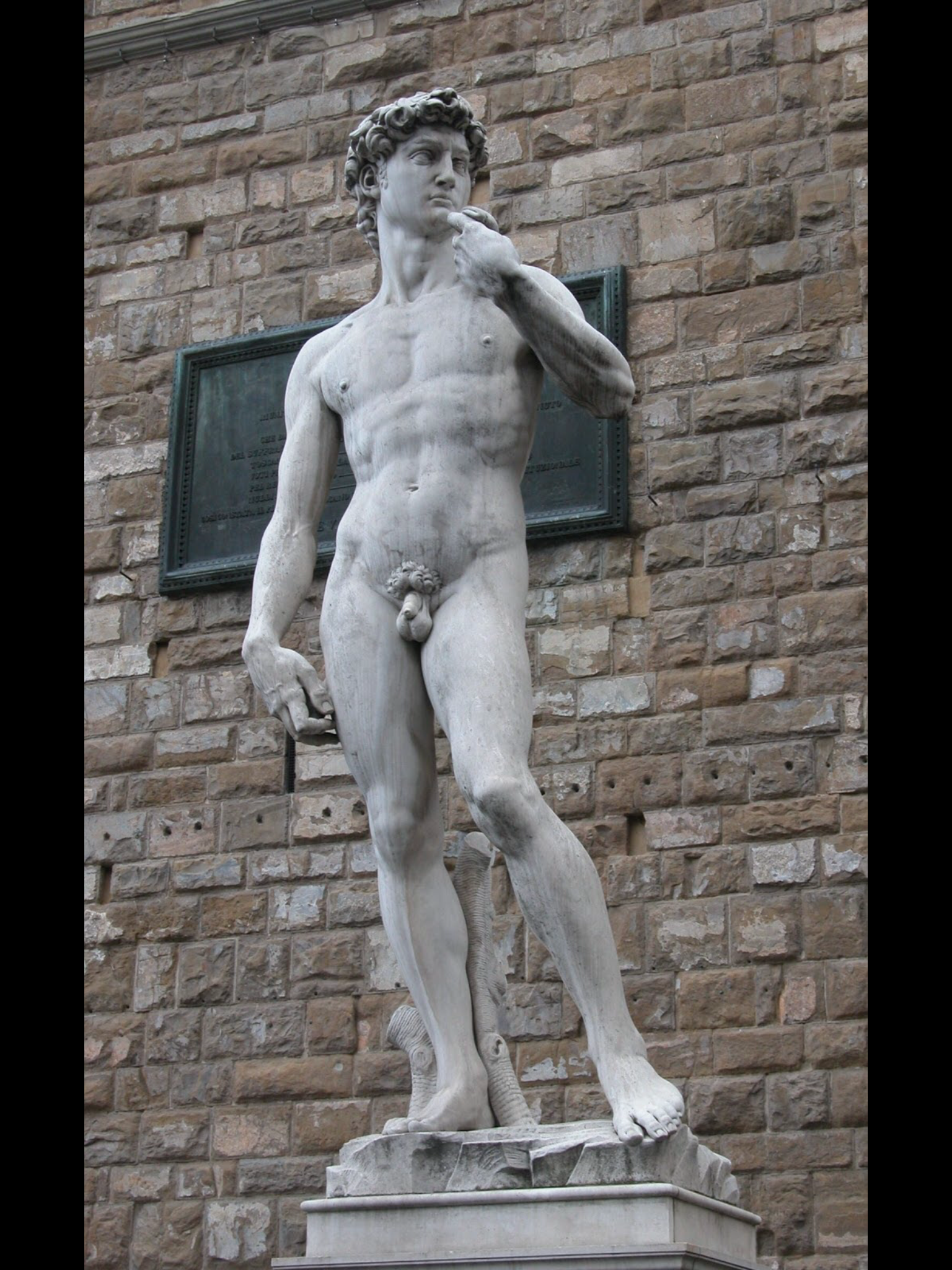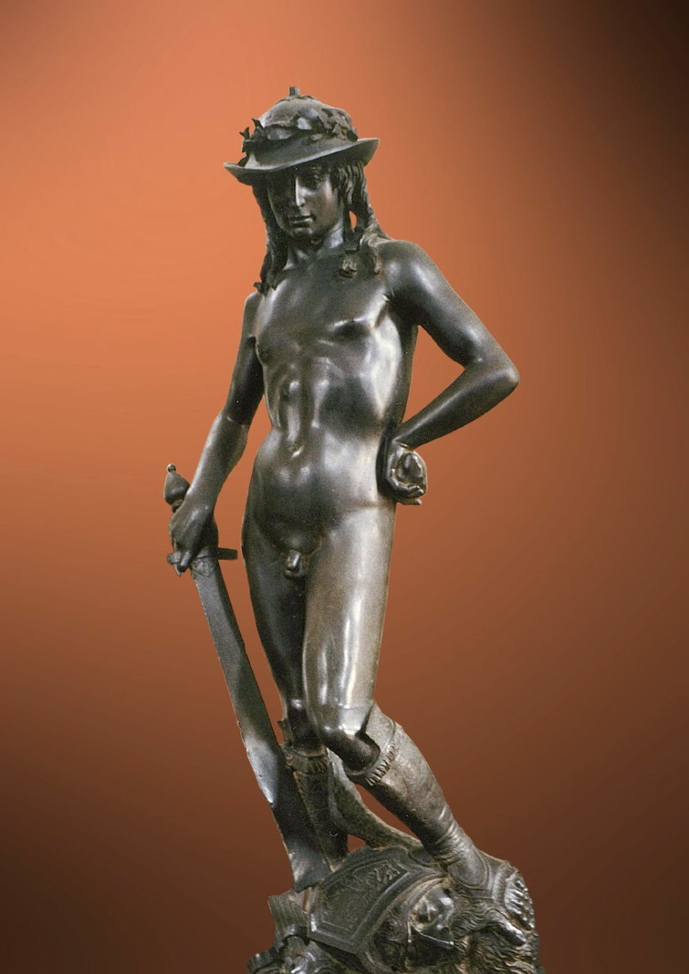 Бронзовая скульптура Давида, приходиться на рассвет карьеры Донателло, 1440 год. Можно считать, что именно с нее и начинается Возрождение в скульптуре. Впервые мастер позволил себе изваять полностью обнаженное тело, как это делали античные скульпторы. Более того, Донателло сделал своего Давида антропоморфным. И форма, и поза намекают, не на кровопролитное сражение с Голиафом, чья голова у героя в ногах, а скорее, на чувственность утонченного ангела.