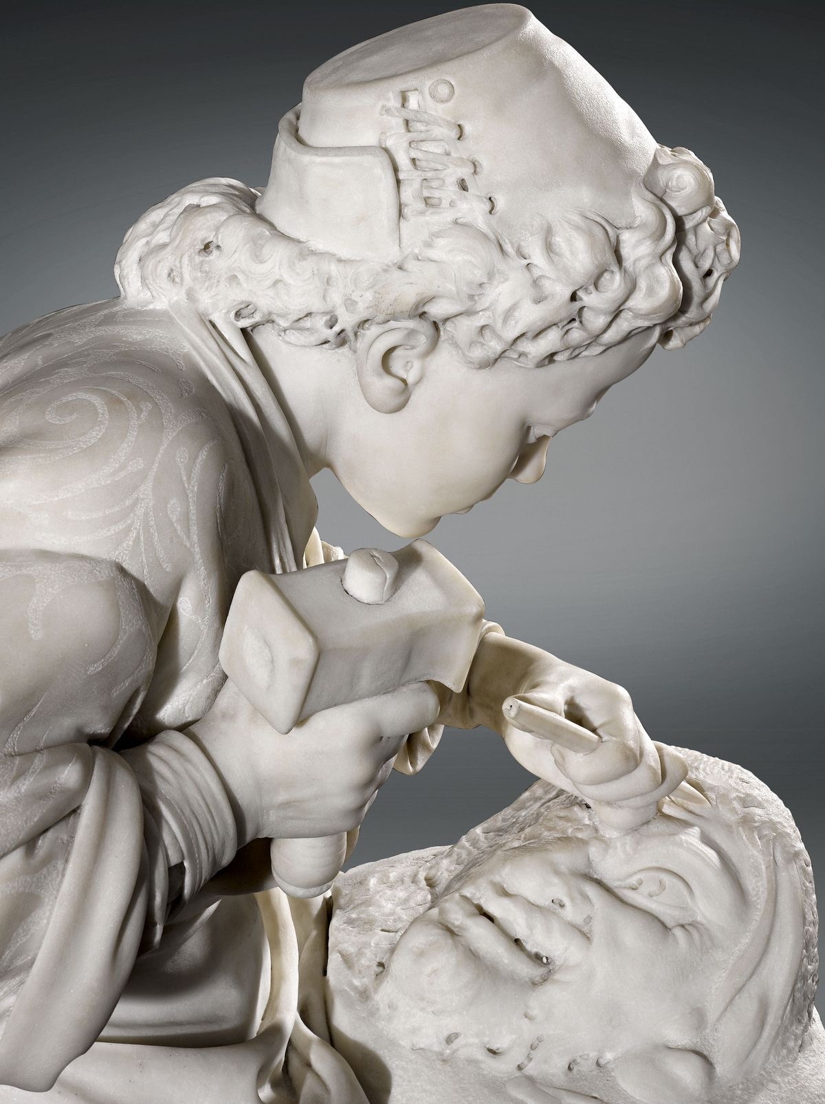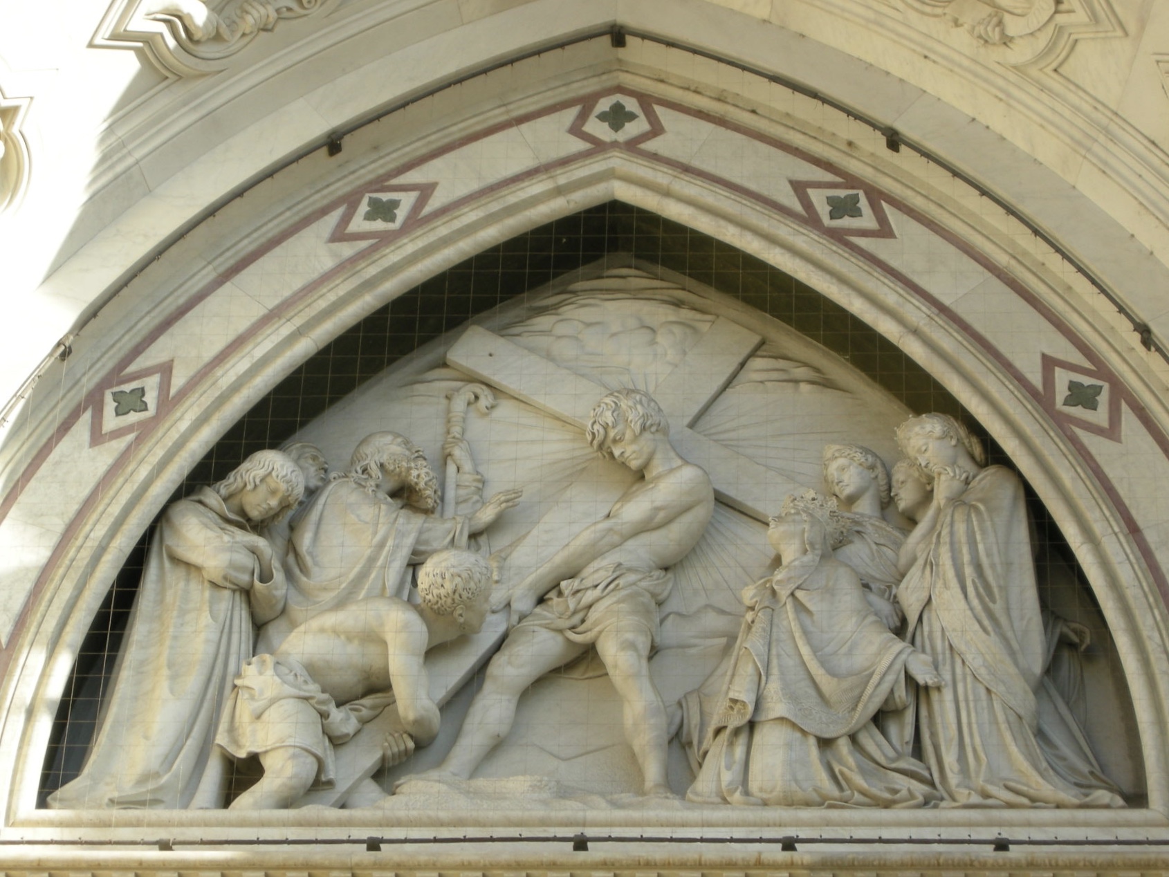 Эту историю великие флорентийские скульпторы XIX века отобразили в мраморном рельефе над вратами храма. Тито Саррокки решил выполнить Святую Елену нежной и невинной, как ангела. Часто он разговаривал с ней, пока шлифовал ее мраморное лицо. Так же, как Пигмалион говорил со своей Галатеей.