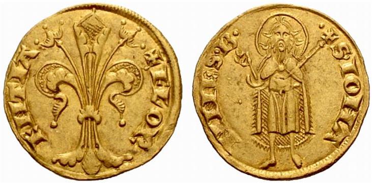 В 1252 году, во Флоренции была выпущена первая золотая монета Европы. «Флорин» был 2 см шириной, и весом 3,53 грамма, в 24 карата. Это стало возможным вследствие притока в город достаточного количества сырья. Флорентийские купцы торговали не только во всей Европе и Азии, но и на севере Африки, где с ними расплачивались золотым суданским песком. На аверсе флорина изображался символ Флоренции - Ирис, а на реверсе - покровитель города Иоанн Креститель. Он соответствовал 20 сольдо, или 240 денариям.