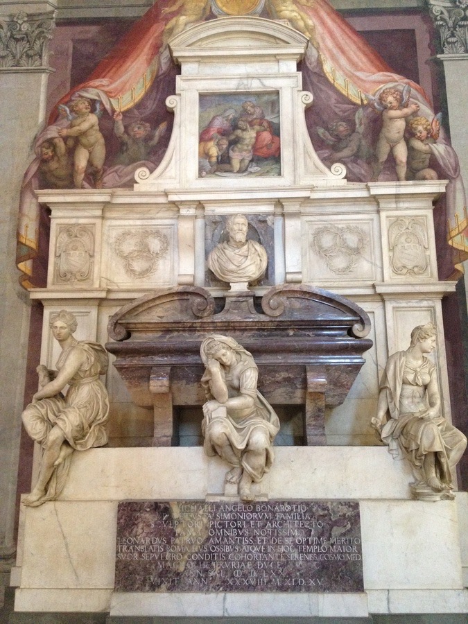 Первыми, при входе в храм, являются гробницы, справа — Микеланджело Буонаротти «гения от искусства», и слева — Галилео Галилея «гения от науки». Умер Микеланджело в возрасте 88 лет, в Риме, работая над скульптурой снятого с креста Иисуса. Папа римский Пий IV категорически хотел похоронить его в Ватикане, в базилике Святого Петра. Но племянник скульптора, Леонардо, выкрал тело и тайно перевез его во Флоренцию.
