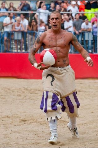 Корни флорентийской «Игры в мяч» уходят к античной игре harpastum — «забирать силой». Она проводилась на площади Санта Кроче с незапамятных времен, в период карнавала. А сейчас — в июне, в день покровителя города Иоанна Крестителя. Игра длиться 50 минут, и в ней участвуют четыре команды (попарно - на выбывание). Каждая представляет свой исторический район Флоренции: зеленые — Сан Джованни; красные — Санта Мария Новелла; синие — Санта Кроче; белые — Санто Спирито. В командах по 27 игроков. Цель игры — забросить кожаный, наполненный воздухом, мяч в ворота противника.