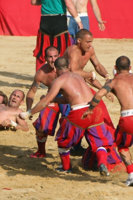 Особенность игры в том, что правила допускают физическую схватку между игроками. Поэтому участники одеты лишь в панталоны исторического покроя. Голый торс и бритые головы лишают возможности противника за что-либо ухватиться, чтобы свалить игрока с ног. Призом выигравшей команде является белая корова. Мясом именно этой породы Chianina приезжают лакомится во Флоренцию гурманы со всего мира — Bistecca alla Fiorentina.