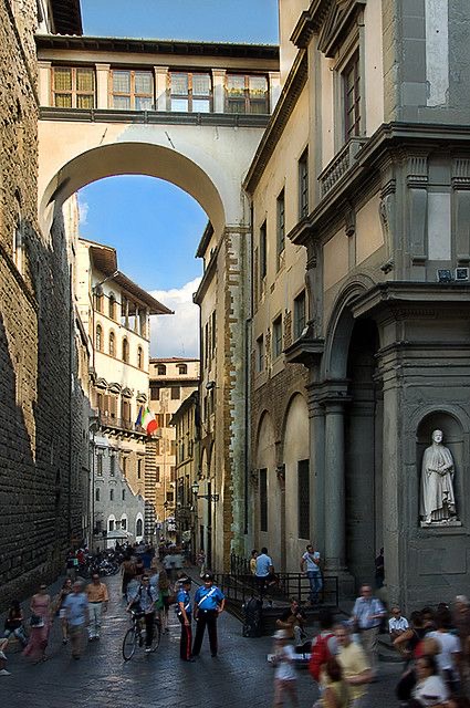 Первым неординарным действием молодого герцога Козимо был выбор места жительства. Чтобы постоянно держать руку на пульсе города, он решил жить не в родовом гнезде Медичи, а во Дворце Правительства. И все бы ничего, но после его женитьбы на испанской принцессе, детишки во Дворце Синьории начали рождаться почти каждый год. И несмотря на бесконечные достройки здания, жить под одной крышей с администрацией города стало тесно. Самым простым решением было разъехаться. В 1560 году Козимо поручает Джорджо Вазари построить для правительственных офисов новое здание. На итальянском «офис» — uffizi. Трехэтажное «П» образное здание Уффици было соединено подвесным переходом с Дворцом Синьории. Козимо достаточно было выйдя из спальни жены, пройти несколько метров по переходу высоко над землей — и он уже на работе!