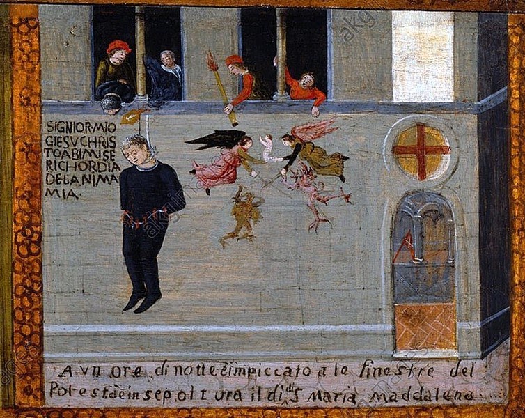 Все утро они провозились с осужденным на смерть через повешение. Сначало приговор надо было исполнить во дворе Барджелло. Затем тело перенести, и вывесить за окном зала суда, пока глашатай, драл горло, зачитывая вину приговоренного: «...Просил у Мадонны помощи выиграть в кости. Но проигрался. Был одержим гневом, и бросил в икону Богоматери лошадиное дерьмо...»