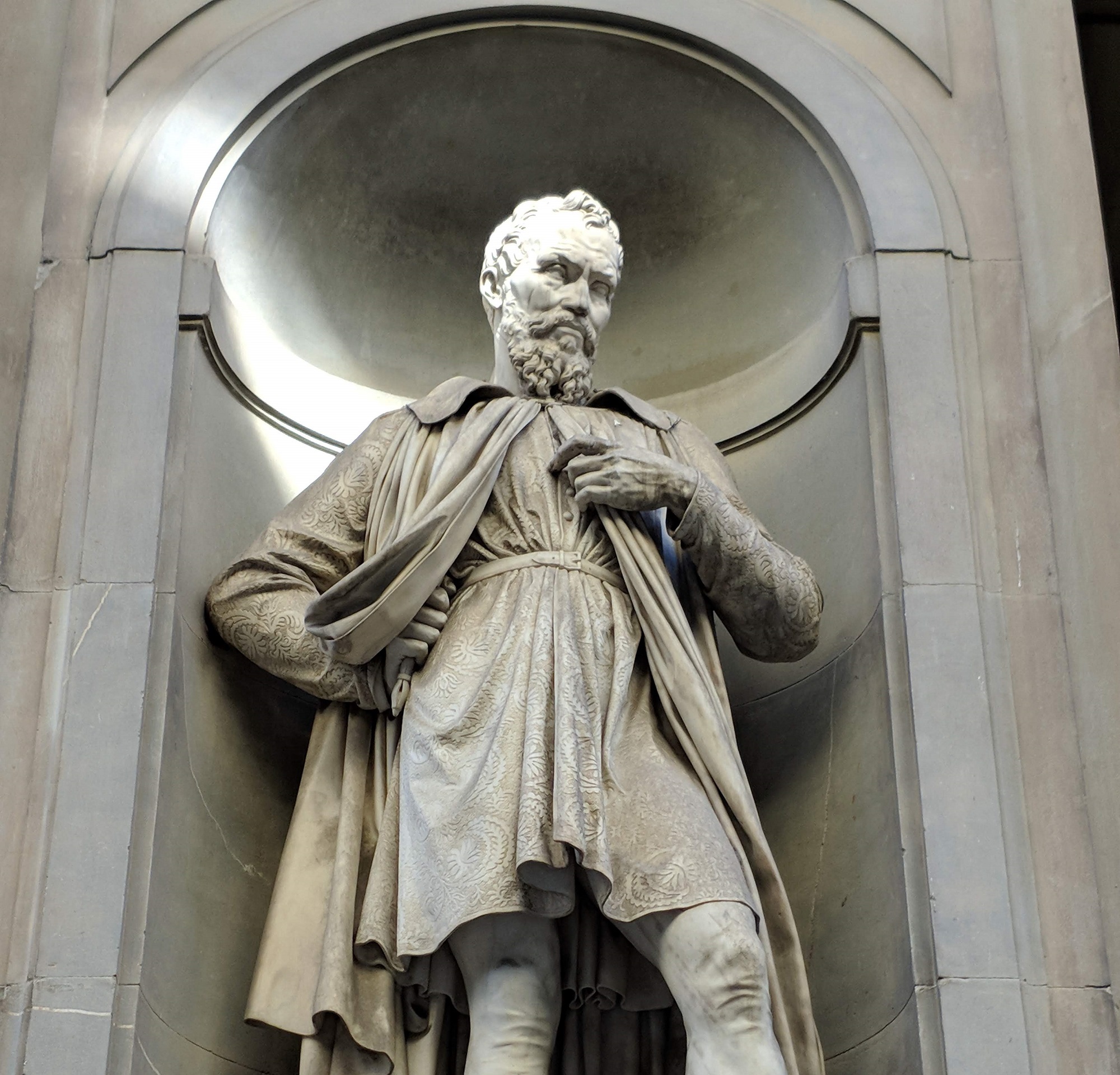 В одной из ниш портиков Уффици стоит скульптура бенедиктинского монаха, реформатора музыки — Гвидо Аретинского. В 1025 году в Кафедральном соборе тосканского городка Ареццо, он руководил монашеским хором. Как же он страшно расстраивался, когда не мог объединить голоса в единое звучание.