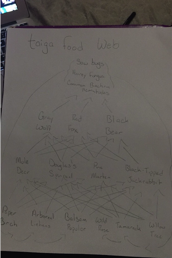Symbiosis (Mutualism): The tree moss that grows on the trees in the taiga helps both the trees and the moss by protecting the tree from the outside world and it provides the moss a place to live.
