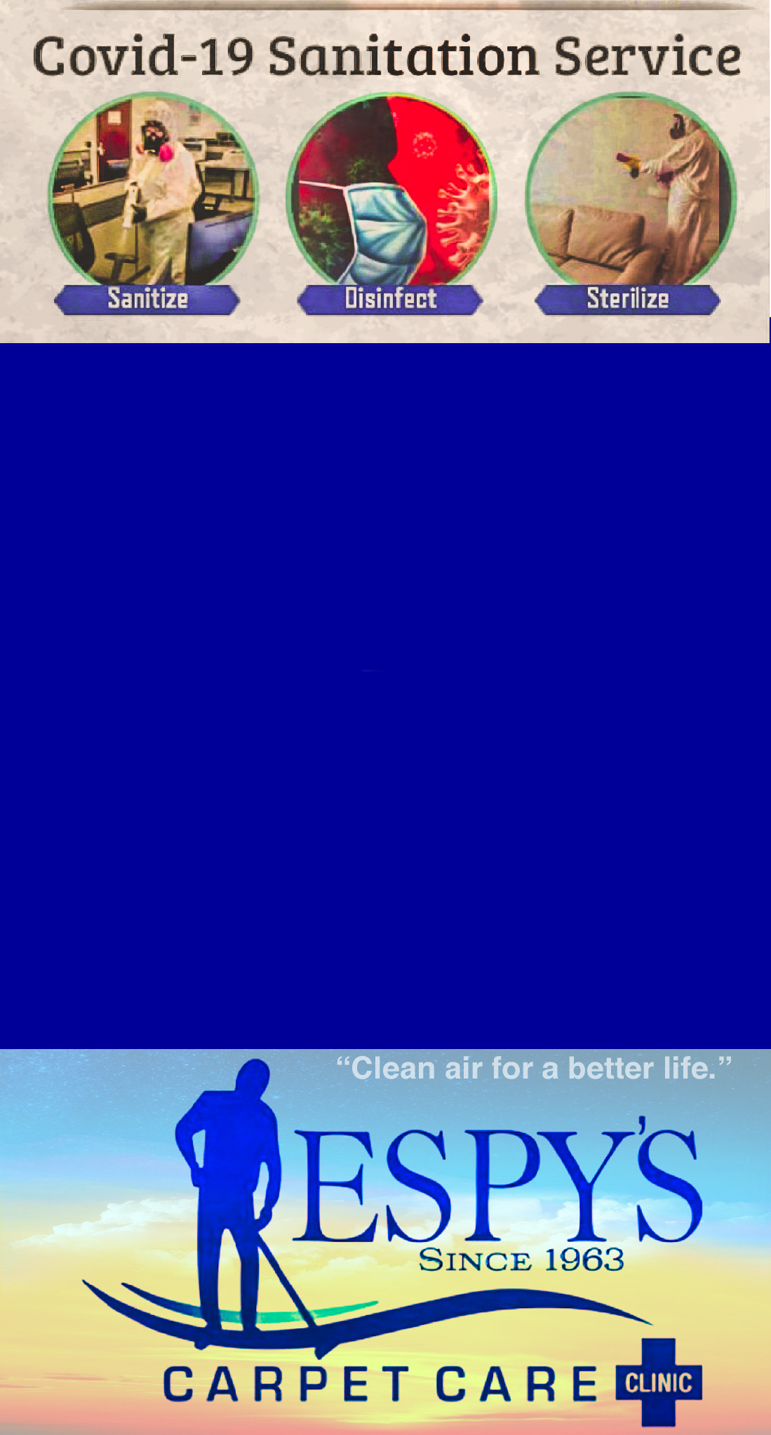 Espy’s biochemical products & industrial strength equipment will sanitize the fibers, surfaces, ducts & vents throughout your home. Our solutions are PH neutral on your furniture & Rugs, non-toxic for your family & pets... yet deadly for 99% of bacteria, viruses, mold, allergens, even bed bugs & dust mites. Ask about our mattress steam extraction cleaning services.