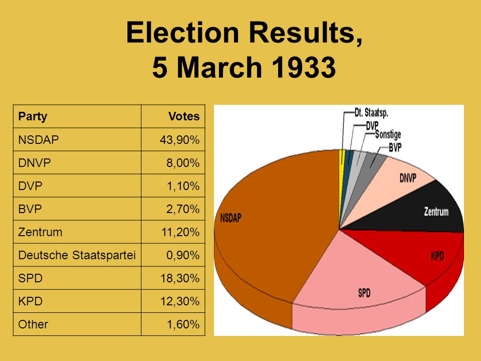In the aftermath of the fire, Hitler had been allowed to use Article 48 for the first time. But to become a Dictator, he needed to be able to use it without Hindenburg’s permission. Hitler used the street violence as an excuse for the Enabling Act. This needed 75% of the Reichstag to vote for it. 30% were already Nazi’s. The SA intimidated, threatened and bribed a huge number of politicians. The act gave Hitler most of Hindenburg's power as he could make laws without the Reichstag
