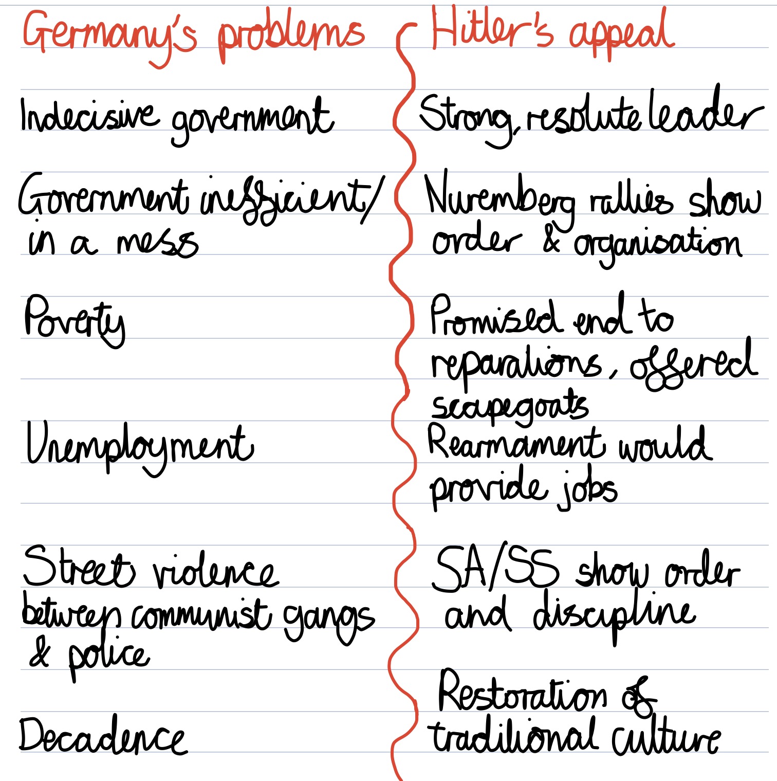 Hitler realised that violent methods wouldn't get him into power, would have to rise up through constitution. This was because Stresemann’s economic policies were starting to make Germany more stable – people didn’t want violent extremists. So, Hitler decided to reorganise the party.